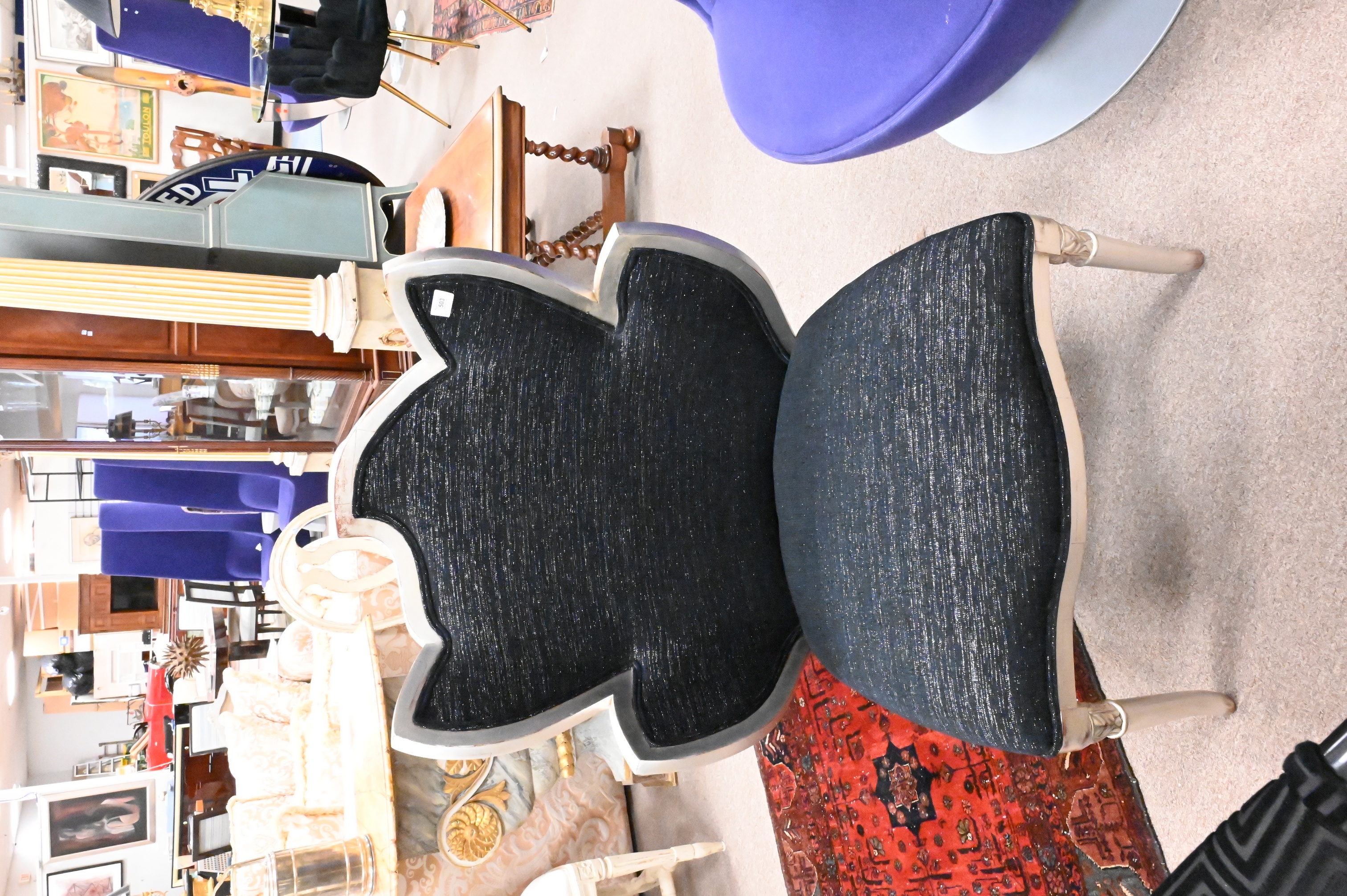 in custom black upholstery with shaped leaf form back over silver painted wood frame and flared legs, label on underside