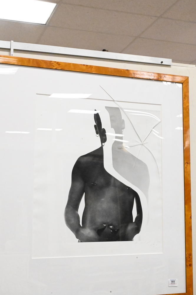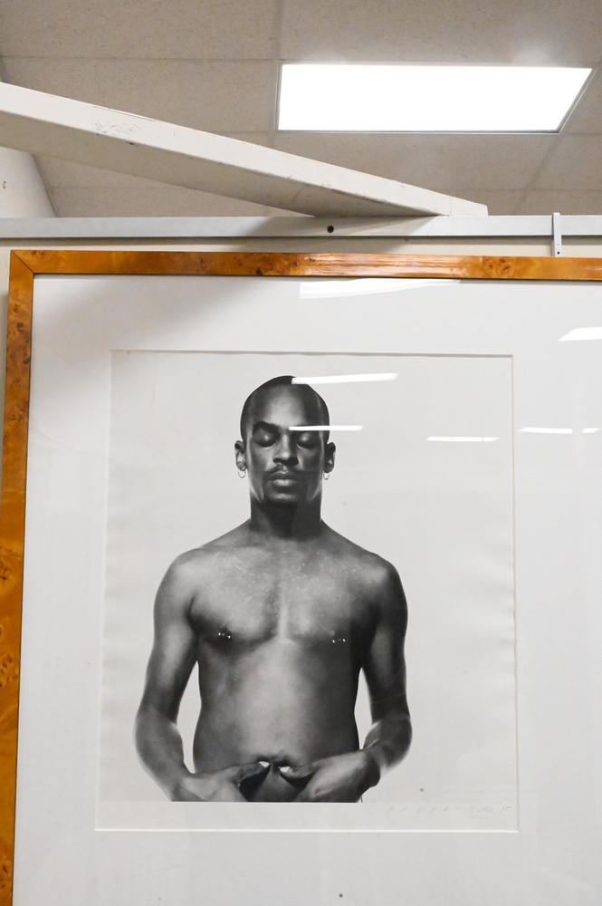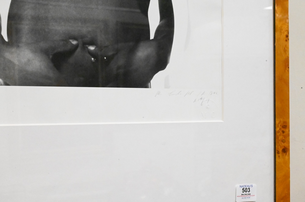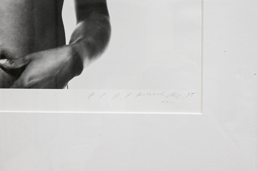 Michel Comte (Swiss, born 1954), two black and white photographs framed together, depicting shirtless man, each pencil signed lower right “Michel Comte”, bearing artists seal, each sight size 22 1/2″ x 19 1/2″.