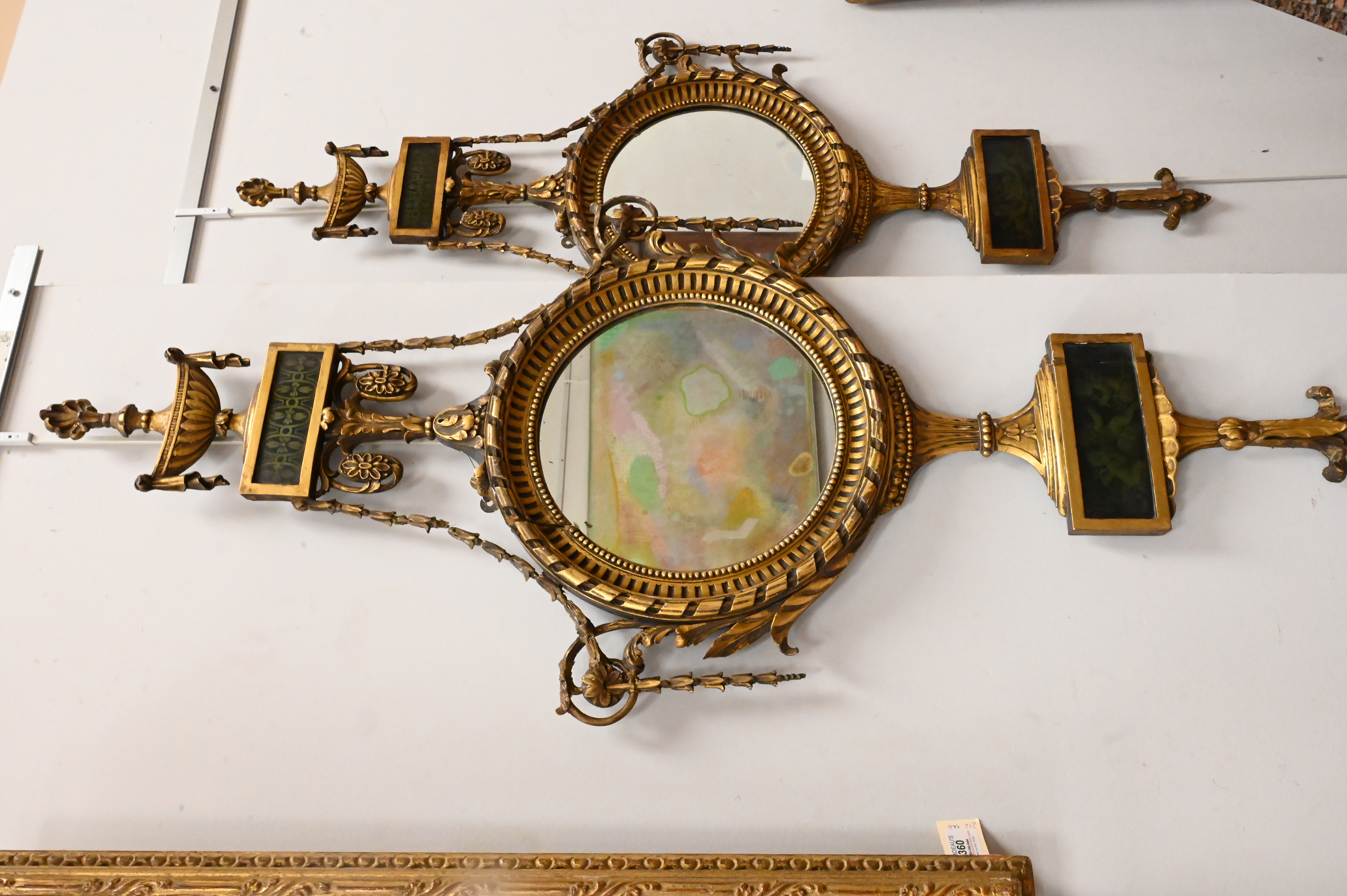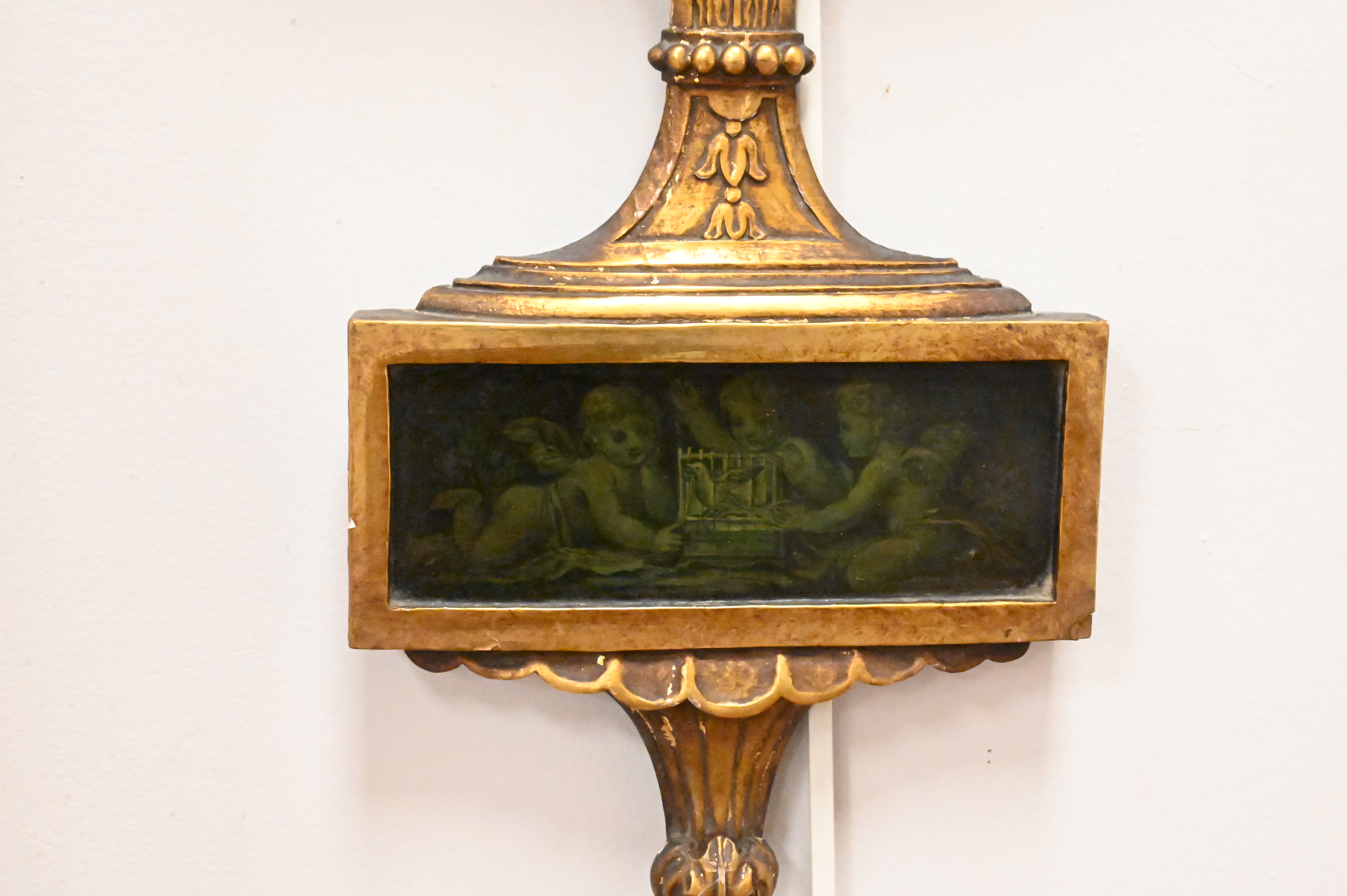 each having urn-form cresting draped with husk swags above a circular mirror plate and a further painted panel depicting putti figures, bellflower and foliate adornments, 19th century