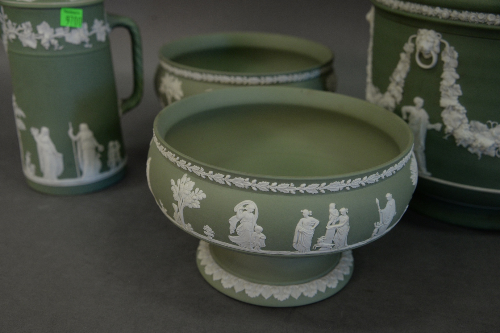 Seven Piece Group of Wedgwood Jasperware, moss green color, to include two compotes, bowl, pot, teapot, pitcher, along with an urn, urn height 11 3/4 inches. Provenance: Estate of James Wadhams