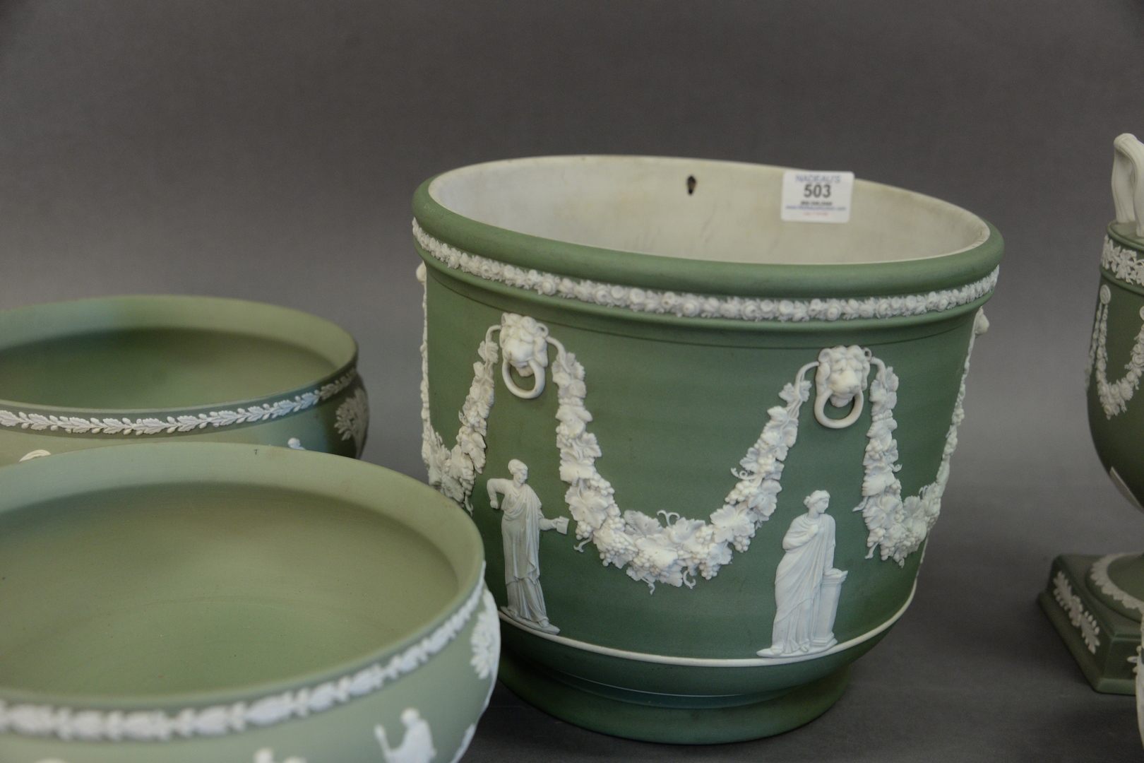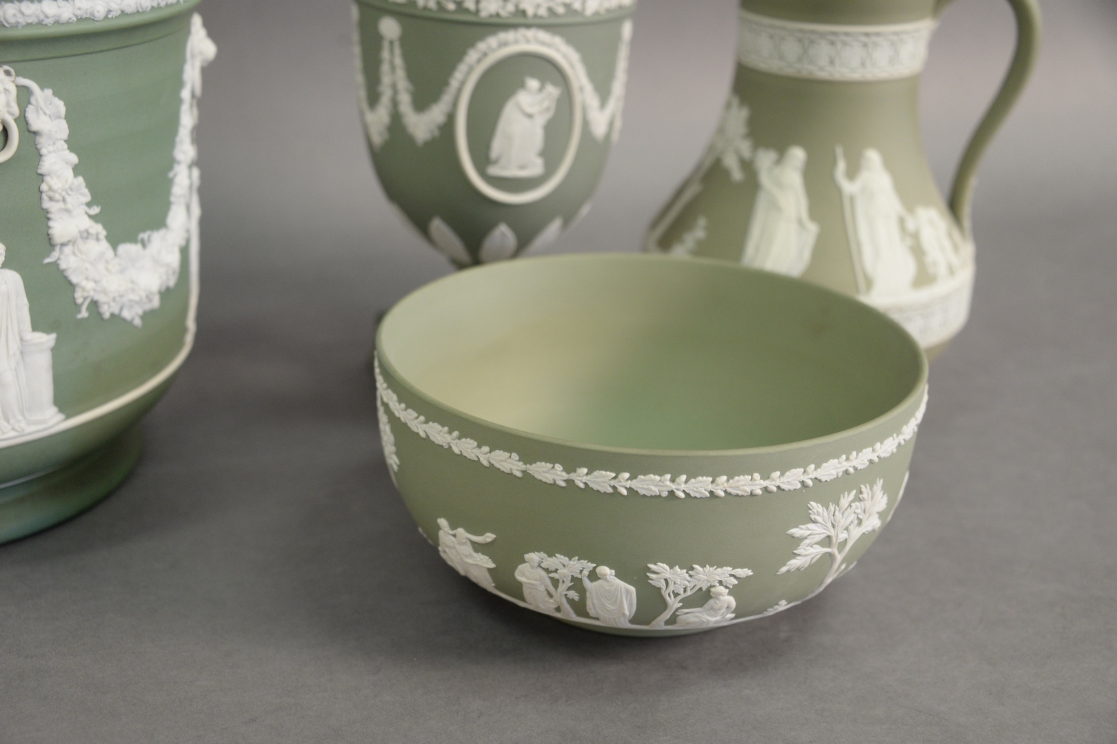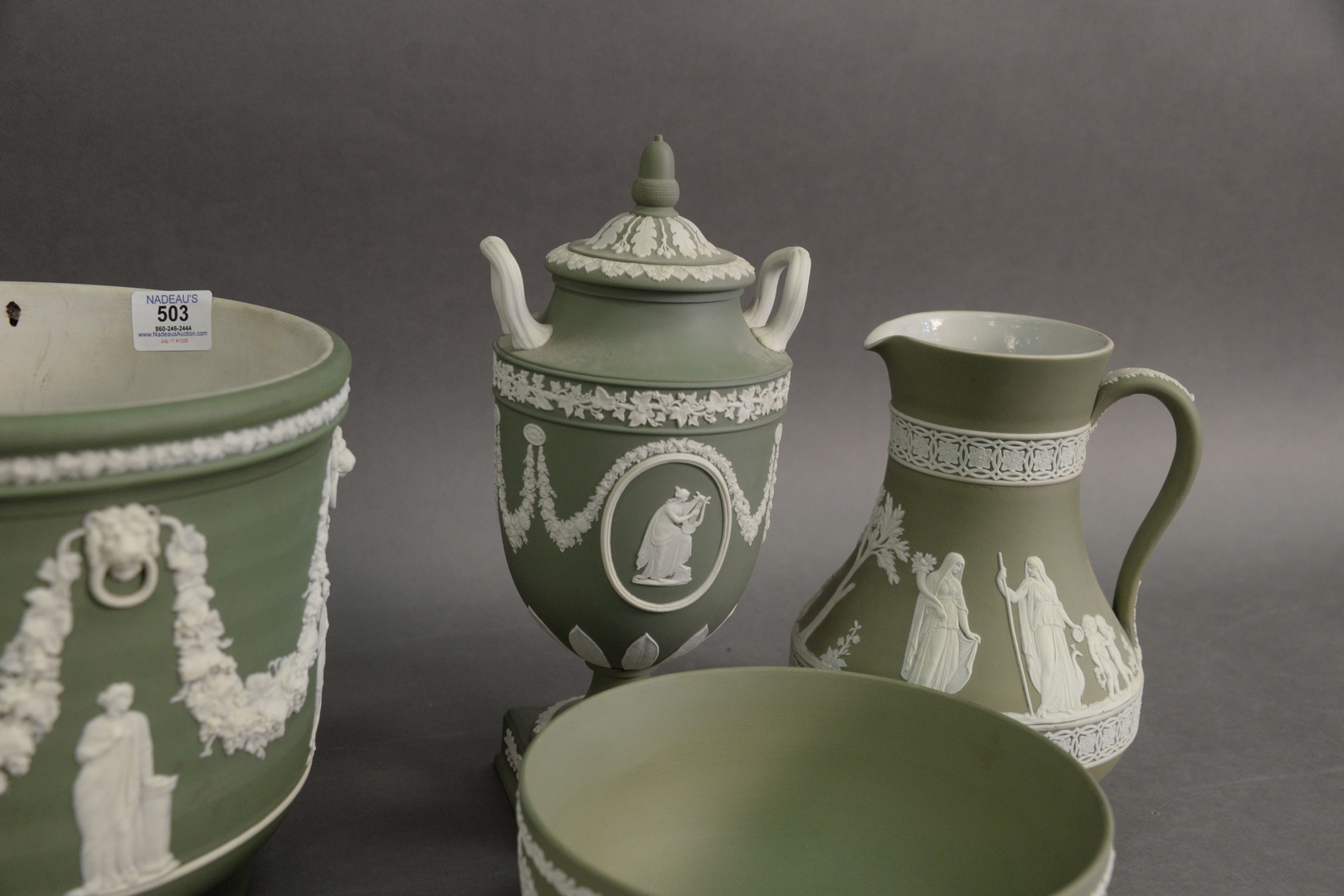 Lot 503: Seven Piece Group of Wedgwood Jasperware, moss green color, to include two compotes, bowl, pot, teapot, pitcher, along with an urn, urn height 11 3/4 inches. Provenance: Estate of James Wadhams
