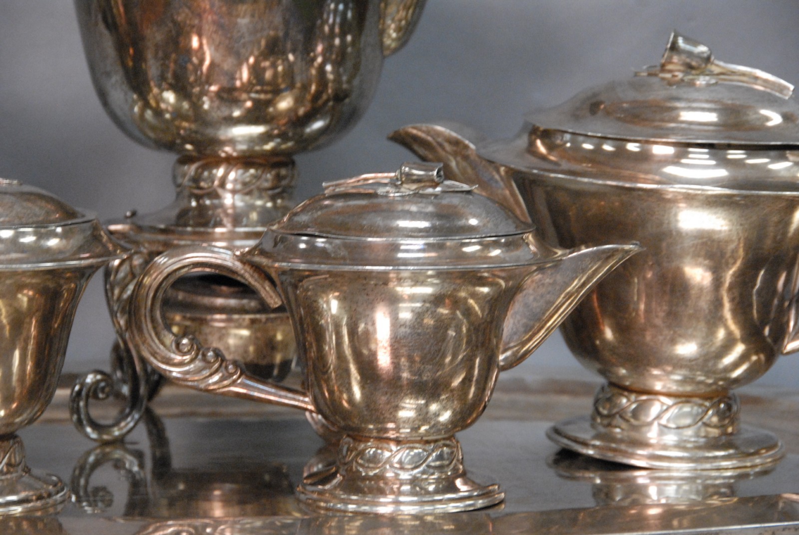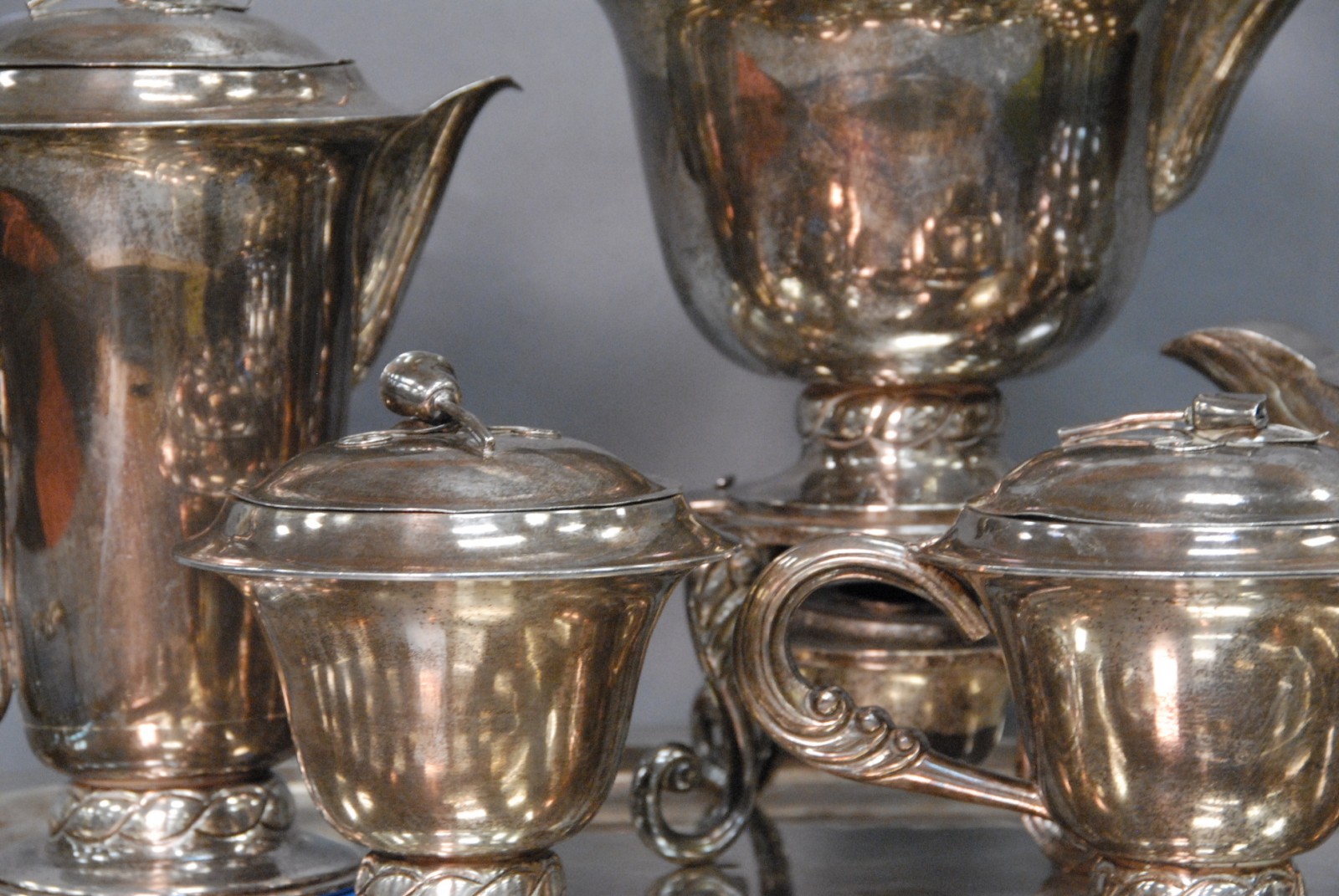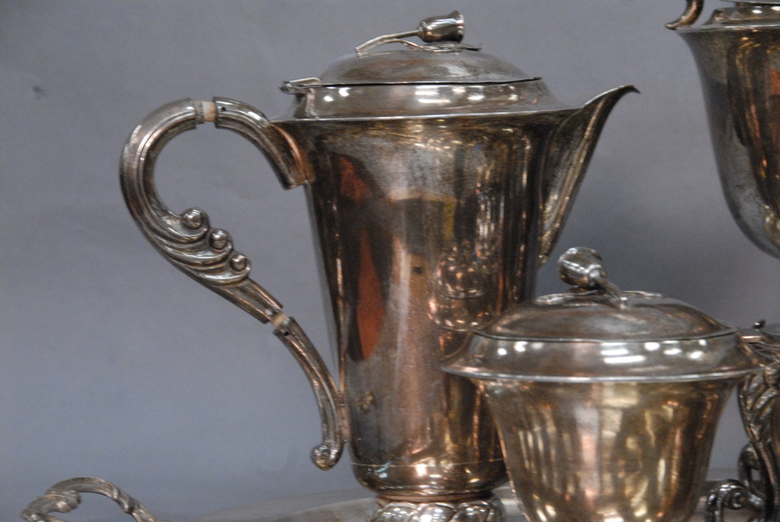Six piece sterling silver tea and coffee set to include tilting pot, coffee pot, teapot, covered creamer, covered sugar and two handled tray marked .925 Mexico Jimenes.
