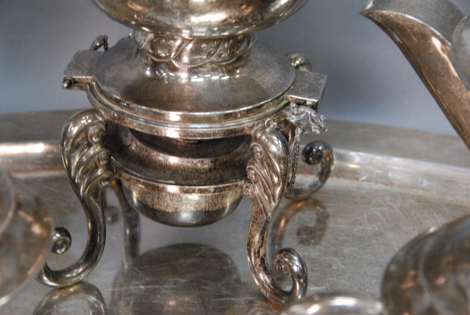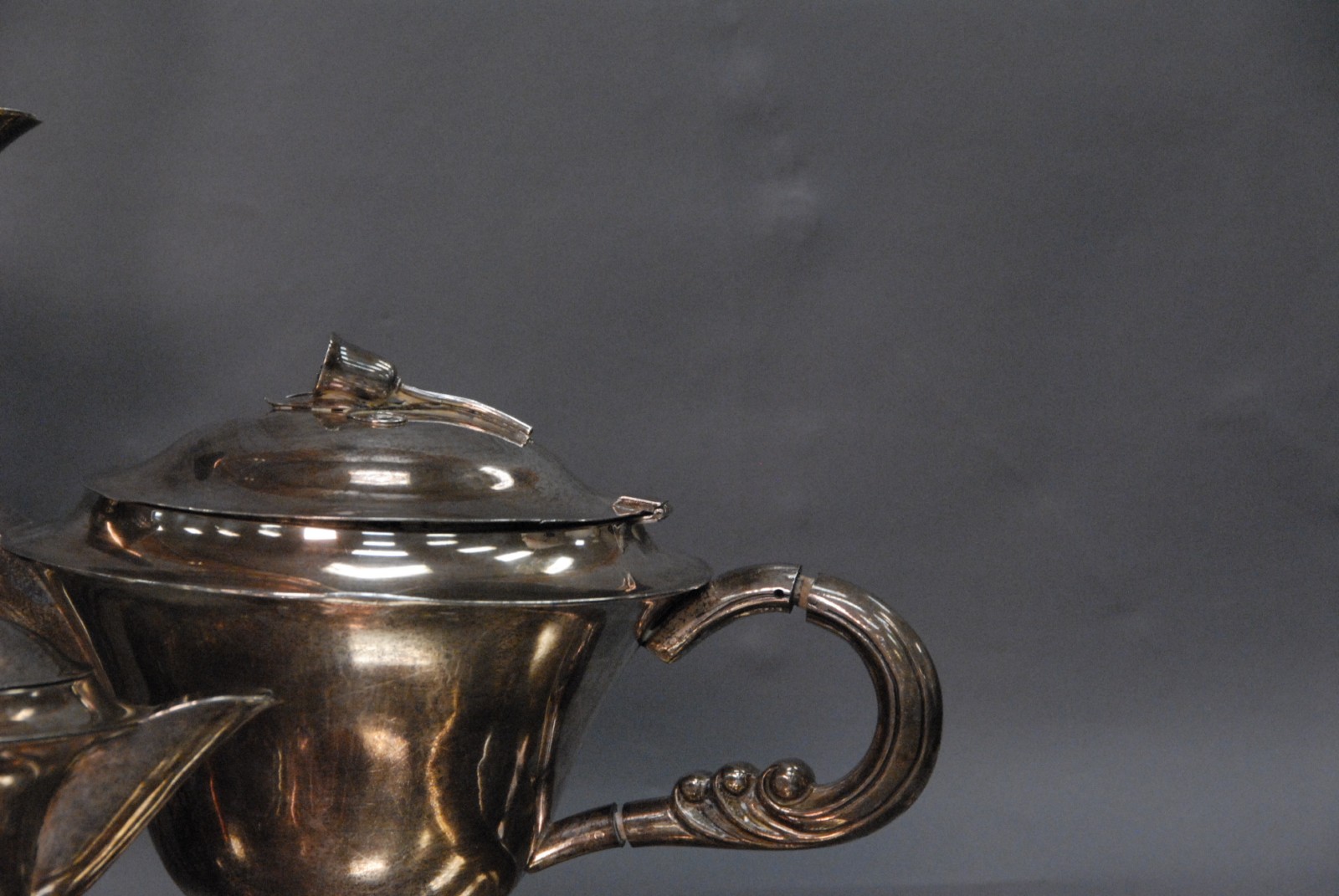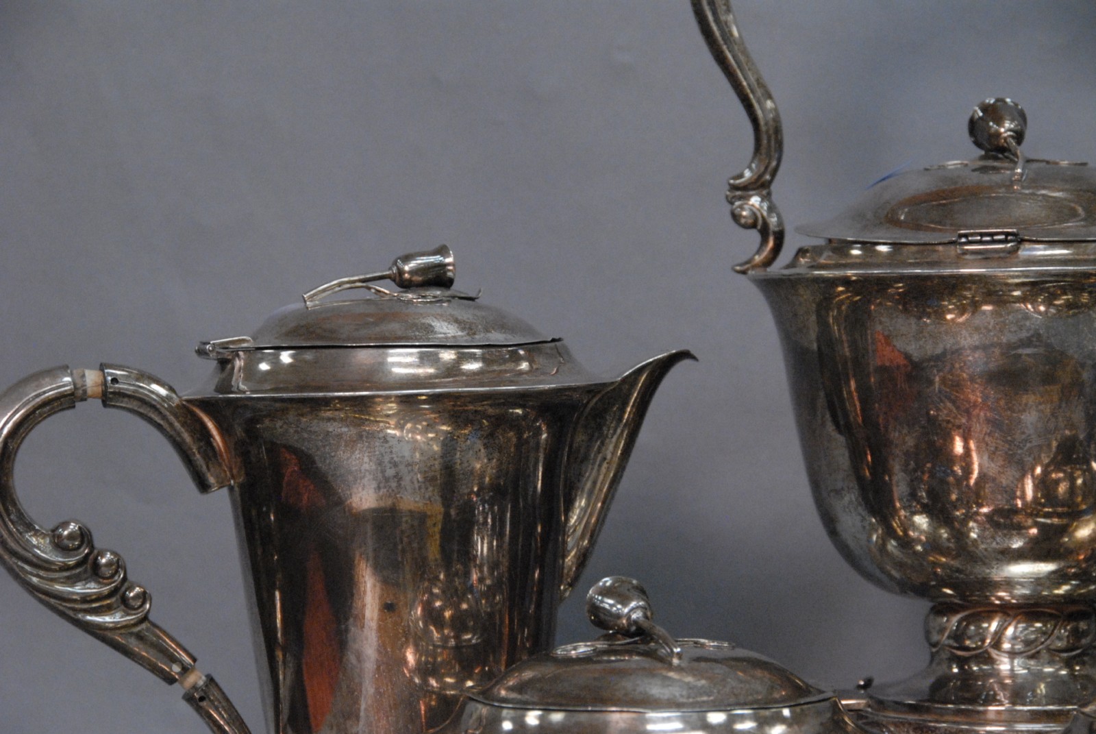Six piece sterling silver tea and coffee set to include tilting pot, coffee pot, teapot, covered creamer, covered sugar and two handled tray marked .925 Mexico Jimenes.
