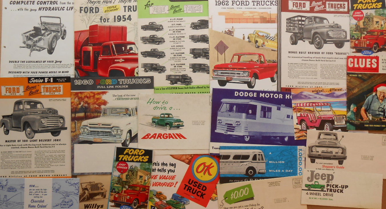 Lot 504: 1940’s-1960’s truck broc – Ford, Dodge, Chevrolet, Willys Jeep, etc – 32 large and 9 small items