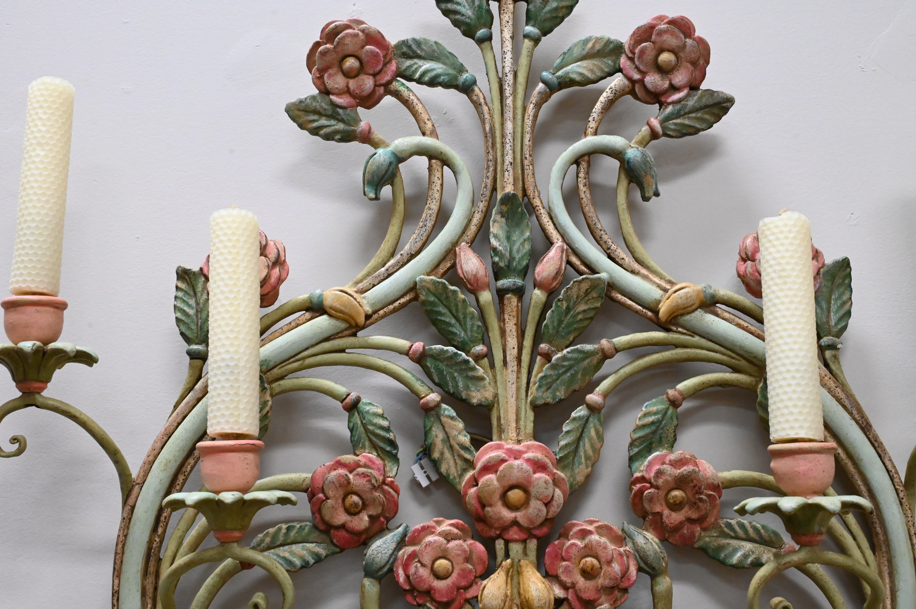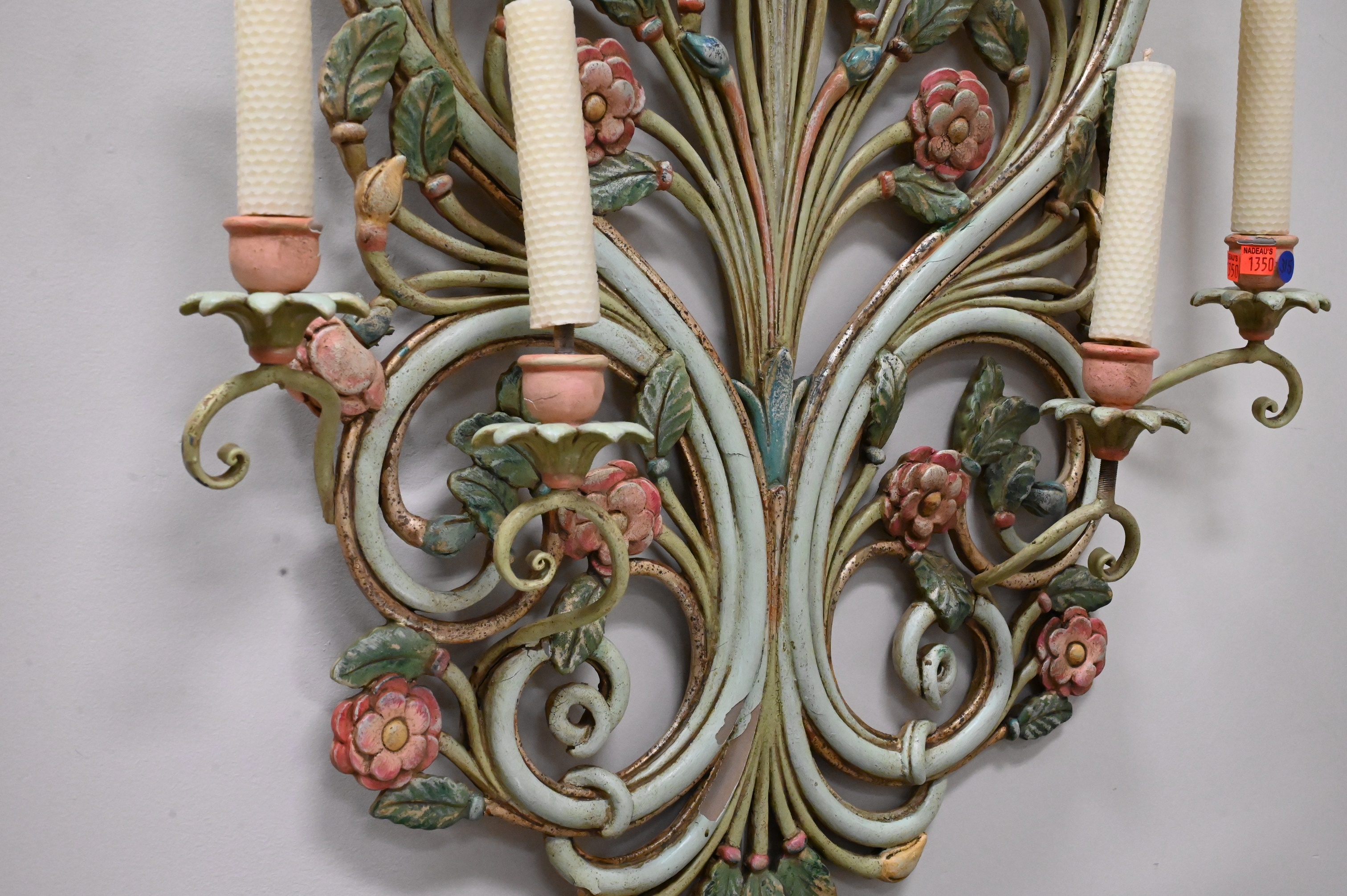 A Pair of Baroque Style Polychrome Painted Wood Appliques, each having scrolling back incorporating flower stems and leaves, eight candle branches, overall good condition, minor nicks and slight loss, height 43 inches, width 30 inches. Provenance: Property from a private New York collection sold to benefit charitable foundations.