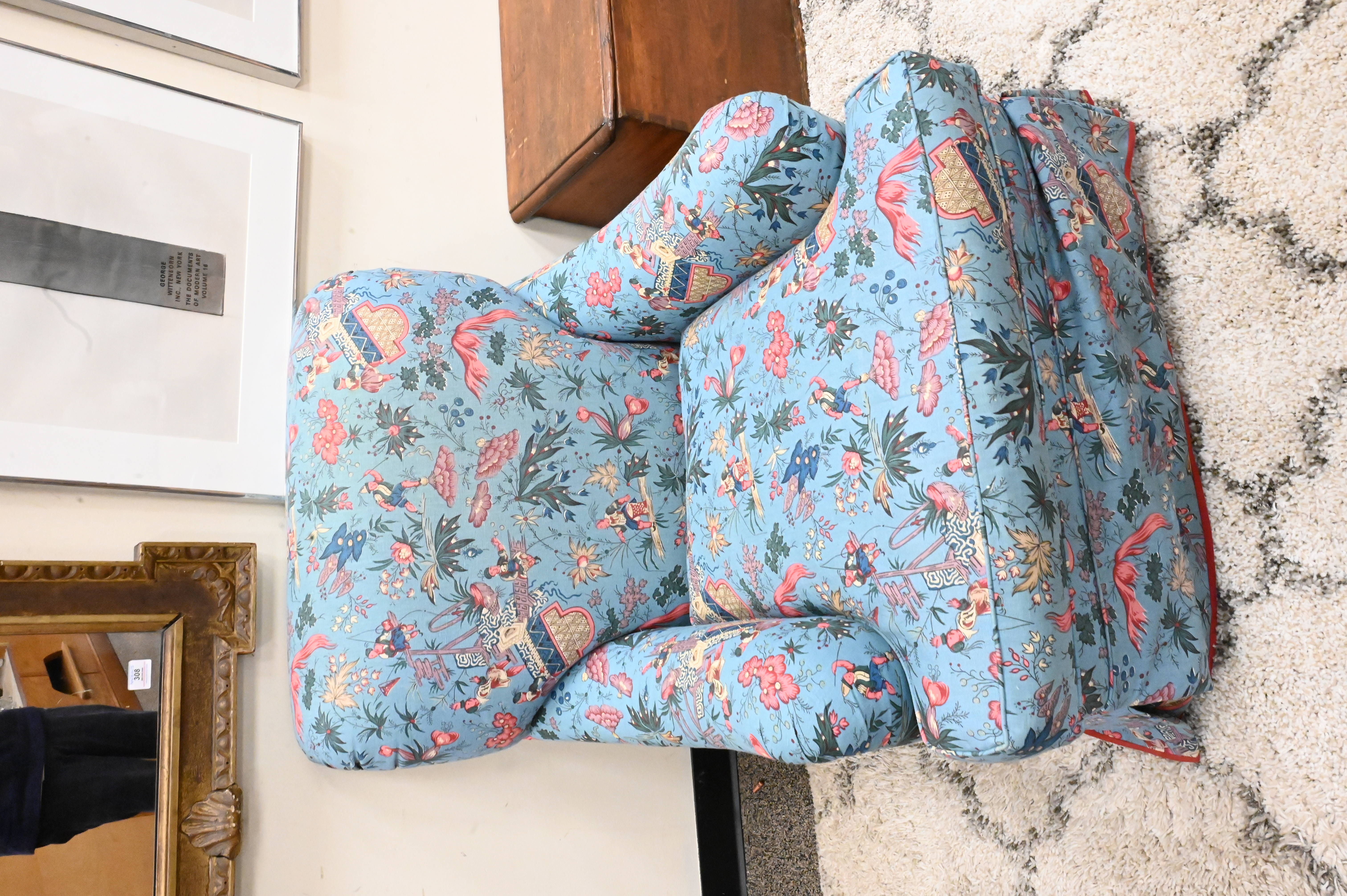 A Pair of Upholstered Club Chairs, having chinoiserie style upholstery rolled arms, height 33 inches, seat height 18 inches, overall width 31 inches, seat width 19 inches, seat depth 22 inches, overall depth 32 inches.