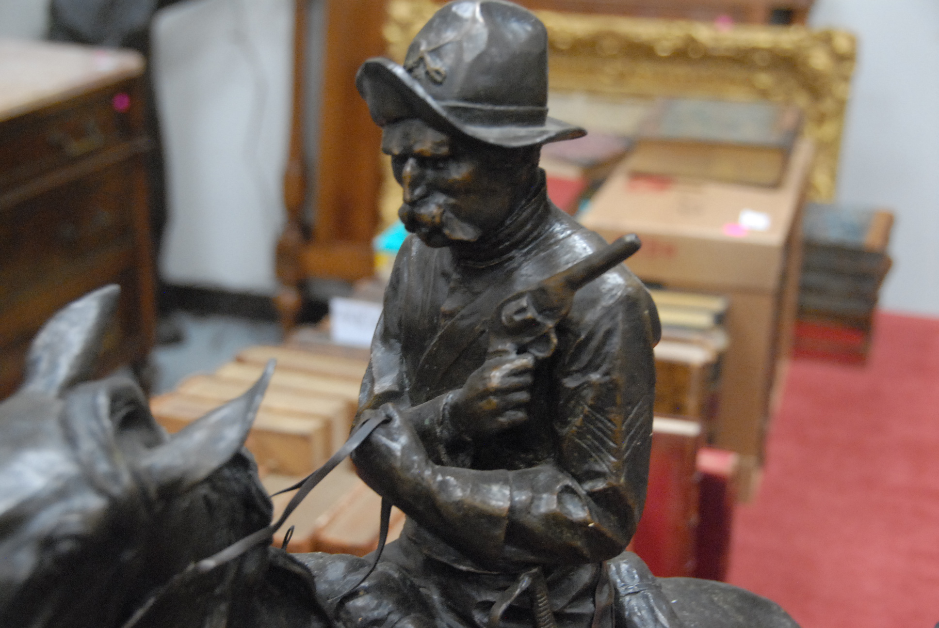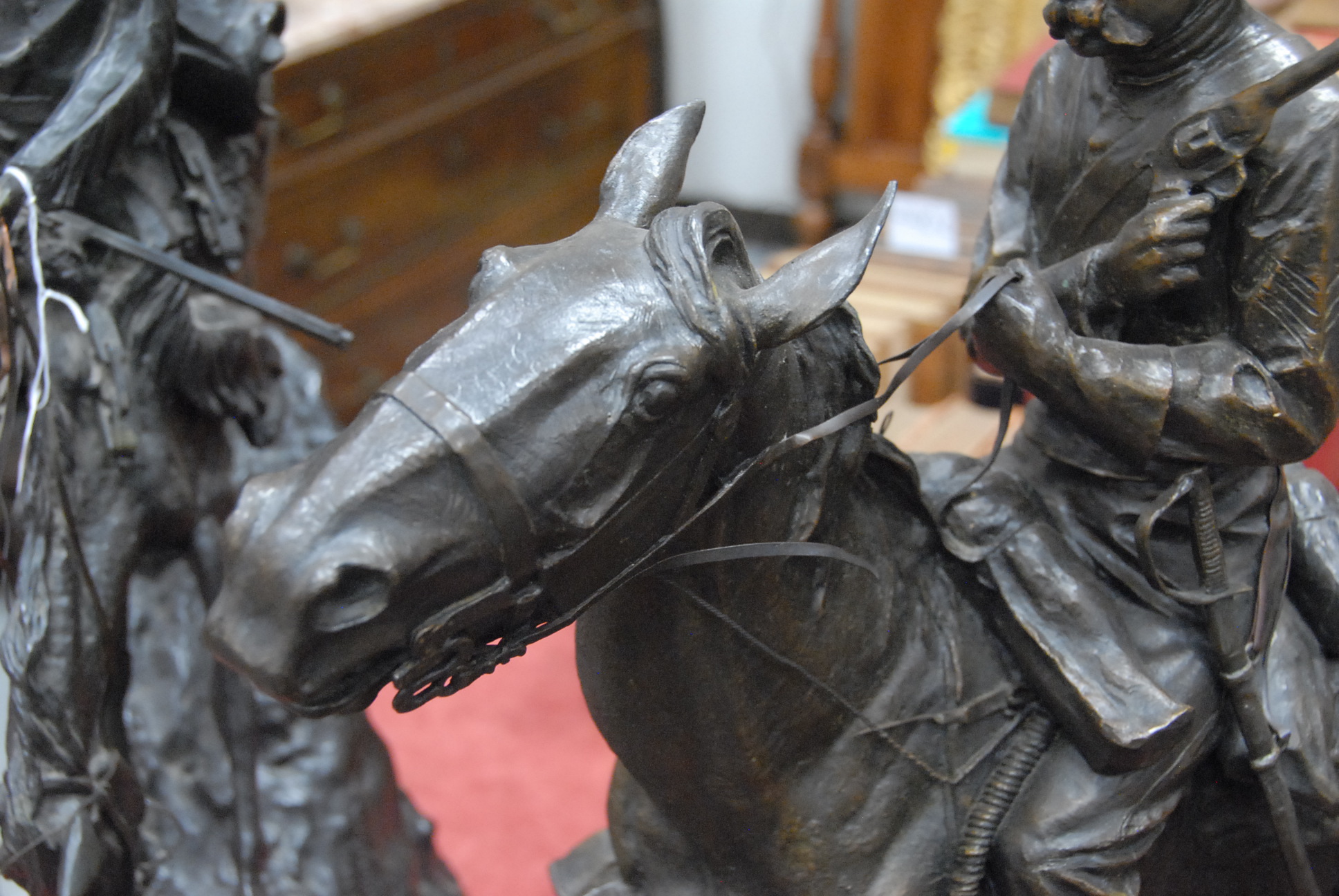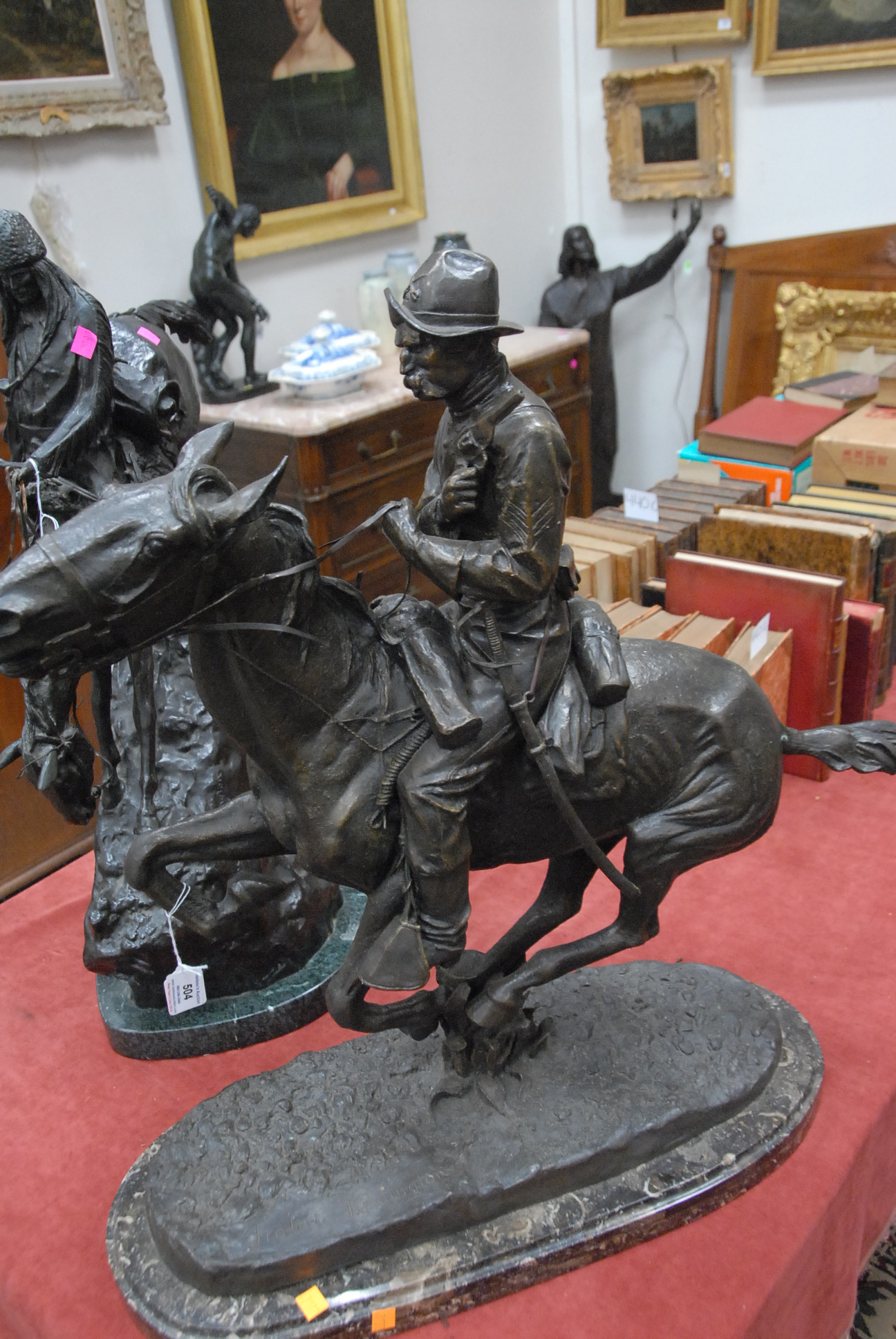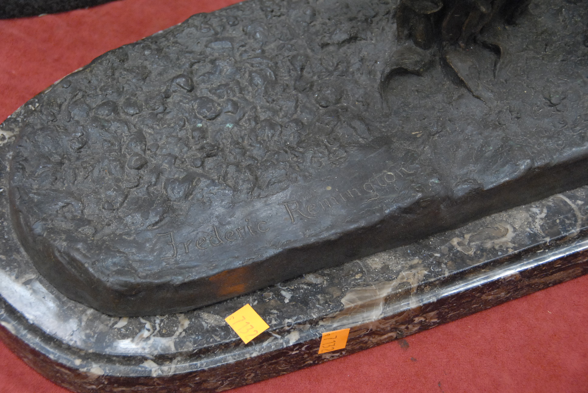Lot 504: After Remington bronze sculpture of cavalry man on horseback on brown marble base signed on base Frederic Remington, 1983. ht. 28in.