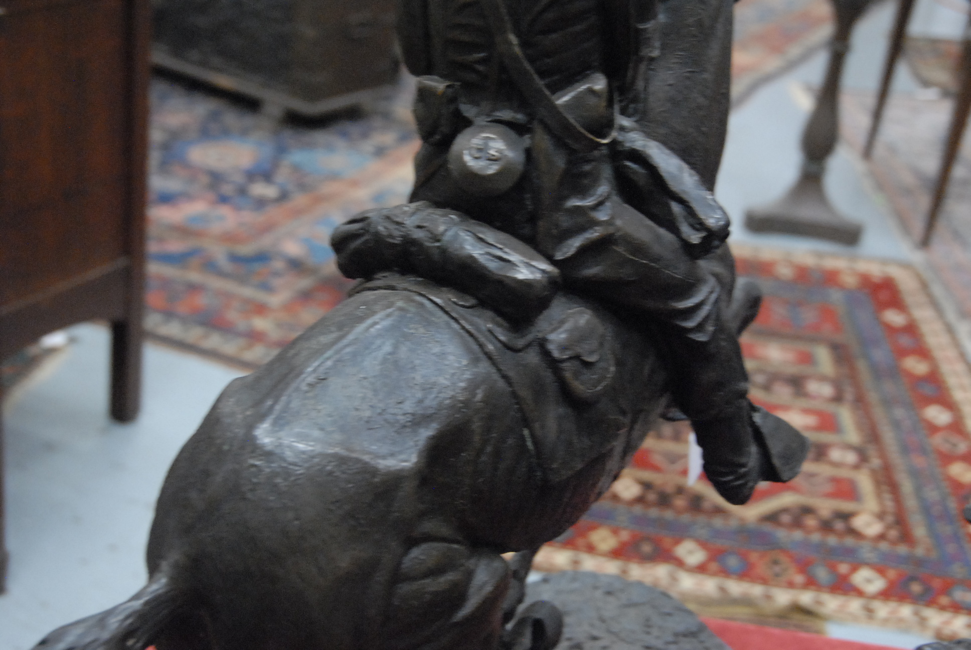 After Remington bronze sculpture of cavalry man on horseback on brown marble base signed on base Frederic Remington, 1983. ht. 28in.