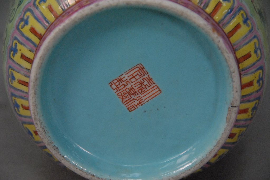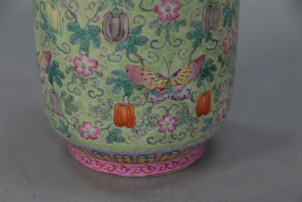 Chinese Famille Rose butterfly vase having green base color with flying butterflies. ht. 8in