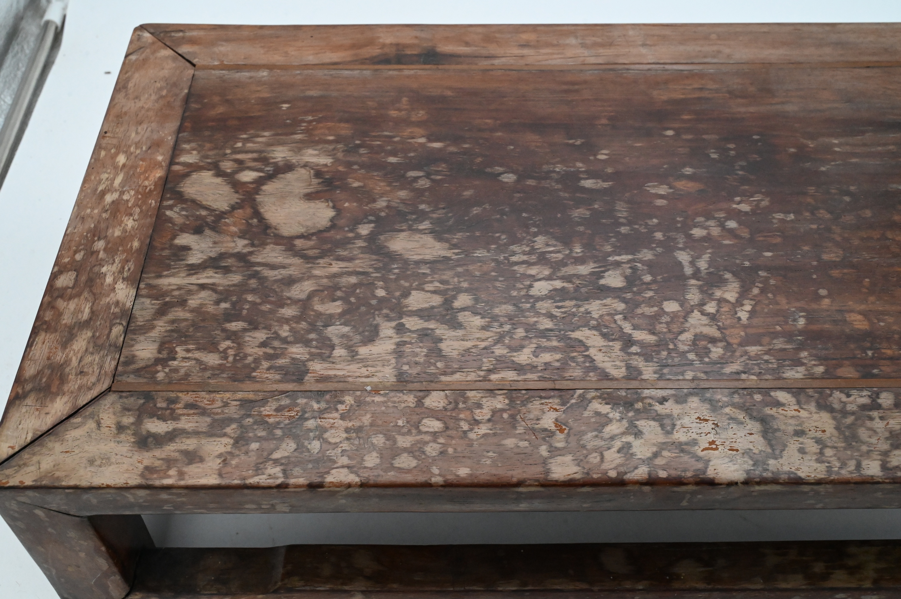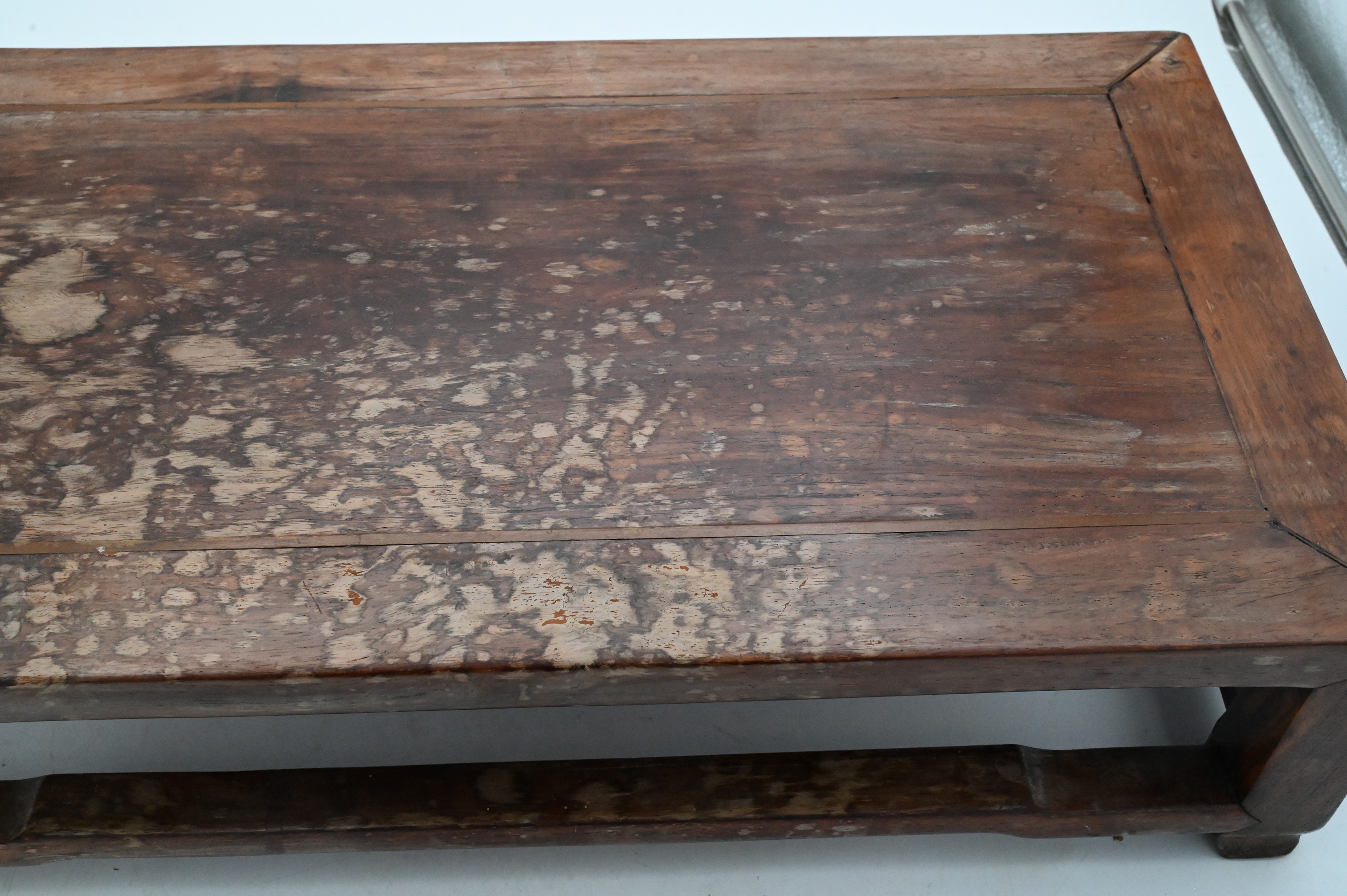 A rectangular Chinese hardwood low table with straight legs joined by side stretchers. height 5 1/2 inches, top 12 1/4″ x 22″ Condition: surface wear, staining, and age-expected imperfections.