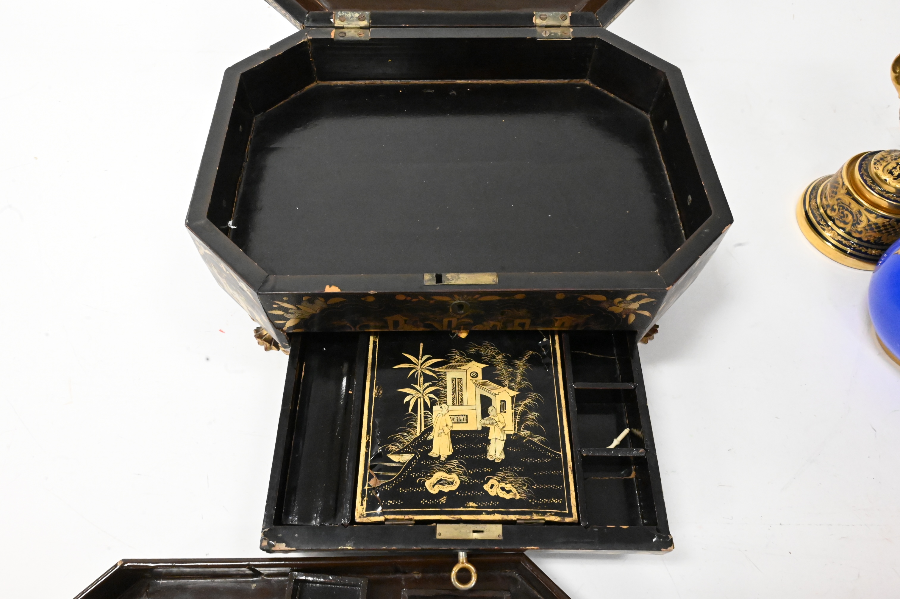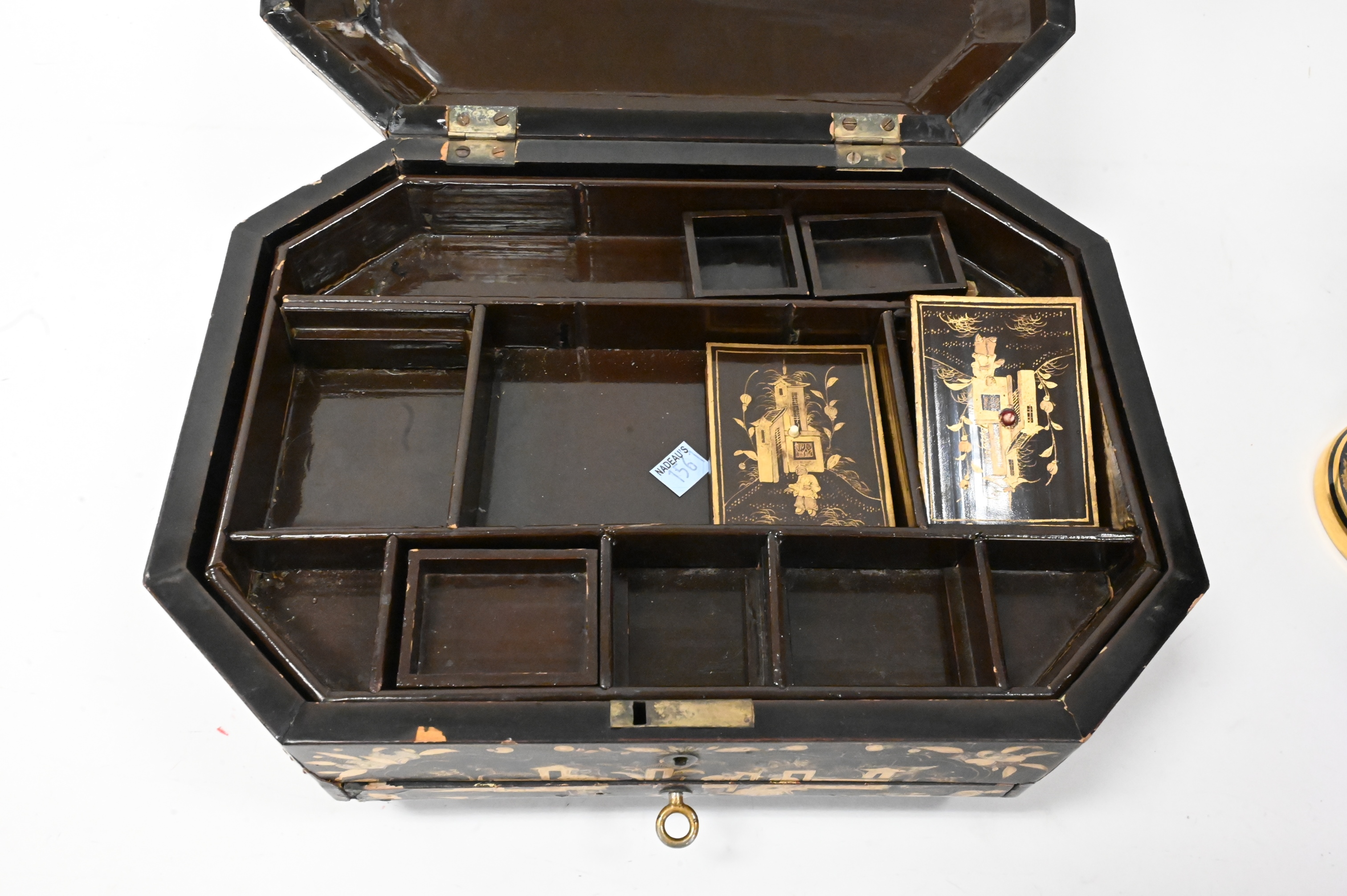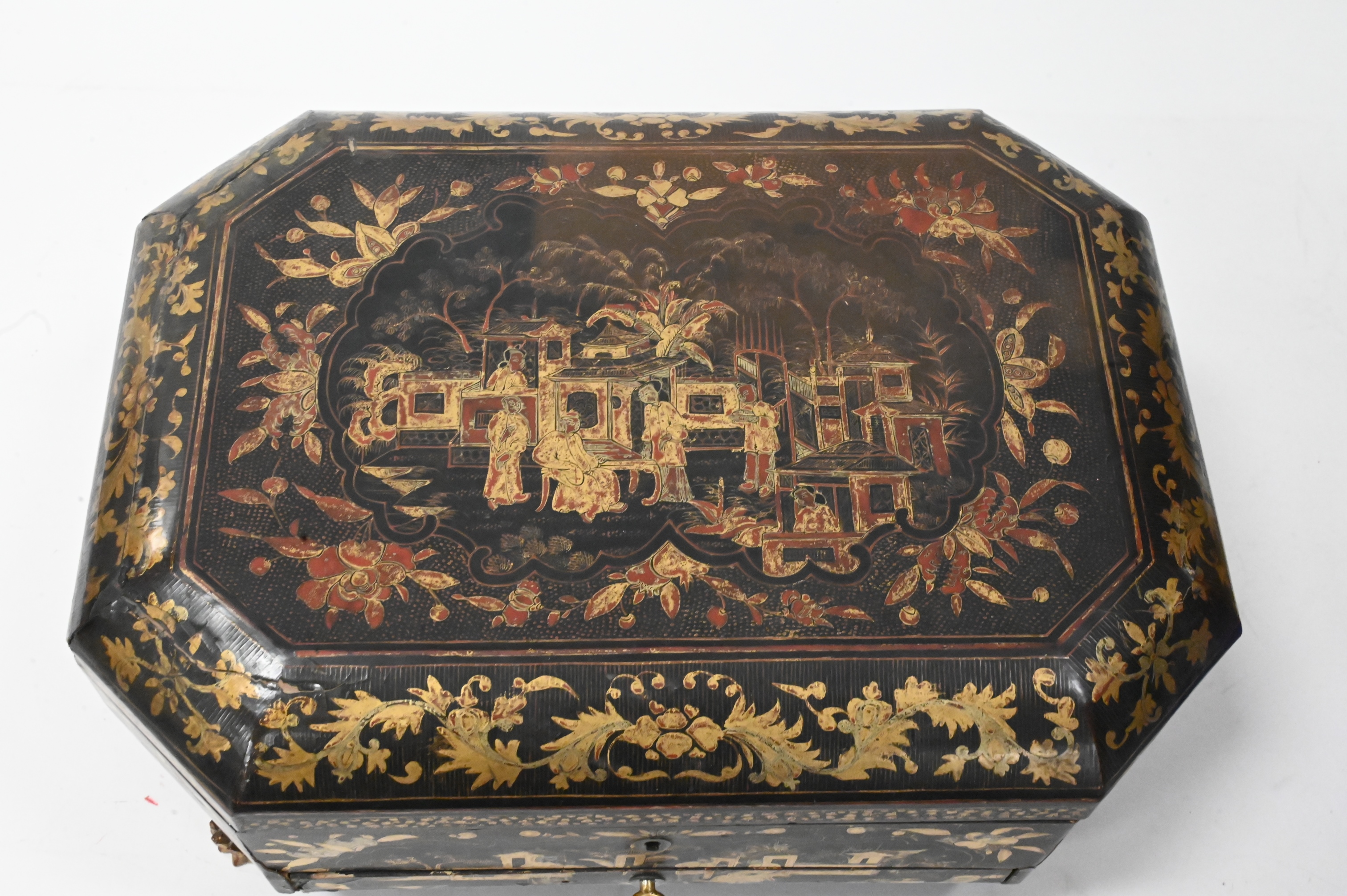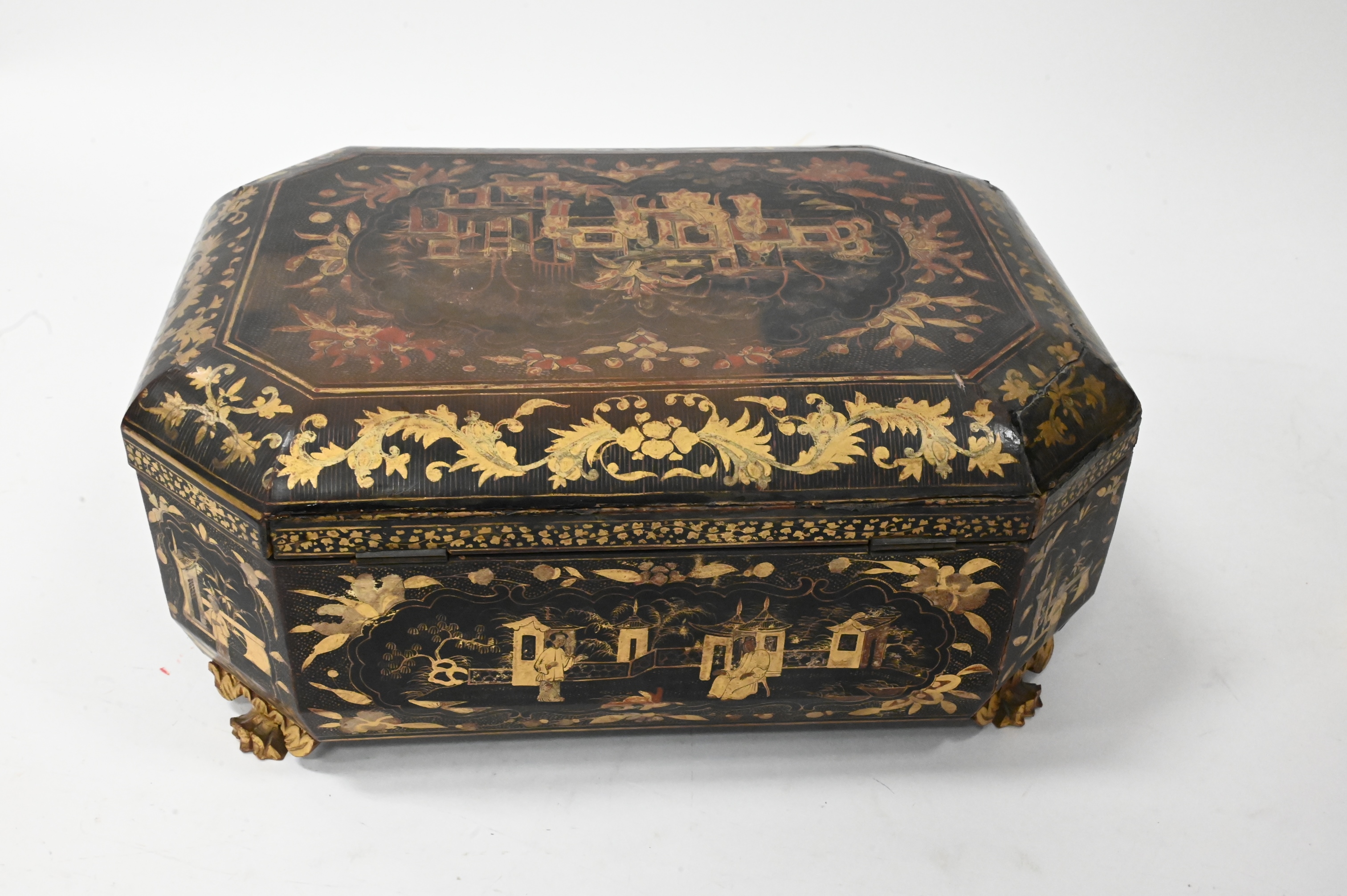 Chinese Lacquer Sewing Box, having lift top, over one drawer, chinoiserie decorated on bat claw feet, height 6 inches, top 10 1/2″ x 14″.