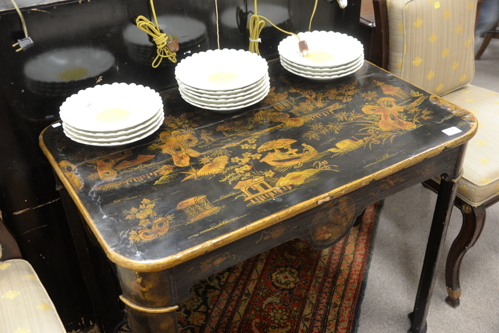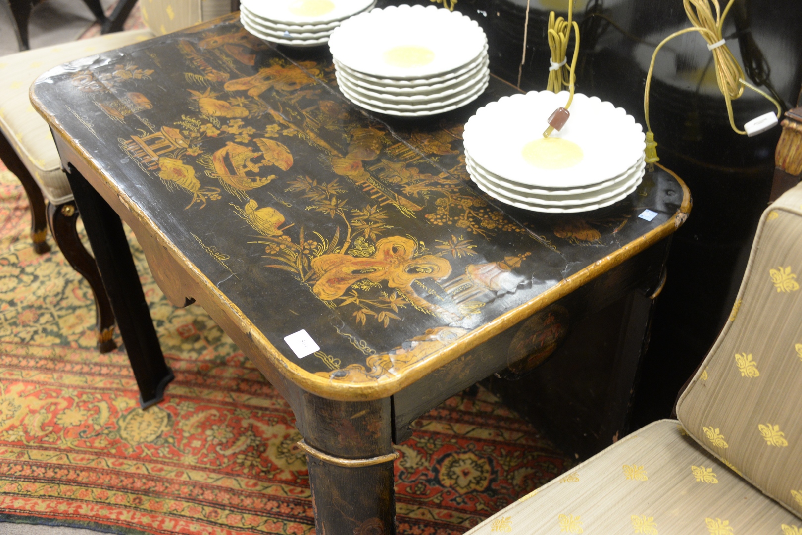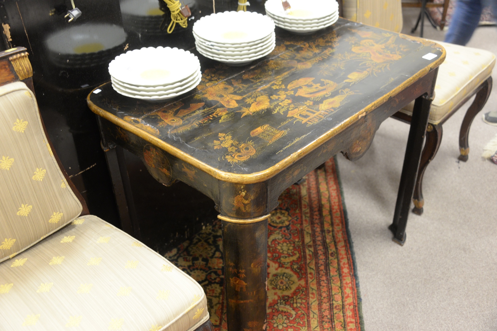 Lot 504: Chinoiserie Black Lacquered Table, 18th or 19th Century, having gilt and paint decoration, with one drawer, on curved legs, height 2…