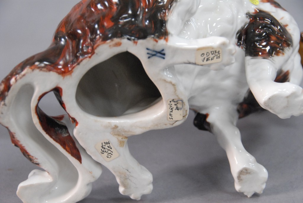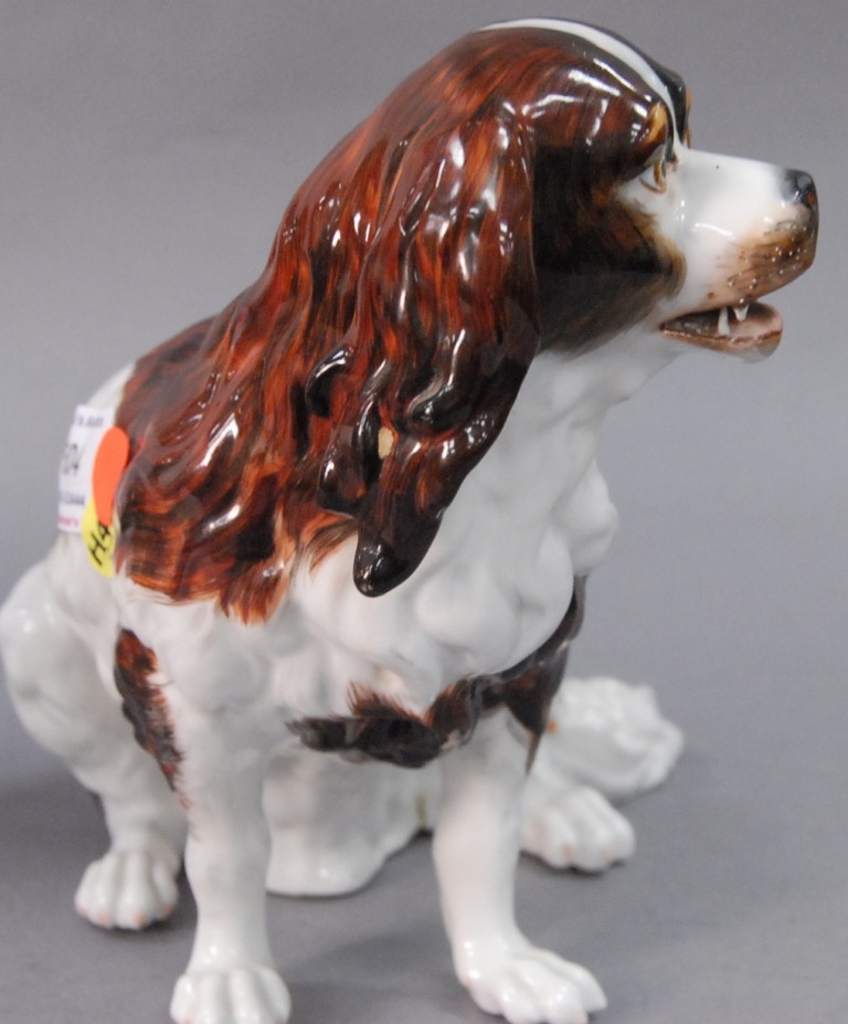 German porcelain dog marked with three crossed swords small repaired imperfection on chest. Height 8in.