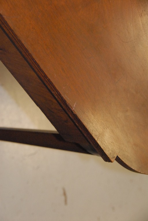 Margolis mahogany Federal style dining table with D shaped ends over conforming frieze all set on square tapered legs with four 12 inch leaves, signed Margolis in need of refinishing. ht. 30in. top: 43 x 61 opens to 109