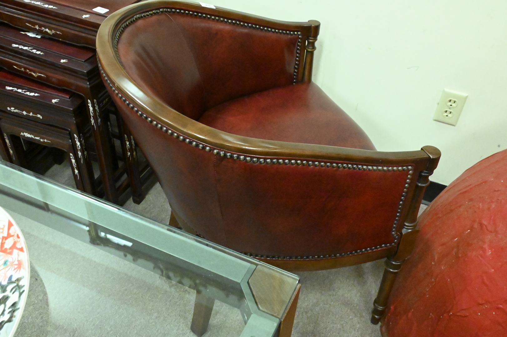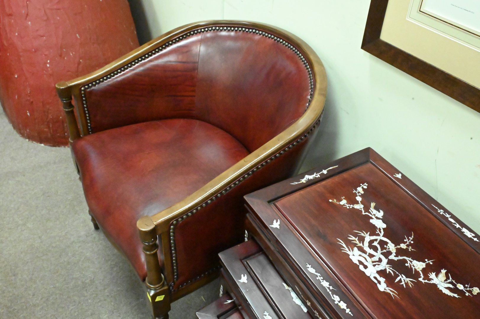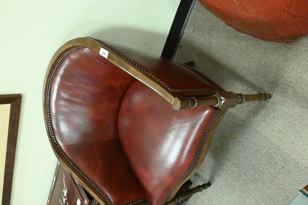 Pair of Leather Club Chairs, having fruitwood frames, height 30 1/2 inches, width 25 1/2 inches.
