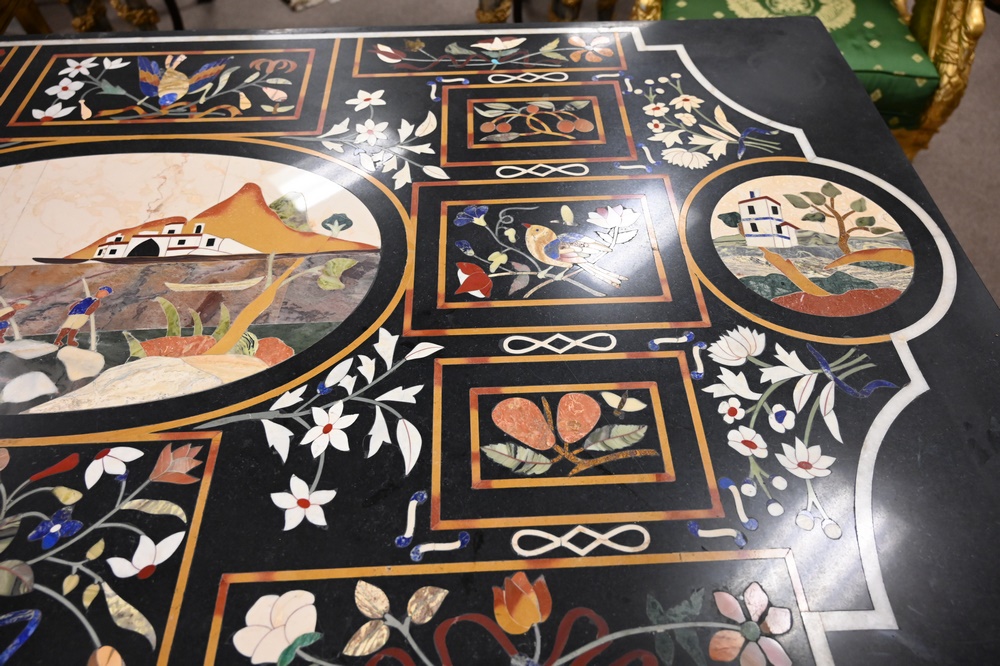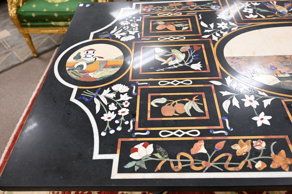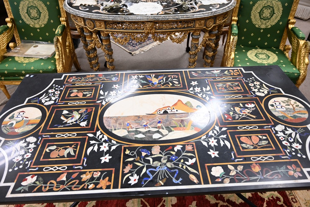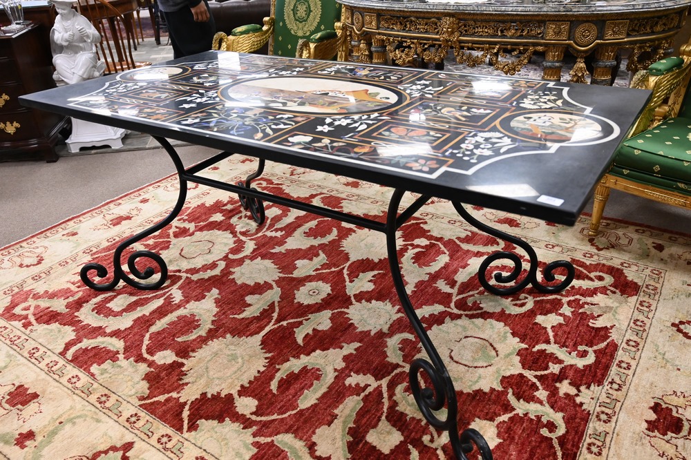 Lot 504: Pietra Dura Top Table, on scroll foot iron base, height 30 1/2 inches, top 35 1/2 x 71 inches.