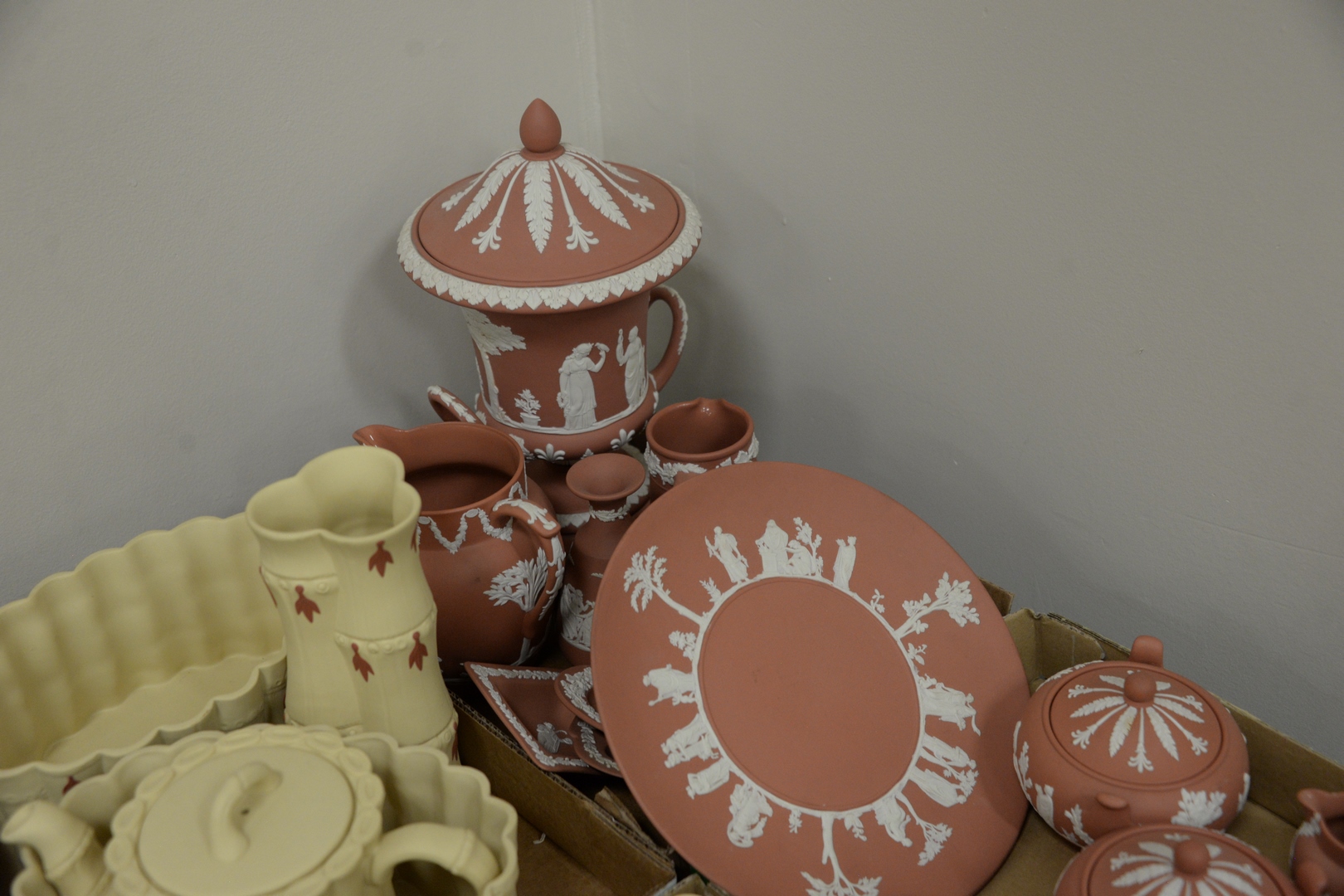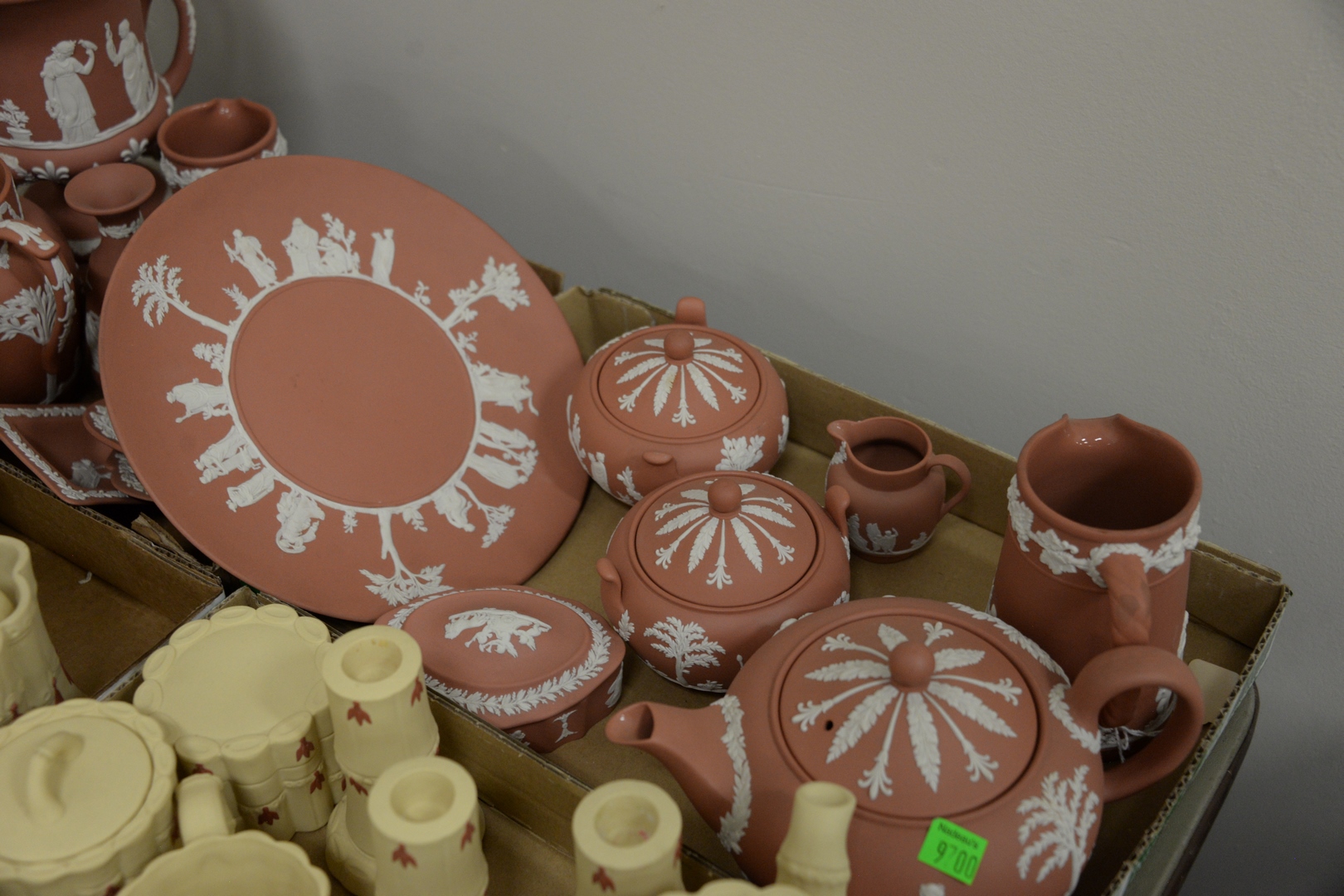 Lot 504: Sixteen Piece Pink Wedgwood Jasperware Group, to include a tea set, covered urn, plates, cup and saucer, pitcher, etc. Provenance: Estate of James Wadhams