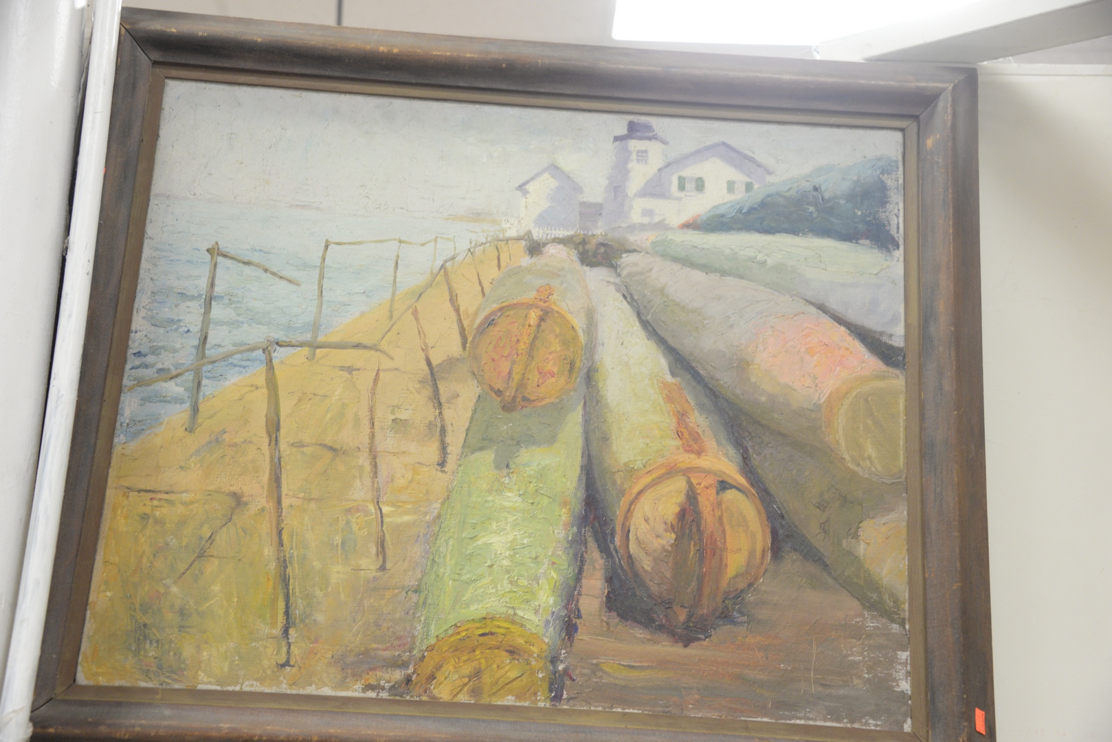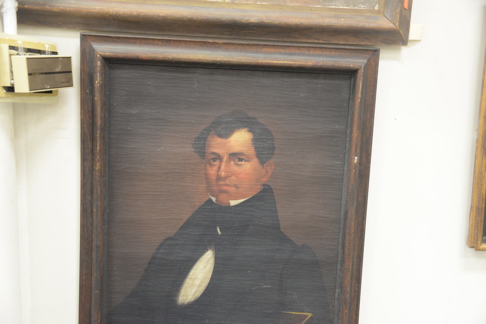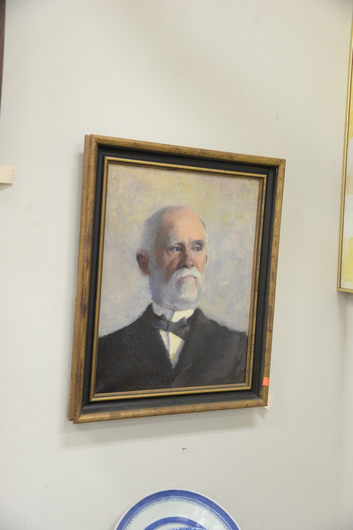 Lot 504: Three Framed Paintings to include a shore scene with lighthouse, oil on canvas; bust of a man with grey beard; along with a portrait of a man wearing a black suit, largest 24″ x 30″. Provenance: From a Newport, Rhode Island historic home, in the same