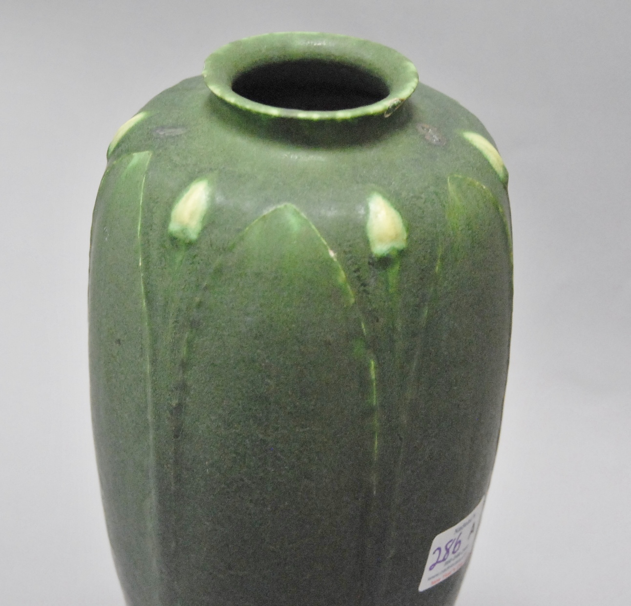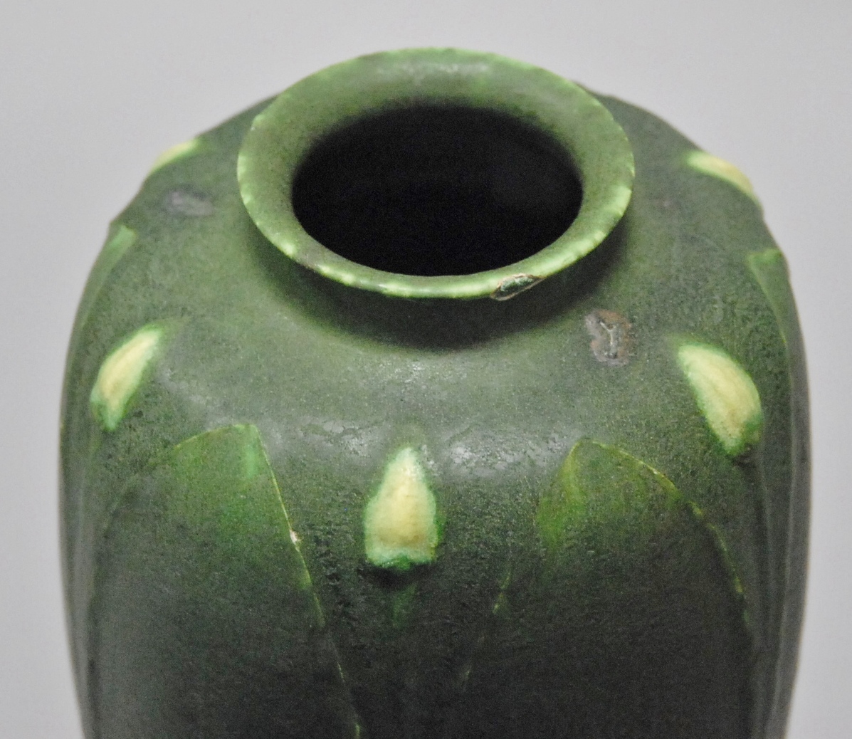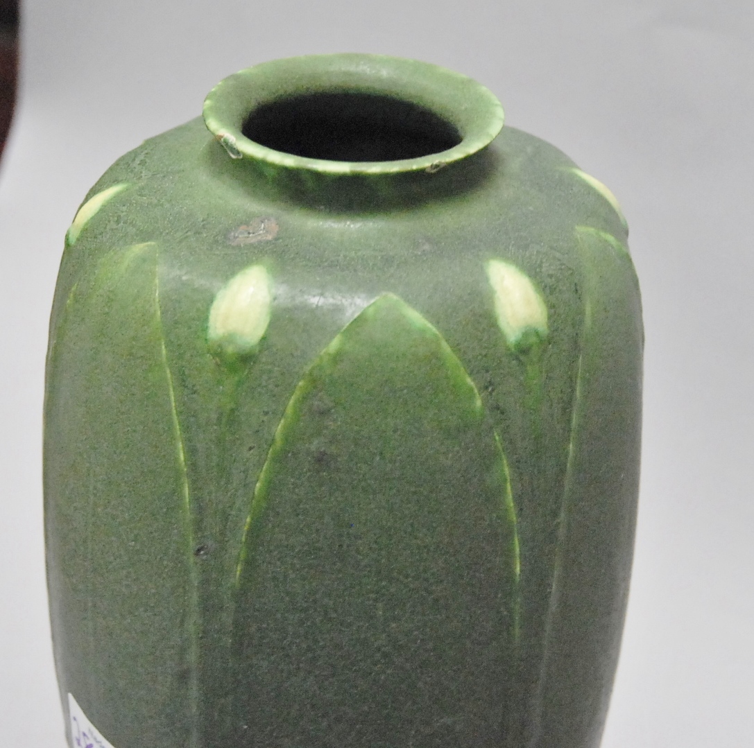 Lot 504A: Rare Grueby Faience Co. Ruth Erickson two-color pottery vase in matte green glaze with alternating leaf and white molded flower bud design, circular stamp Grueby Faience Co. Boston U.S.A. and Artist’s initials RE three minor chips/bruises. h