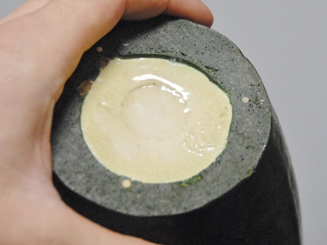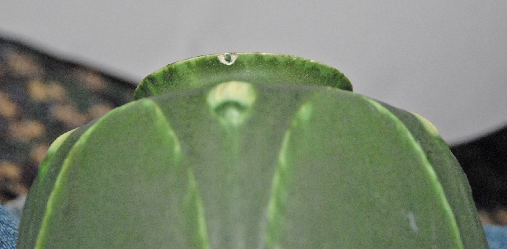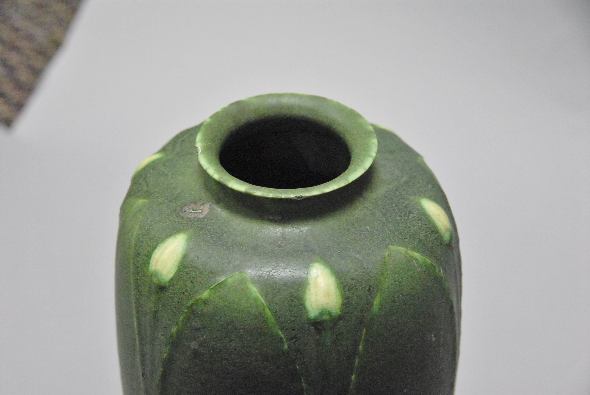 Lot 504A: Rare Grueby Faience Co. Ruth Erickson two-color pottery vase in matte green glaze with alternating leaf and white molded flower bud design, circular stamp Grueby Faience Co. Boston U.S.A. and Artist’s initials RE three minor chips/bruises. h