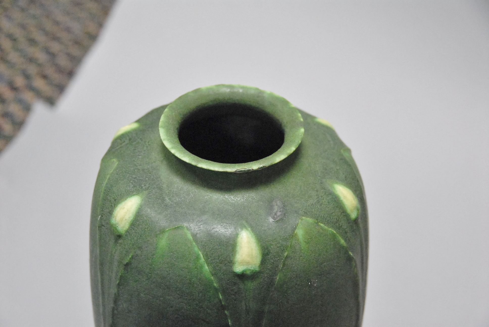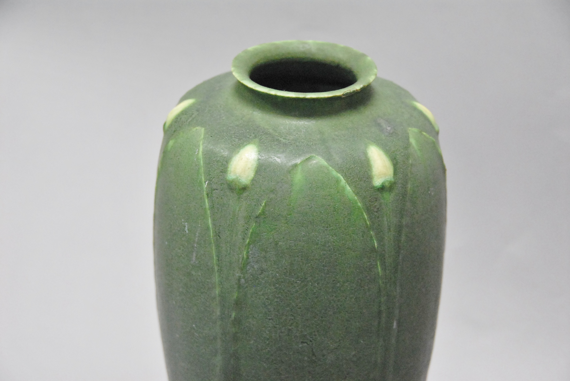 Rare Grueby Faience Co. Ruth Erickson two-color pottery vase in matte green glaze with alternating leaf and white molded flower bud design, circular stamp Grueby Faience Co. Boston U.S.A. and Artist’s initials RE three minor chips/bruises. ht. 11 3/4 in. dia. approximately 5 1/2 in.