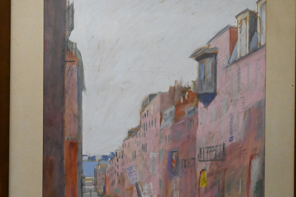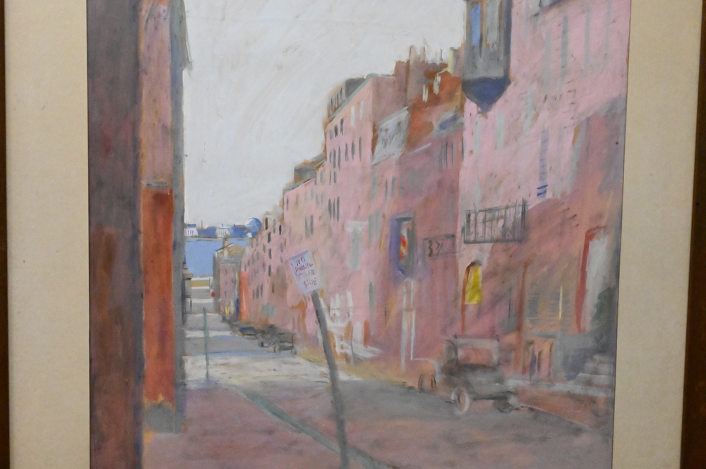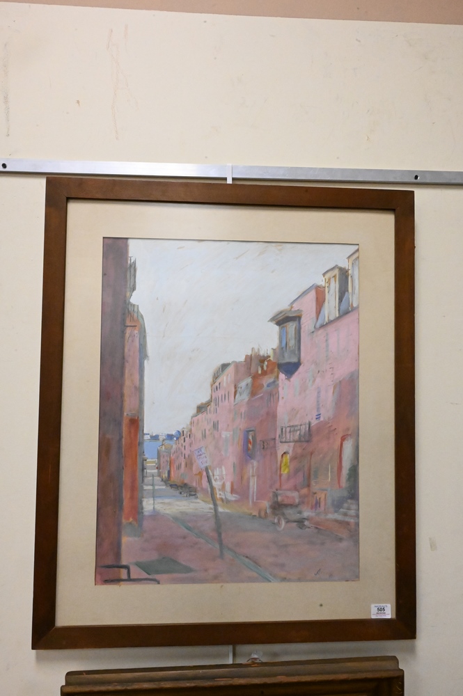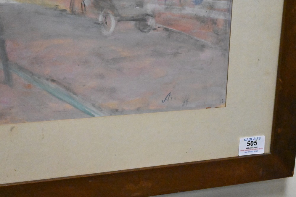 Lot 505: Alexis Paul Harapoff (1904 – 1948), street scene, gouache, signed lower right, 31 1/2″ x 25 1/2″.