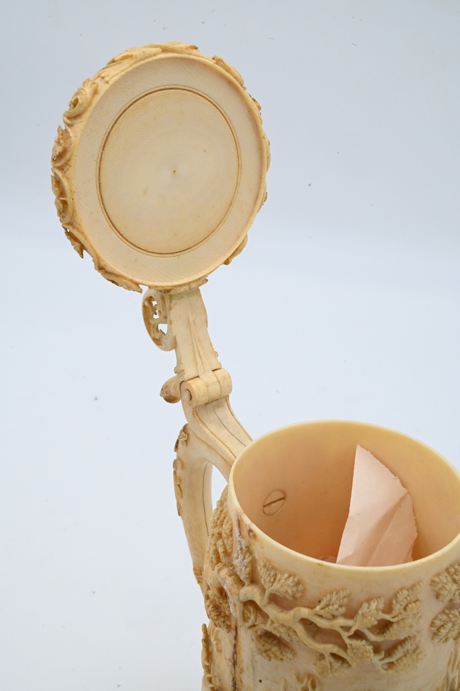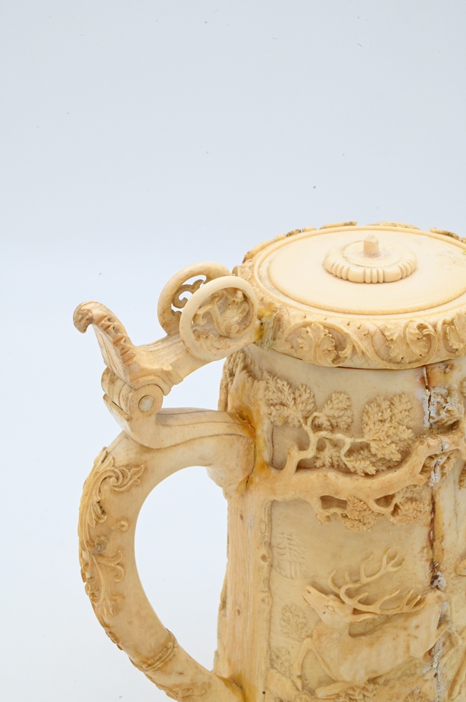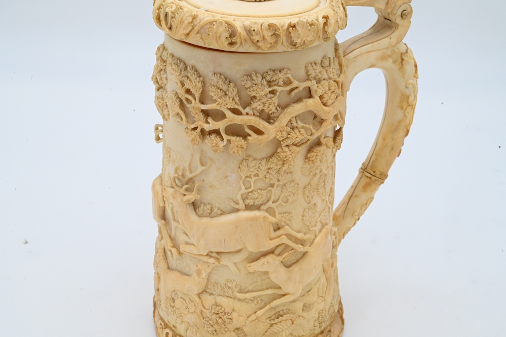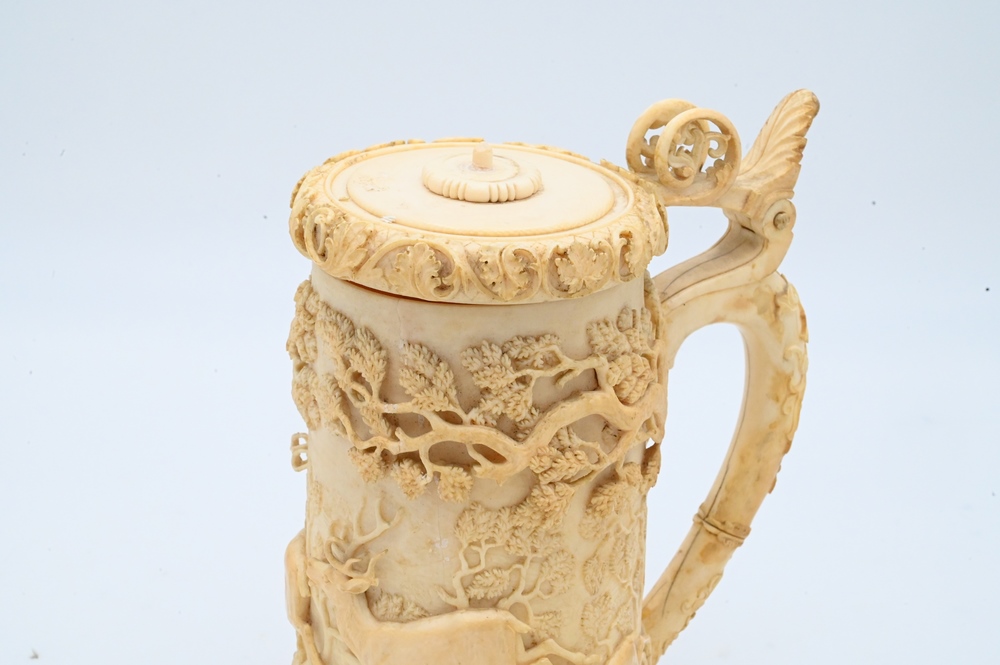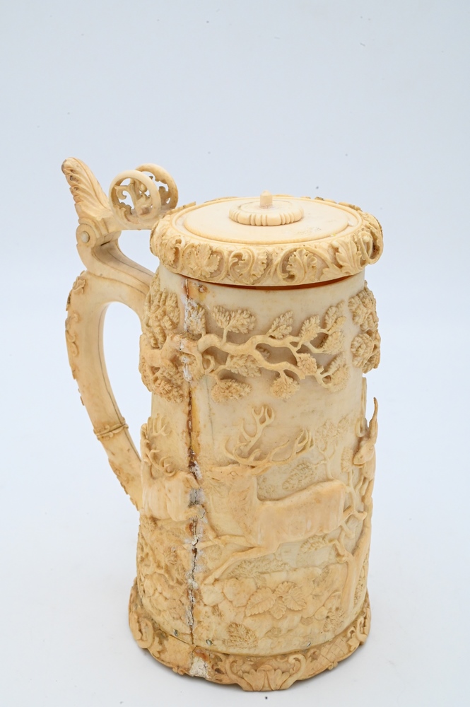 Continental Ivory Tankard, having carved deer or elk, trees and cover, 19th century (handle gluedon, repaired crack in side), height 8 inches. Please note: Items containing ivory cannot be purchased or shipped by bidders residing outside of the United States or California, Hawaii, Nevada, New Jersey, New York, Washington, Oregon, or District of Columbia. If an ivory item is purchased by a bidder in one of the above mentioned locations or attempts to ship ivory to one of the above mentioned locations, bidder will forfeit the item and be responsible for any incurred fees such as a restocking fee.