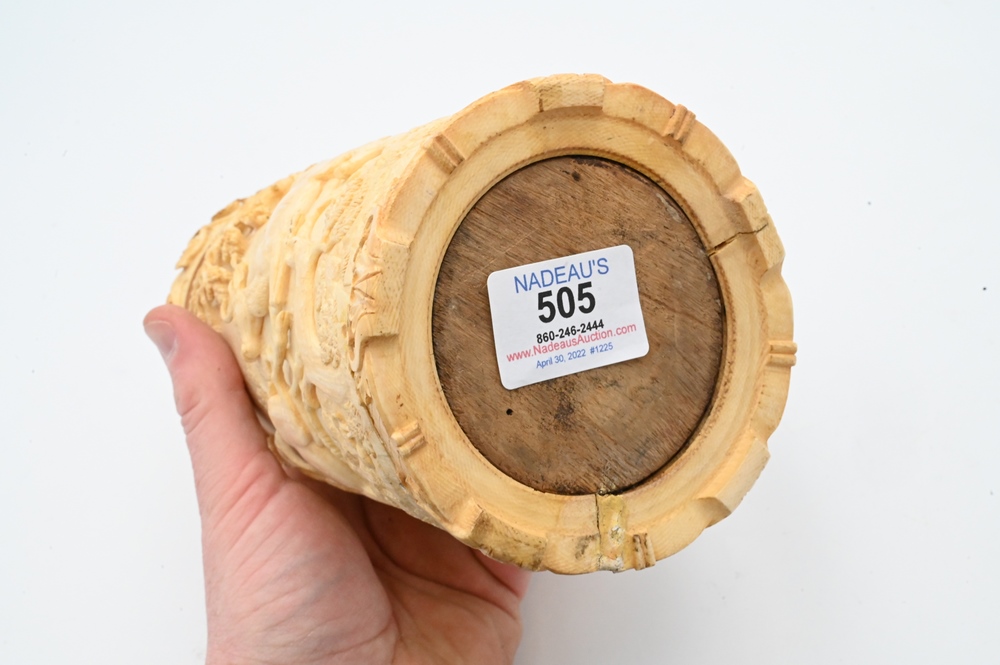 Lot 505: Continental Ivory Tankard, having carved deer or elk, trees and cover, 19th century (handle gluedon, repaired crack in side), height 8 inches. Please note: Items containing ivory cannot be purchased or shipped by bidders residing outside of the United States or California, Hawaii, Nevada, New Jersey, New York, Washington, Oregon, or District of Columbia. If an ivory item is purchased by a bidder in one of the above mentioned locations or attempts to ship ivory to one of the above mentioned locations, bidder will forfeit the item and be responsible for any incurred fees such as a restocking fee.