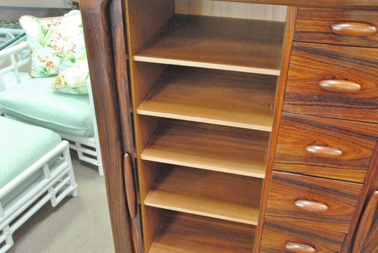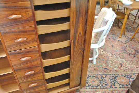 Lot 505: Dyrlund rosewood gentlemen’s chest, tambour doors and seven center drawers in excellent condition. ht. 52 in. wd. 48 in. dp. 19 in.