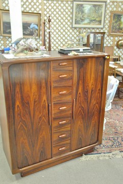 Dyrlund rosewood gentlemen’s chest, tambour doors and seven center drawers in excellent condition. ht. 52 in. wd. 48 in. dp. 19 in.