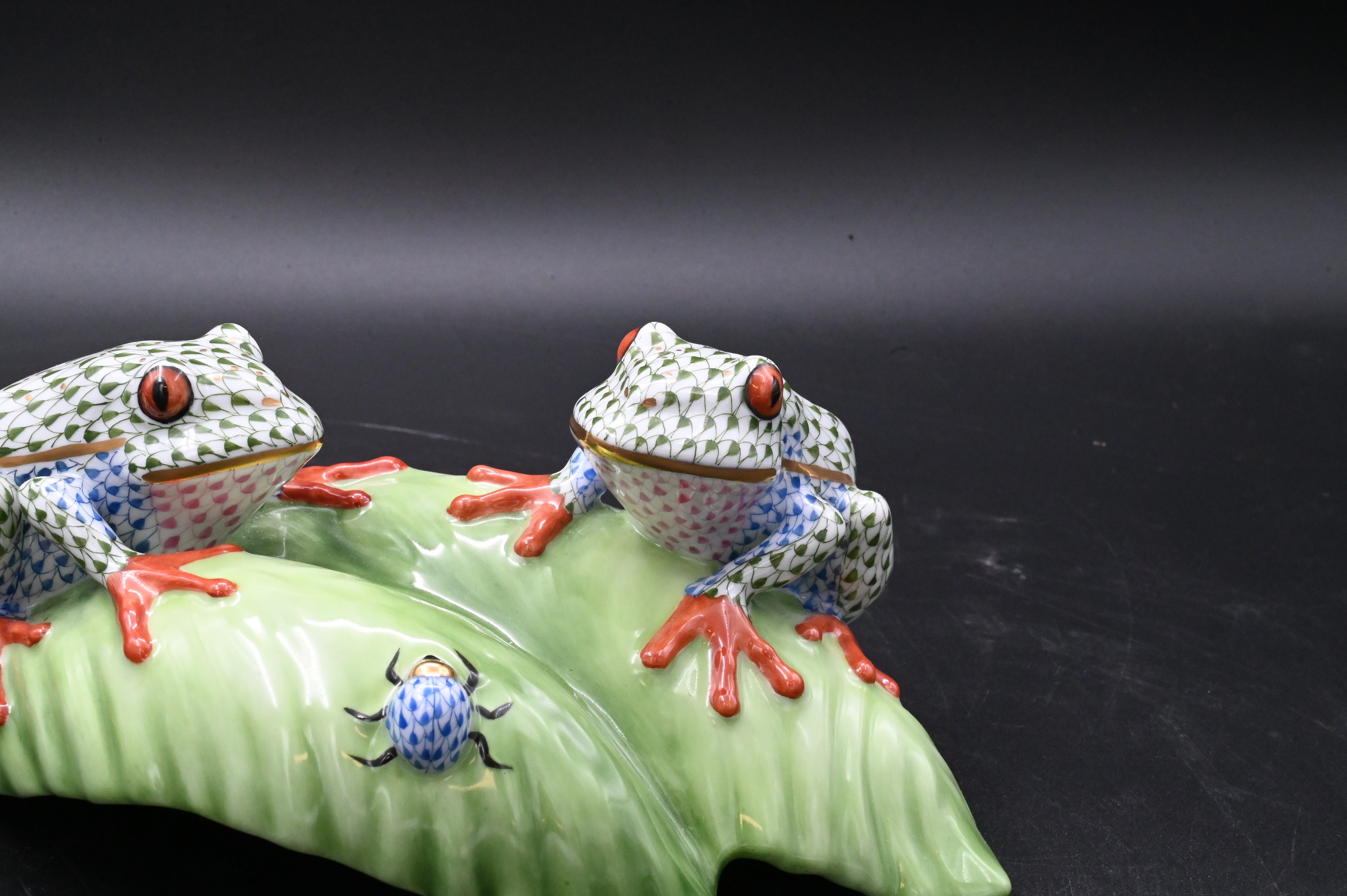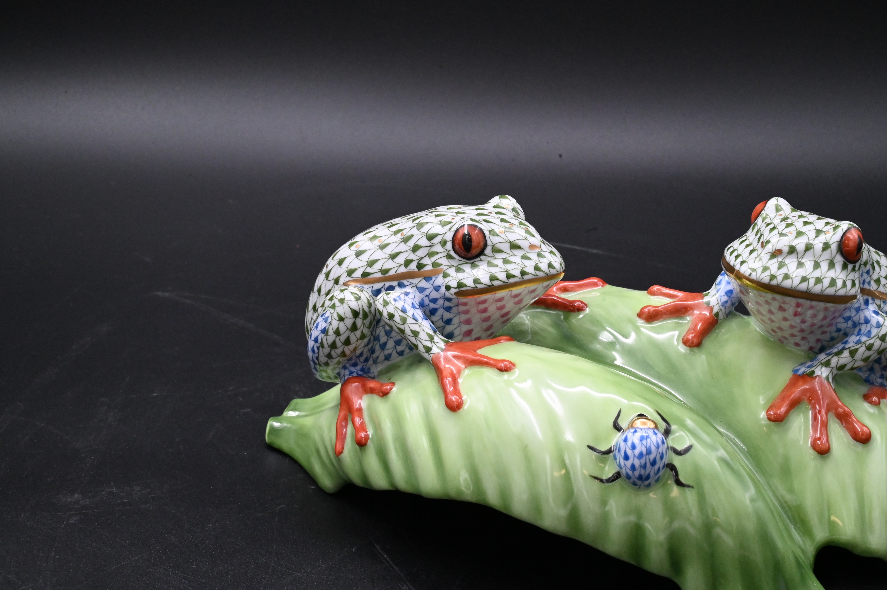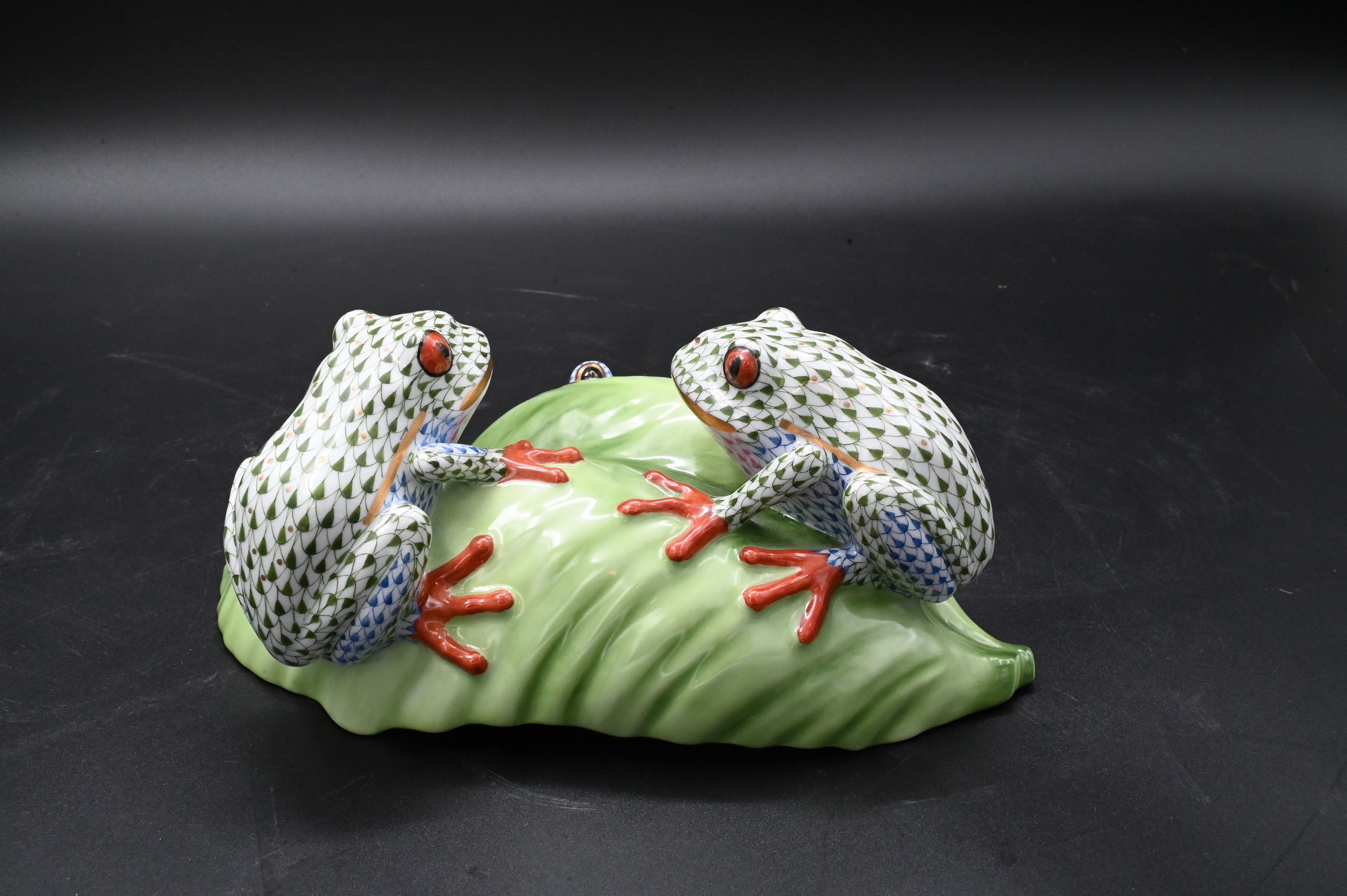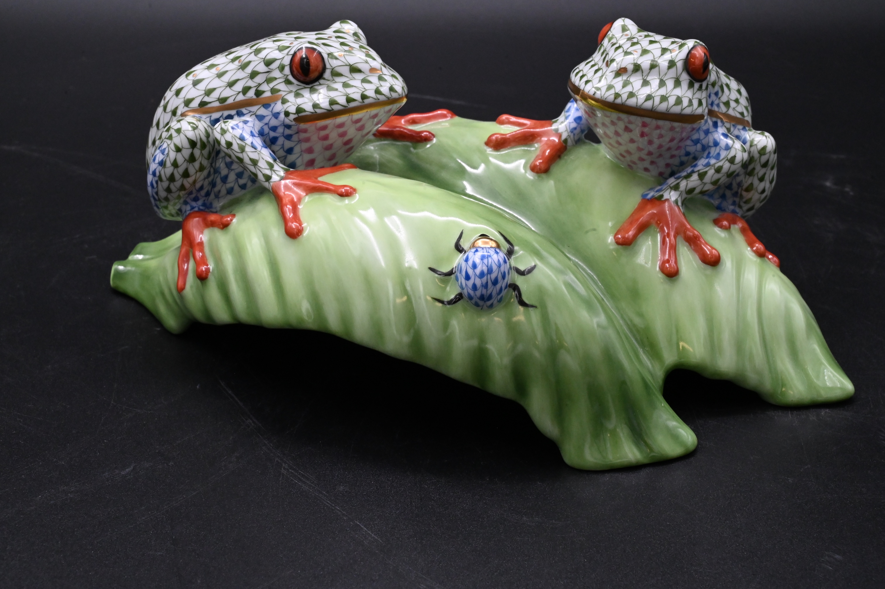 Herend Porcelain Tree Frogs on Leaf
