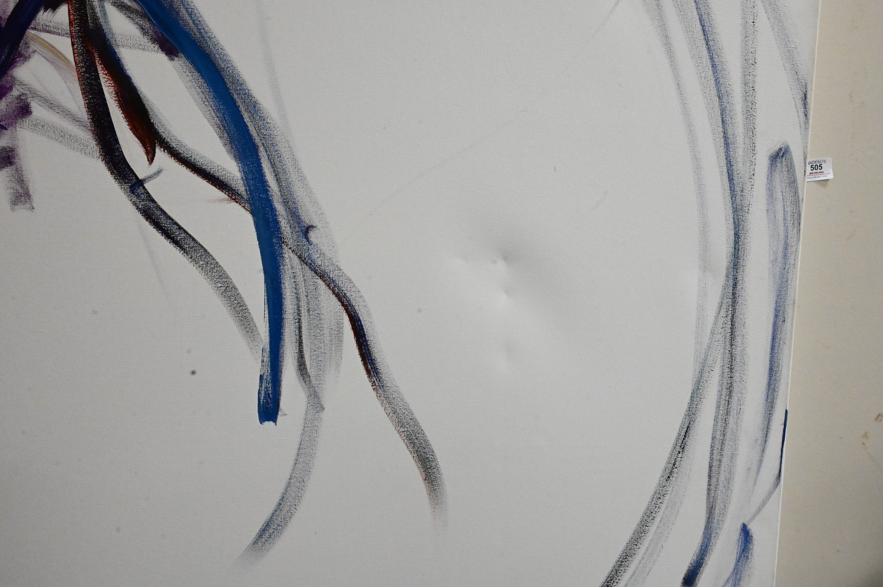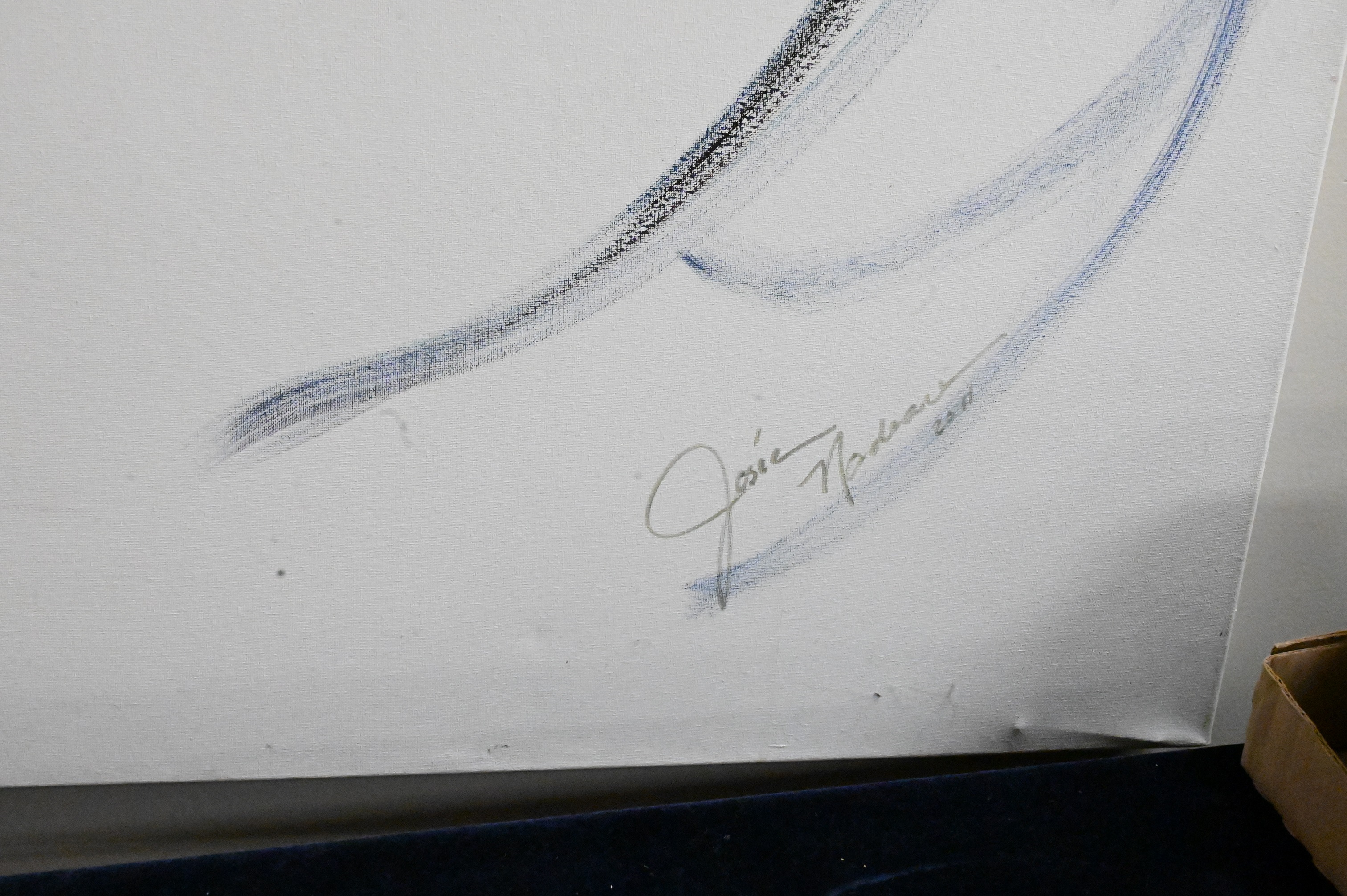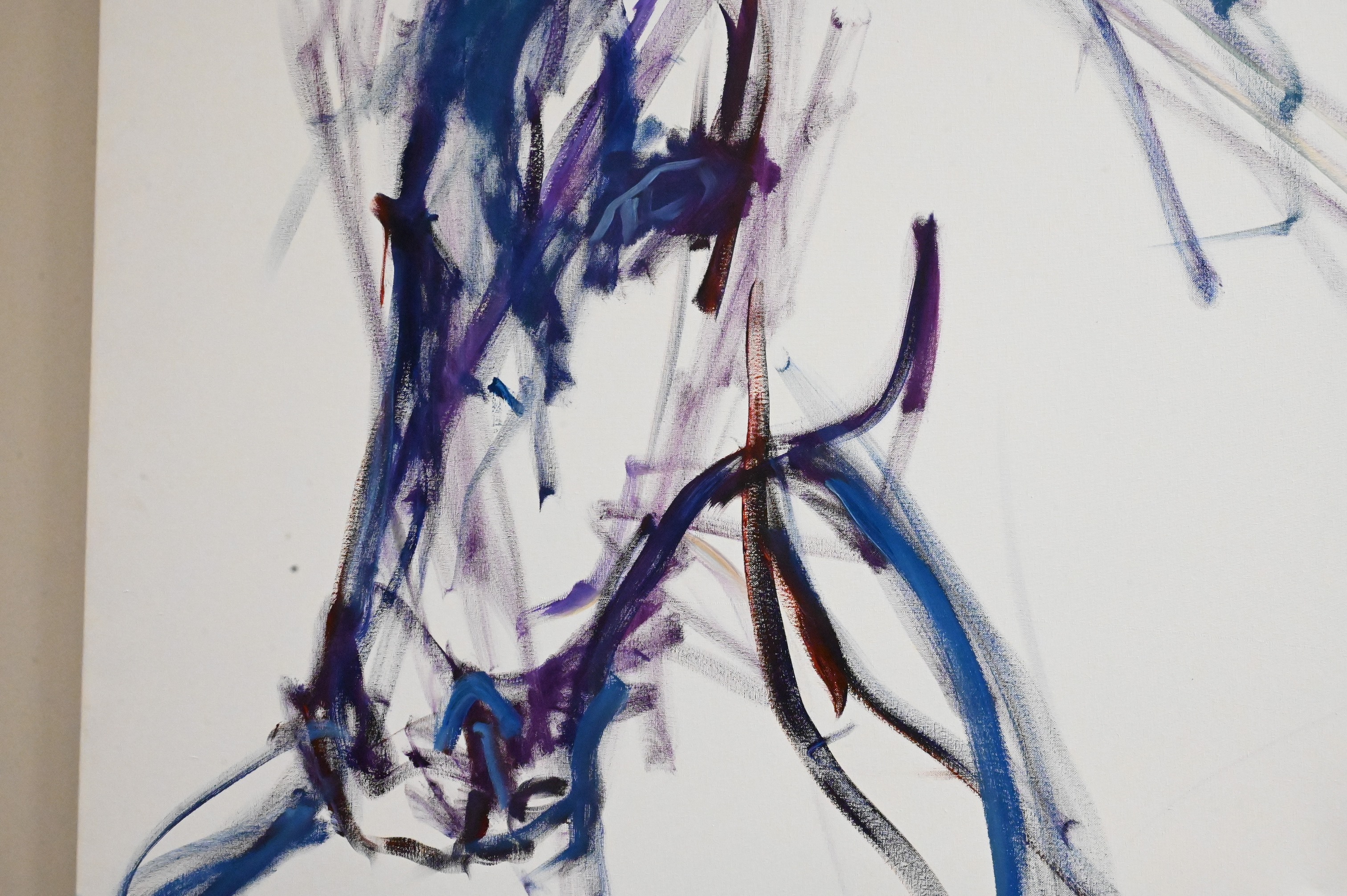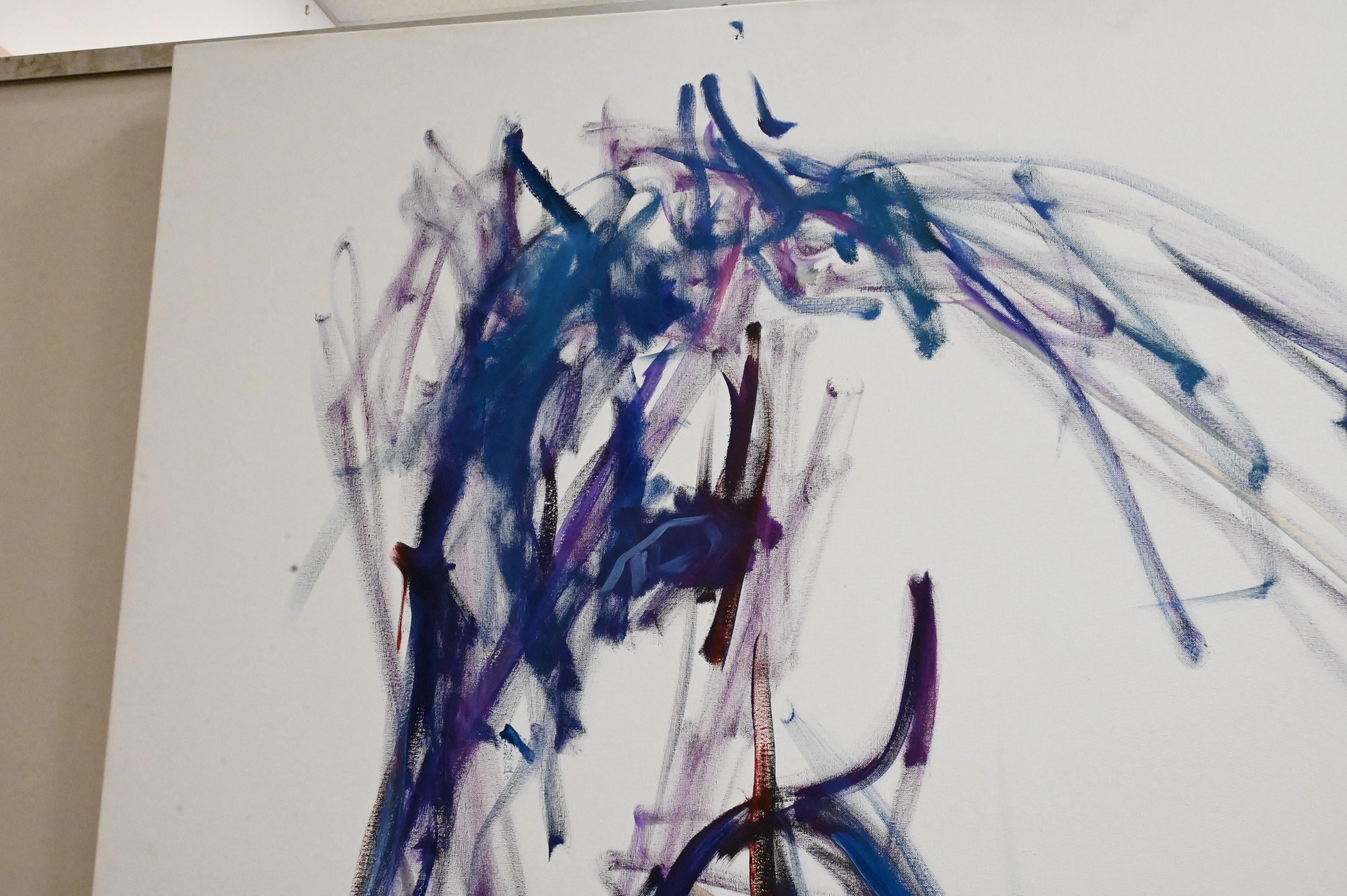 Jose Nadeau (Canadian, b. 1963), oil on canvas, depicts sketch of horse in blue and purple, signed lower right, 70″ x 53 3/4″.