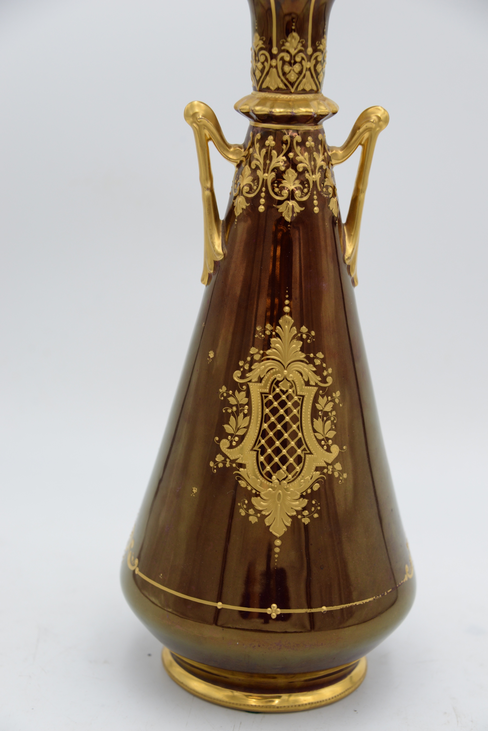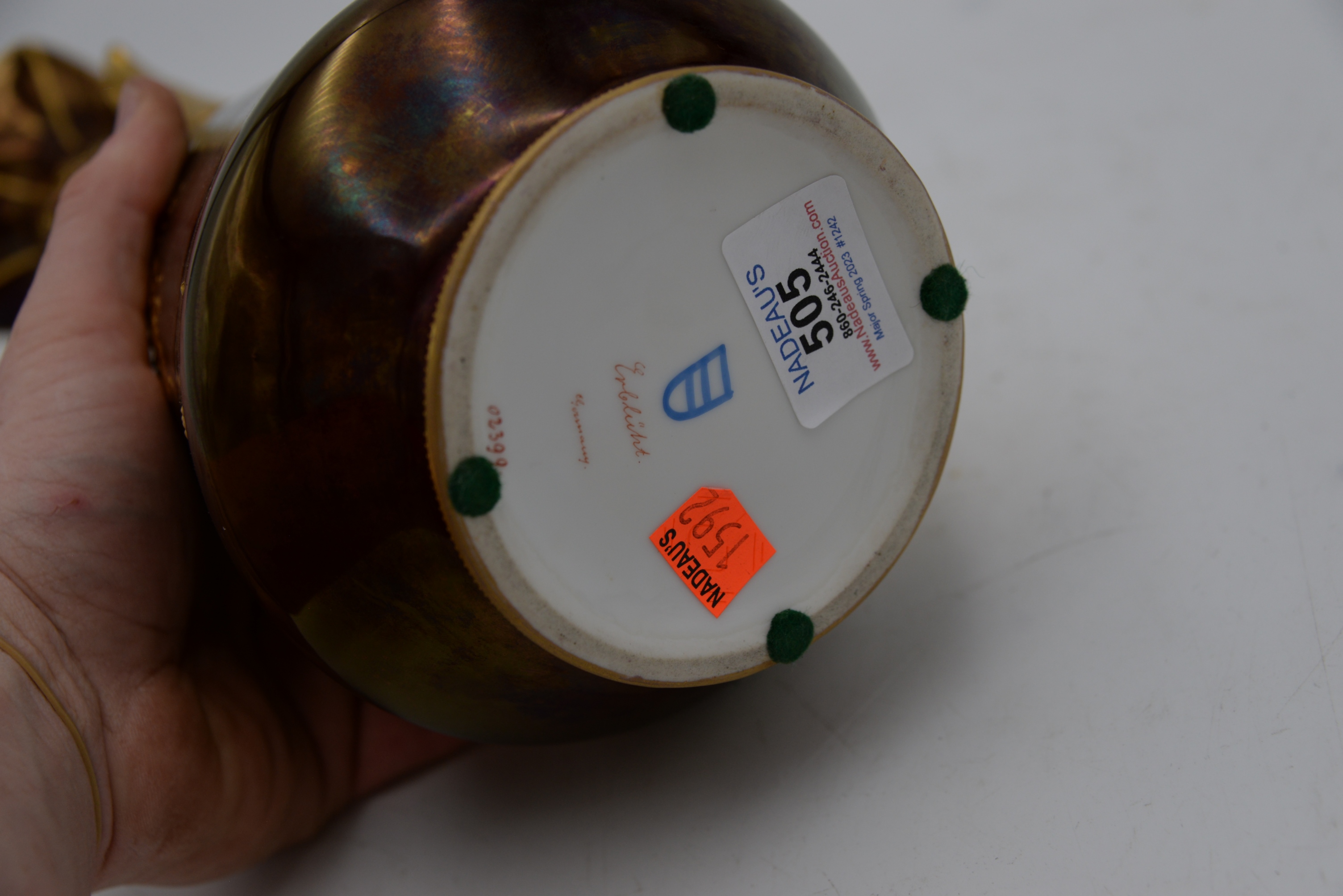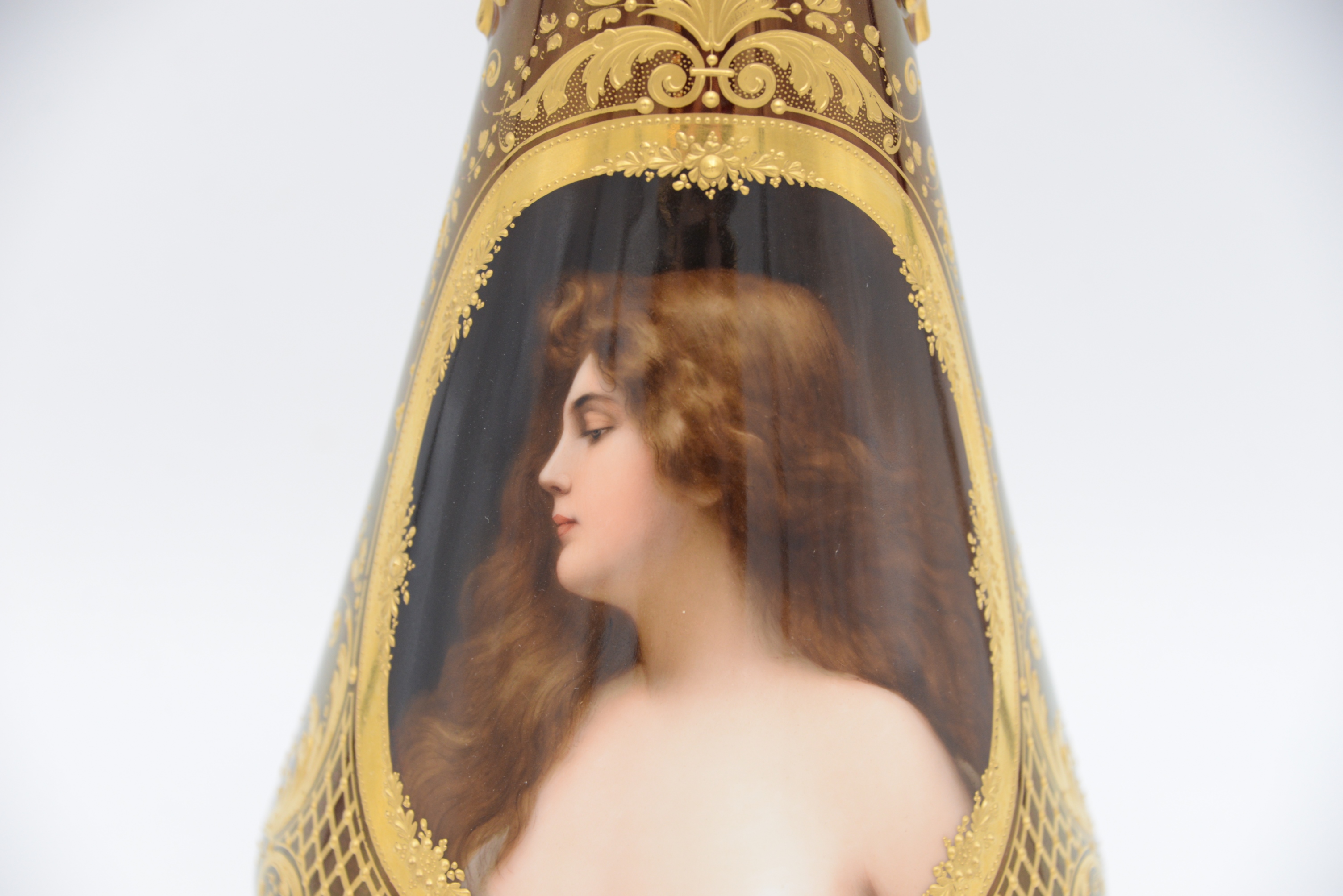 Royal Vienna Portrait Vase, having two handles, signed “Donath” lower left, Royal Vienna beehive stamp on reverse along with “Germany” and title, “Erbuta”, height 13 3/4 inches.