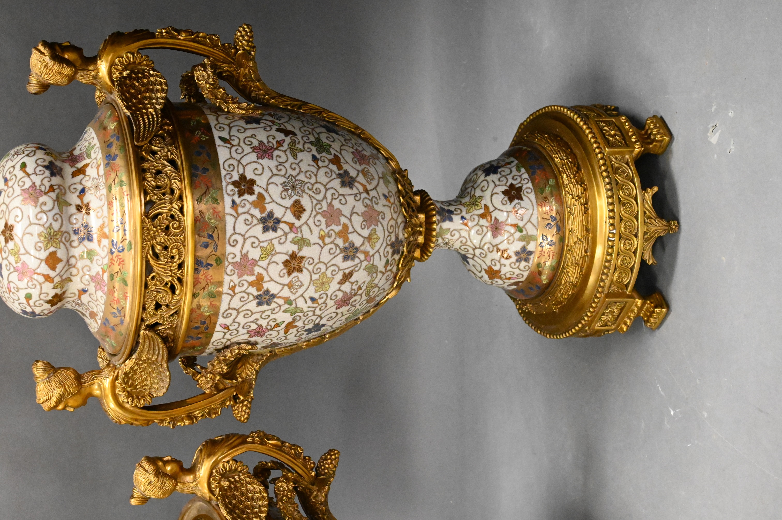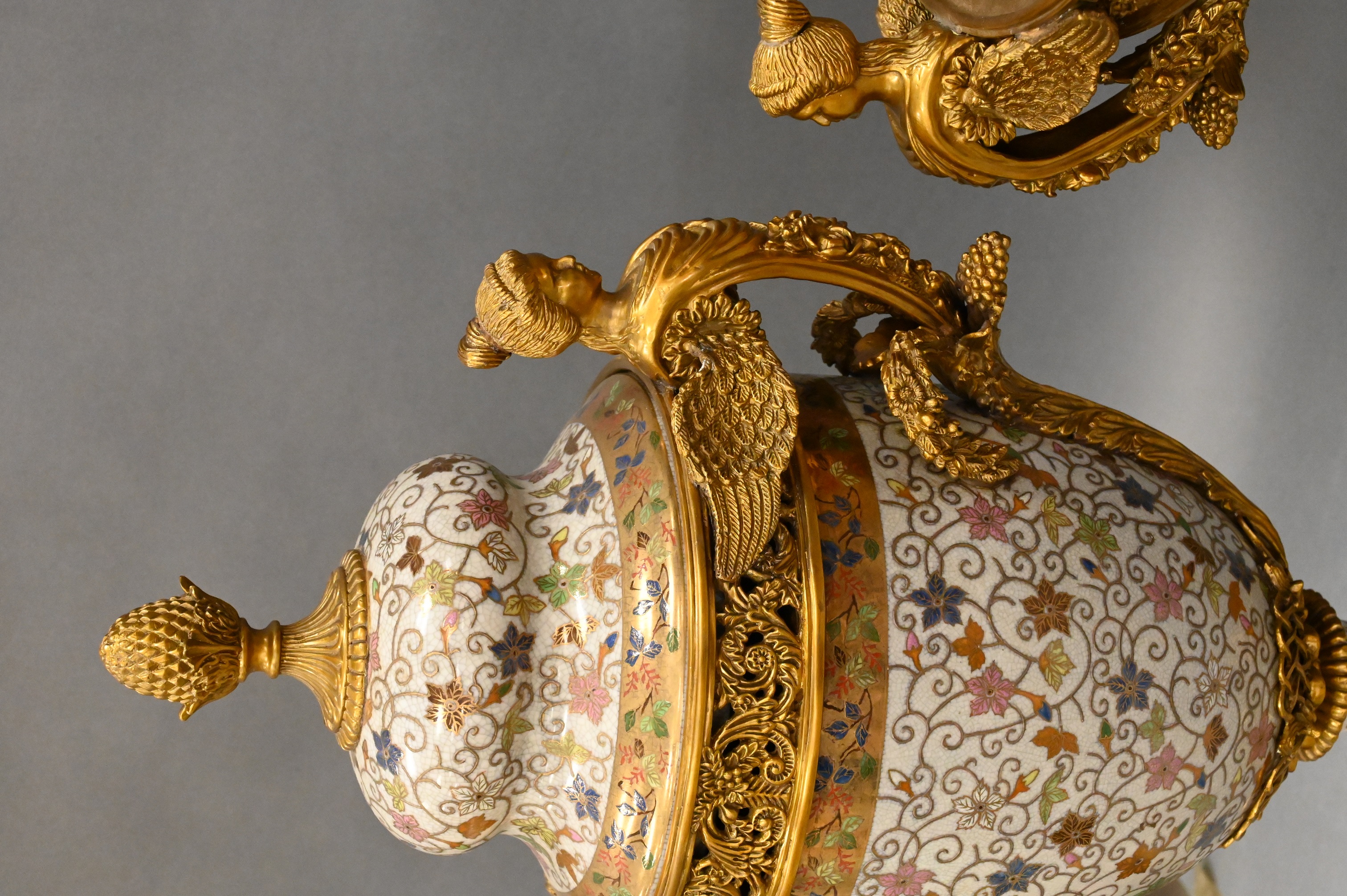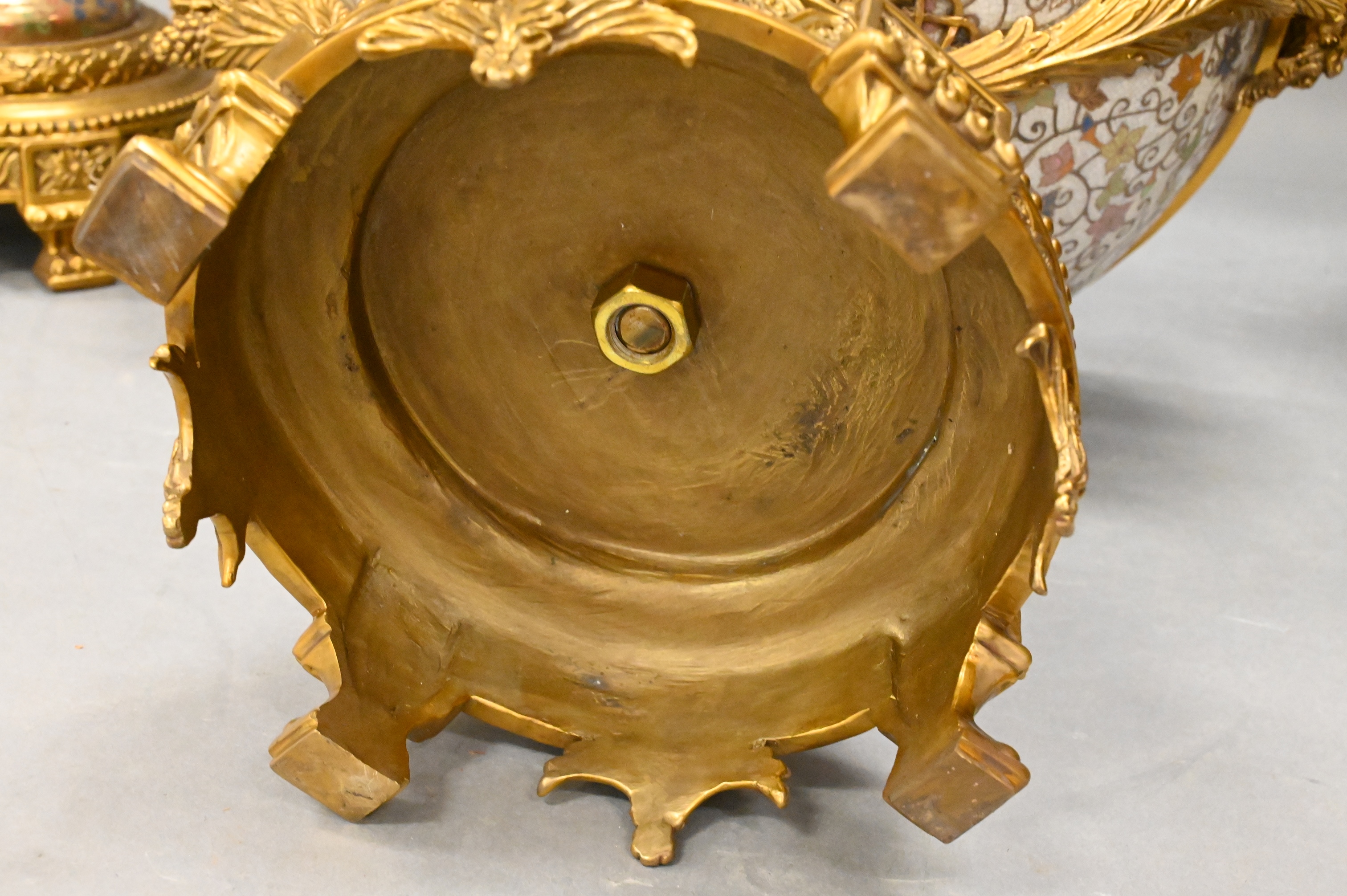 pair of covered urns along with a footed center bowl, all having gilt bronze figural mounts on circular bronze base and claw feet