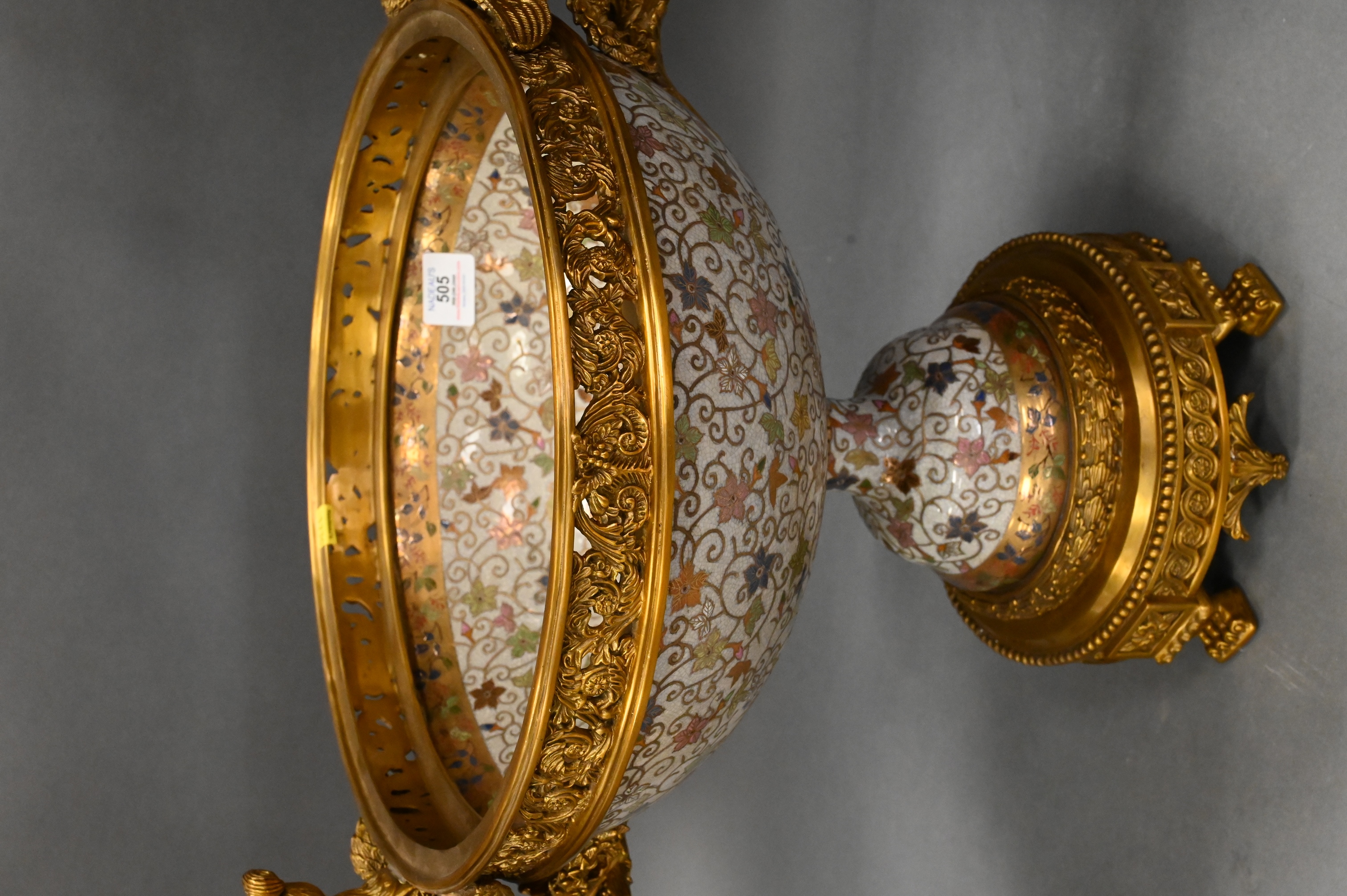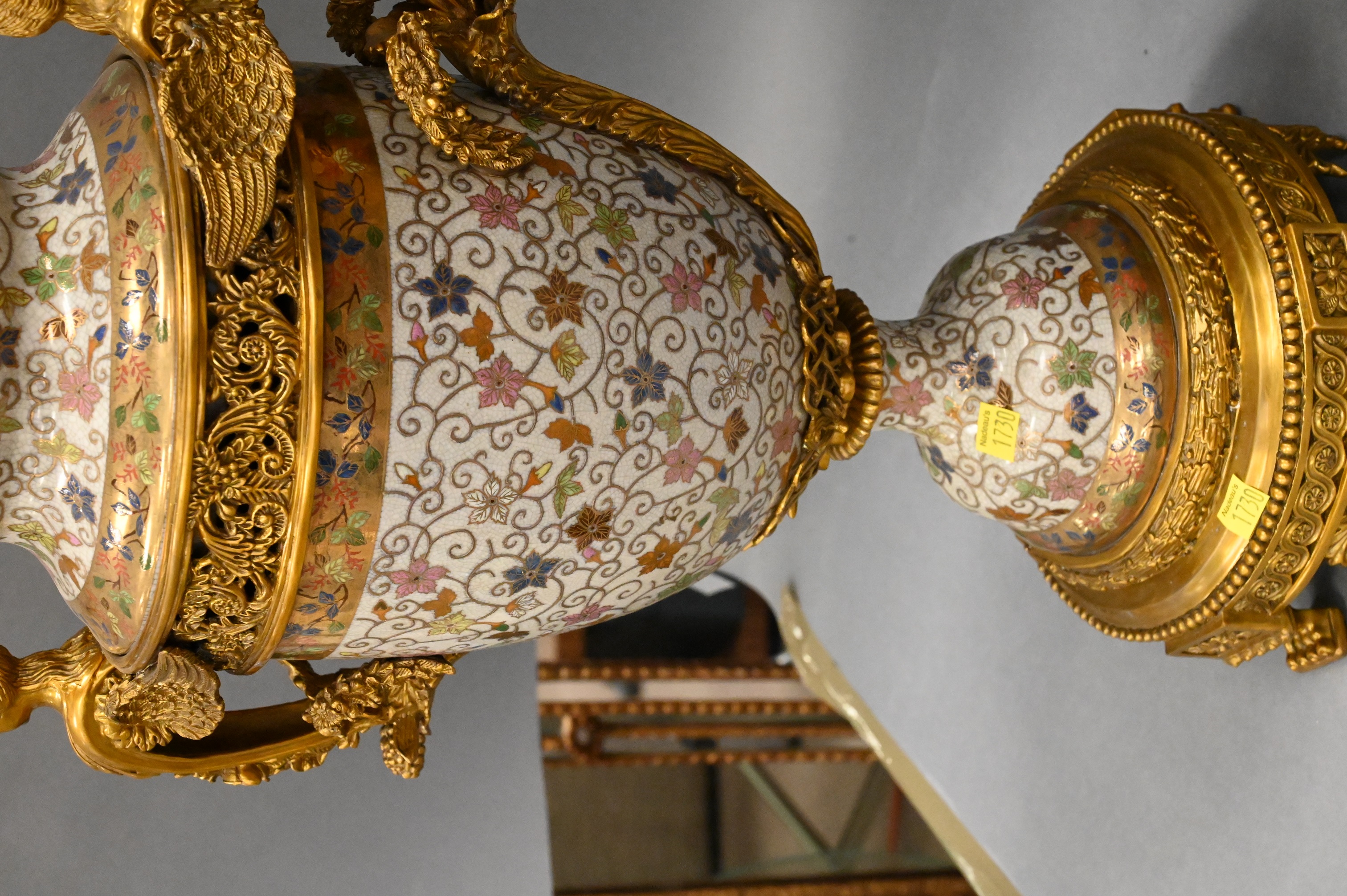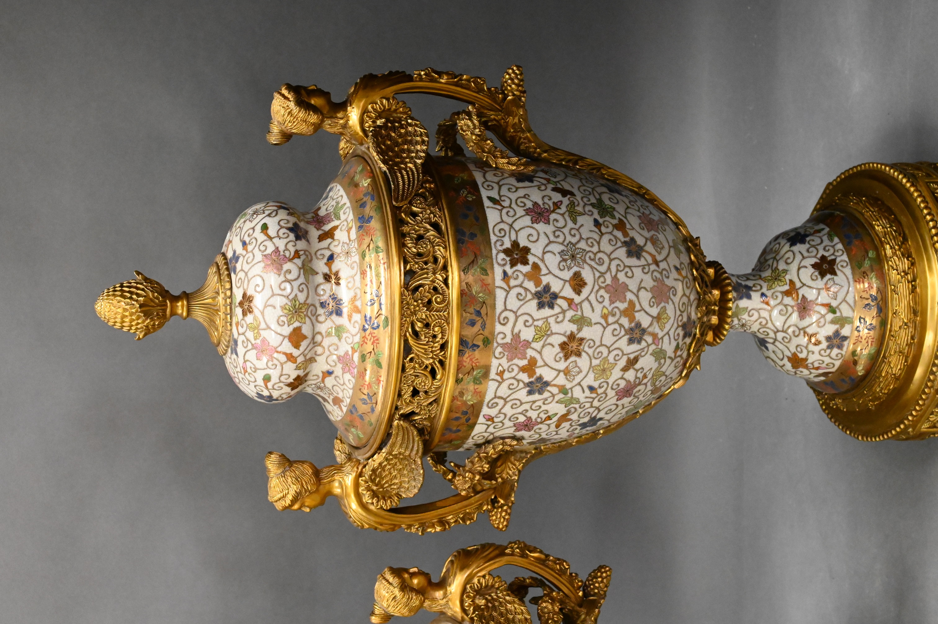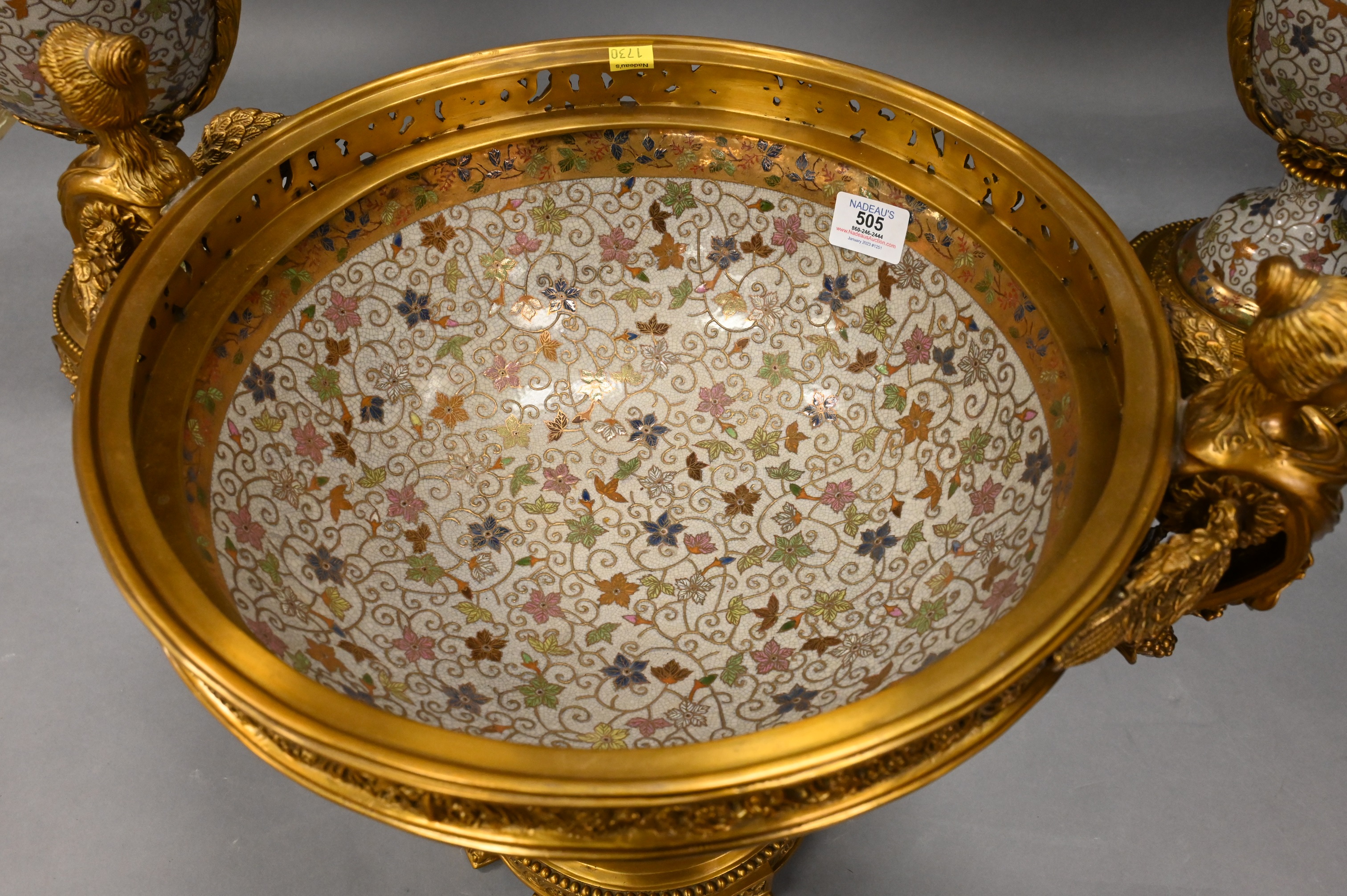 pair of covered urns along with a footed center bowl, all having gilt bronze figural mounts on circular bronze base and claw feet