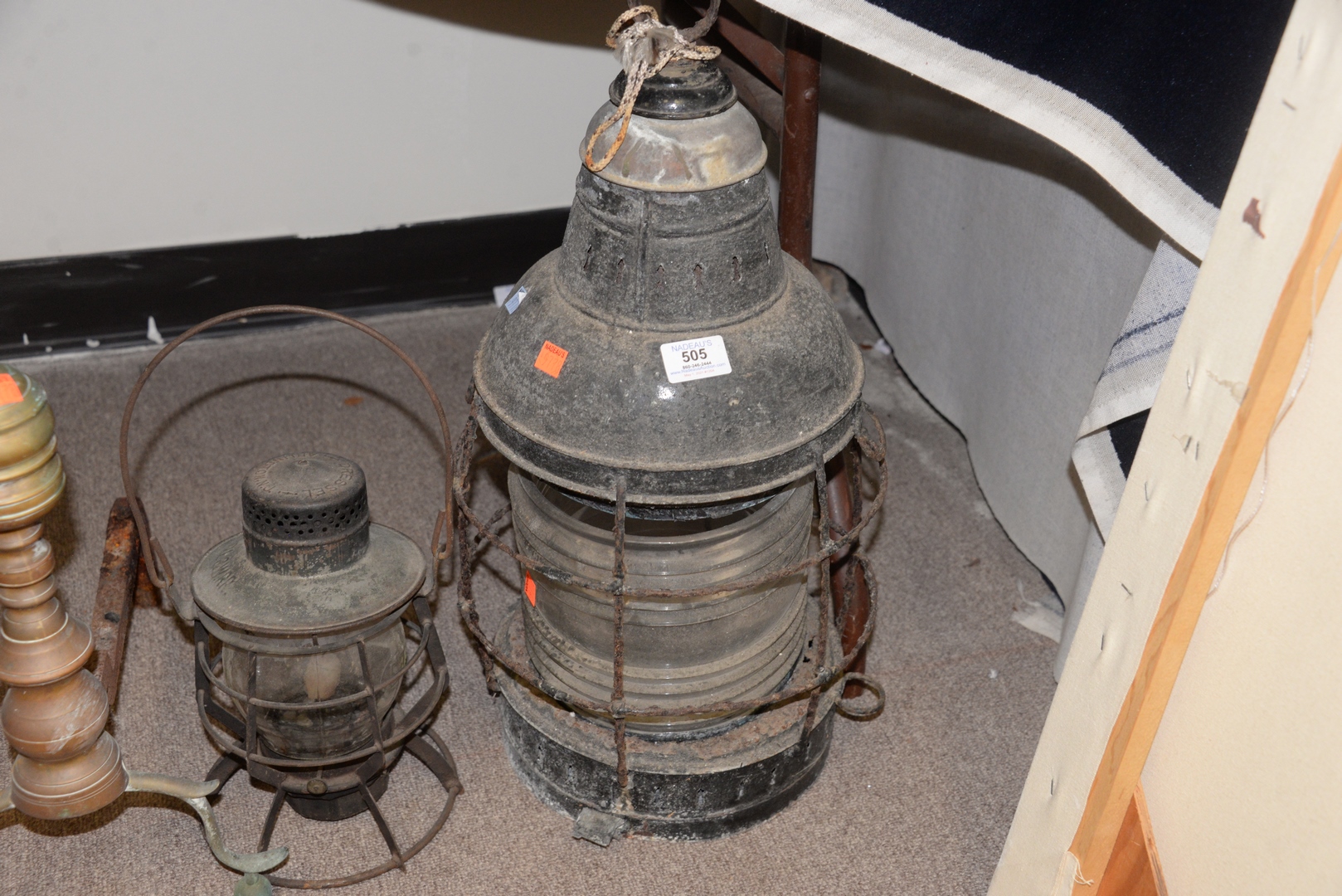 Lot 505: Three Piece Lot, to include two lanterns; one marked CRR of New Jersey, one ships lantern, along with pair of Federal brass andirons, length 22 inches. Provenance: From a Newport, Rhode Island historic home, in the same family since 1761.