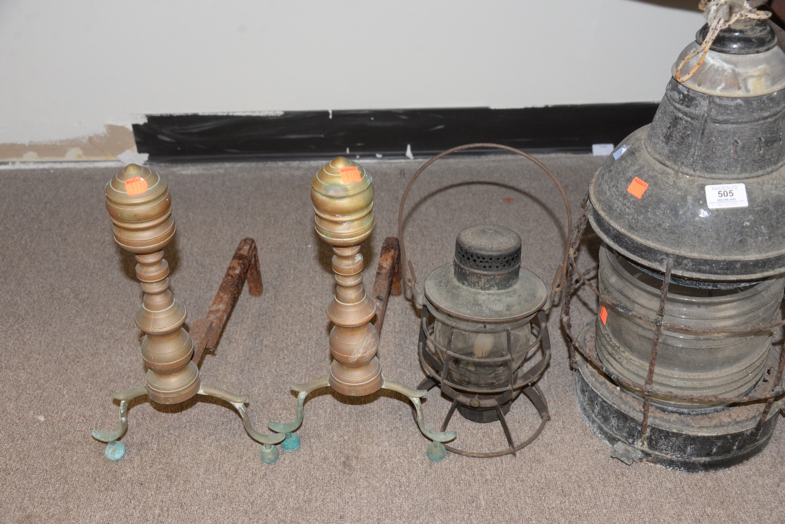Three Piece Lot, to include two lanterns; one marked CRR of New Jersey, one ships lantern, along with pair of Federal brass andirons, length 22 inches. Provenance: From a Newport, Rhode Island historic home, in the same family since 1761.