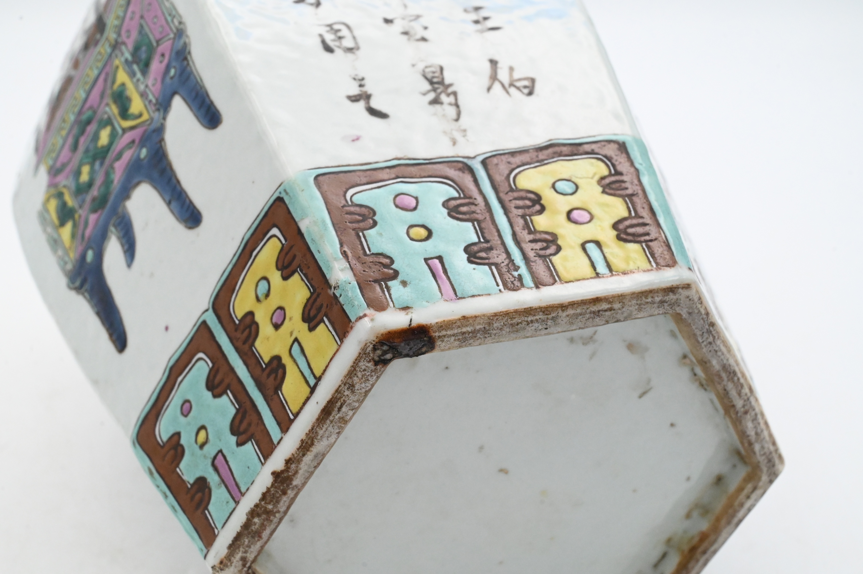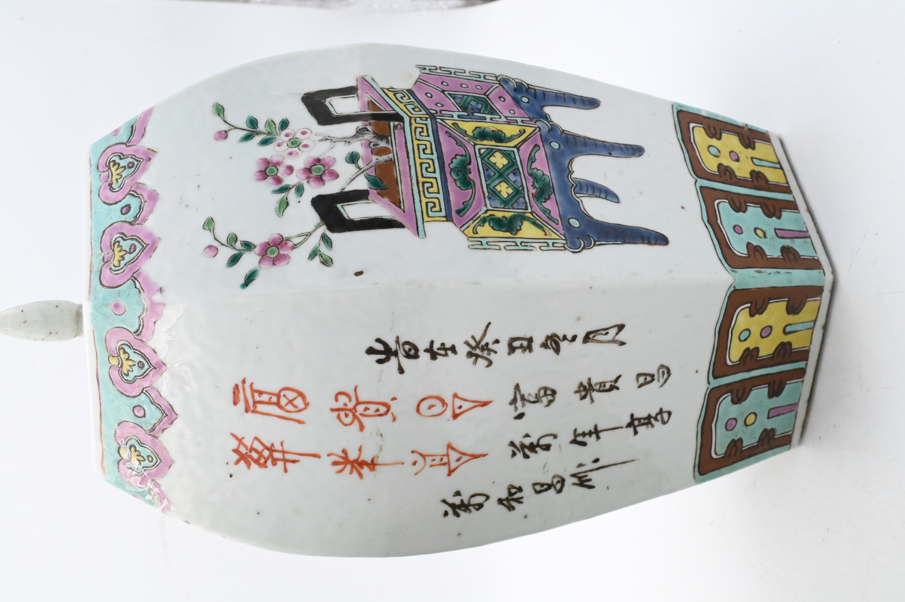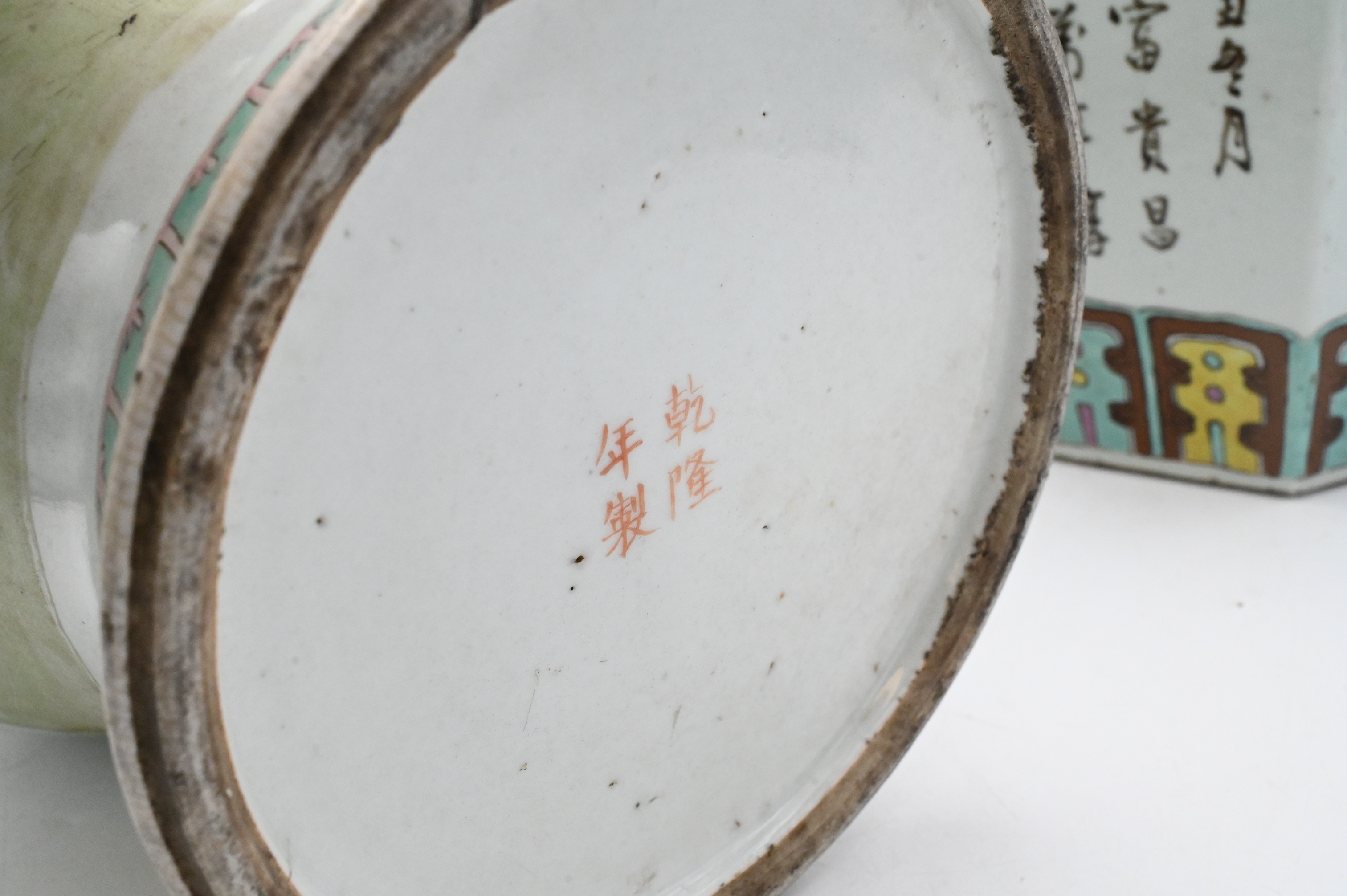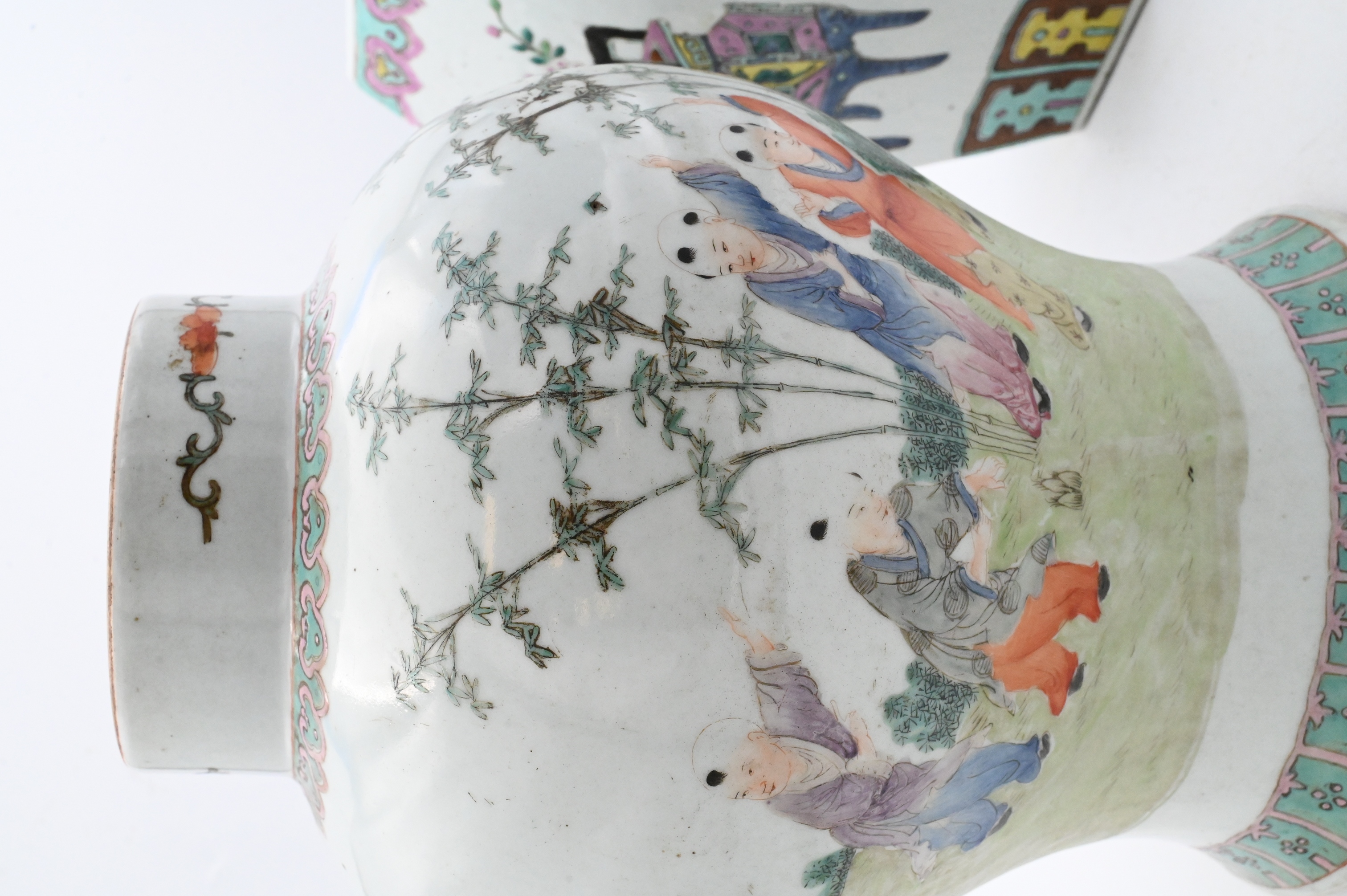 Republic style, one hexagonal covered jar painted with alternating panels of floral sprays, auspicious vases, and calligraphy, together with a baluster jar decorated in famille rose enamels with a continuous scene of children at play in a garden, with turquoise borders at foot and shoulder.