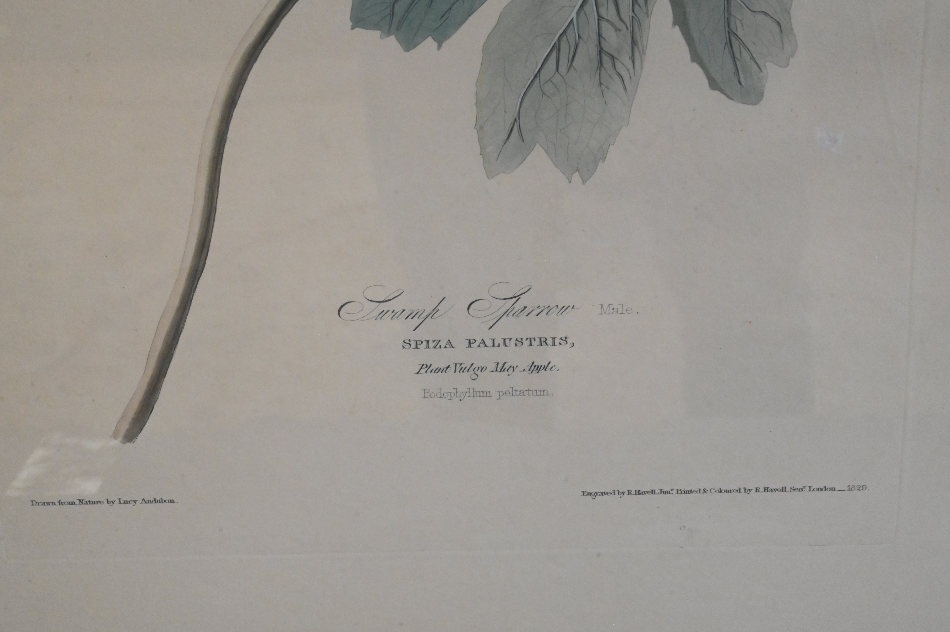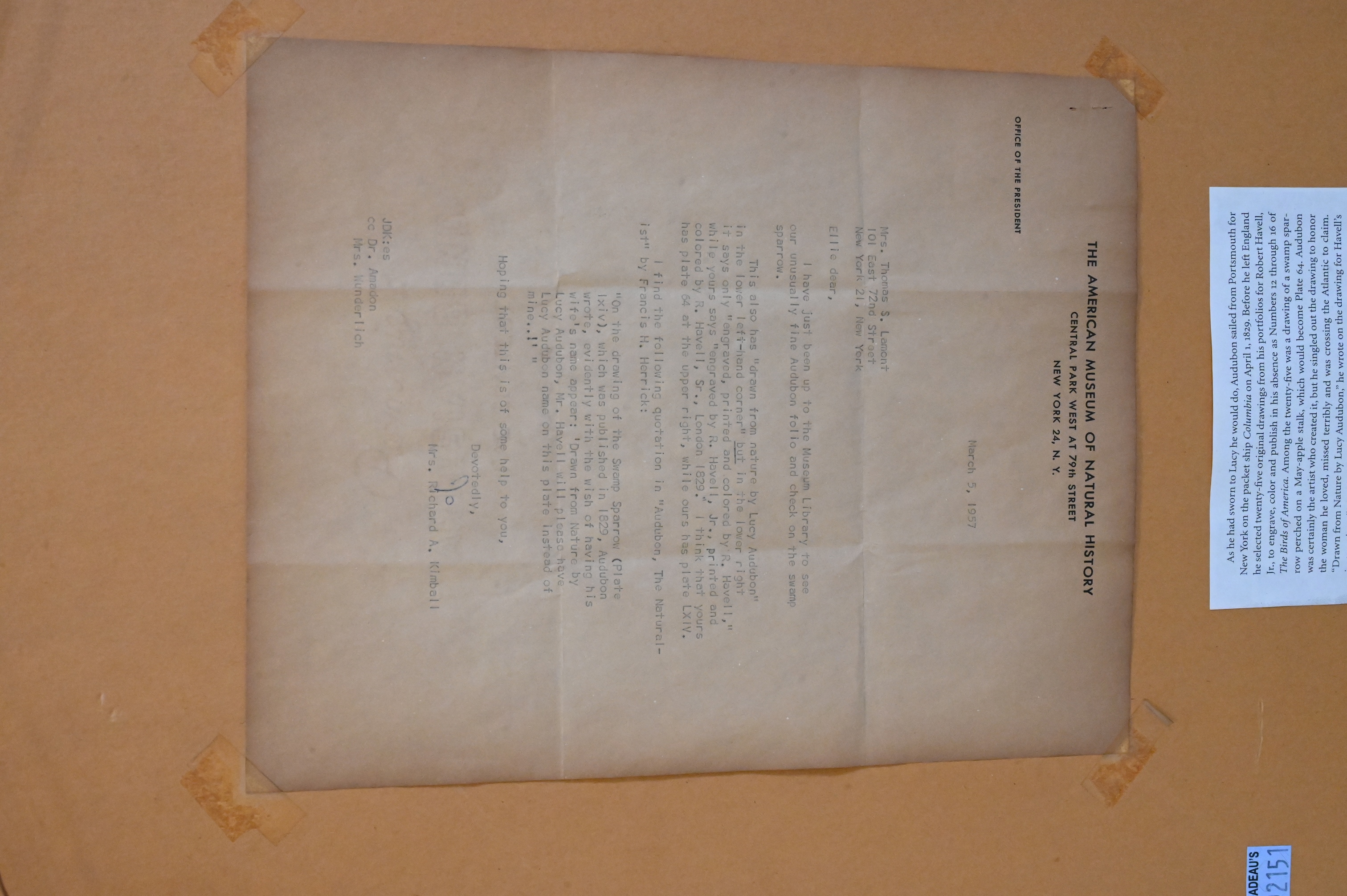 Literature: “Audubon, The Naturalist” by Francis H. Herrick, “On the drawing of the Swamp Sparrow,Audubon wrote…Mr. Havell will please have Lucy Audubon’s name on the plate instead of mine!!”