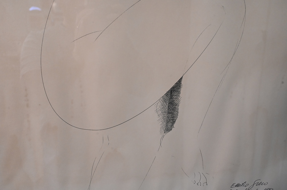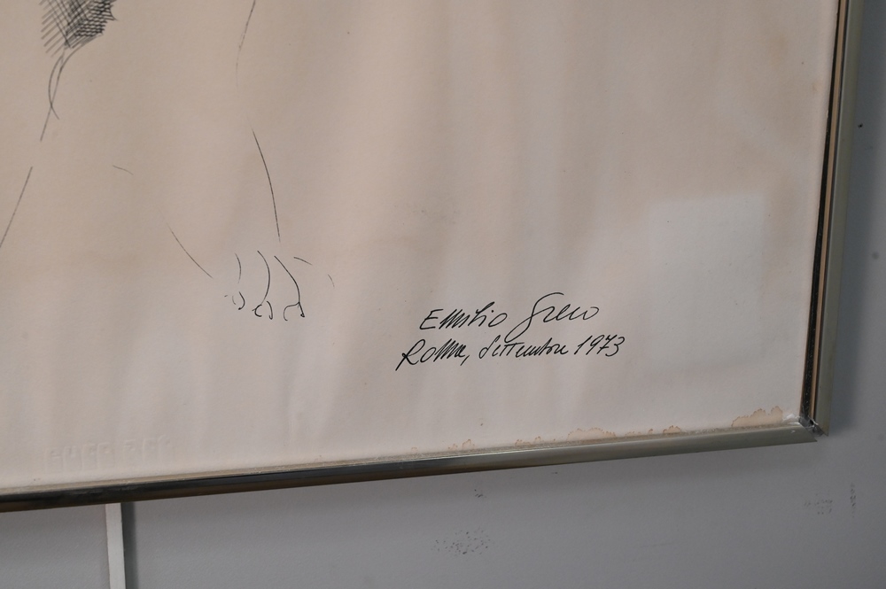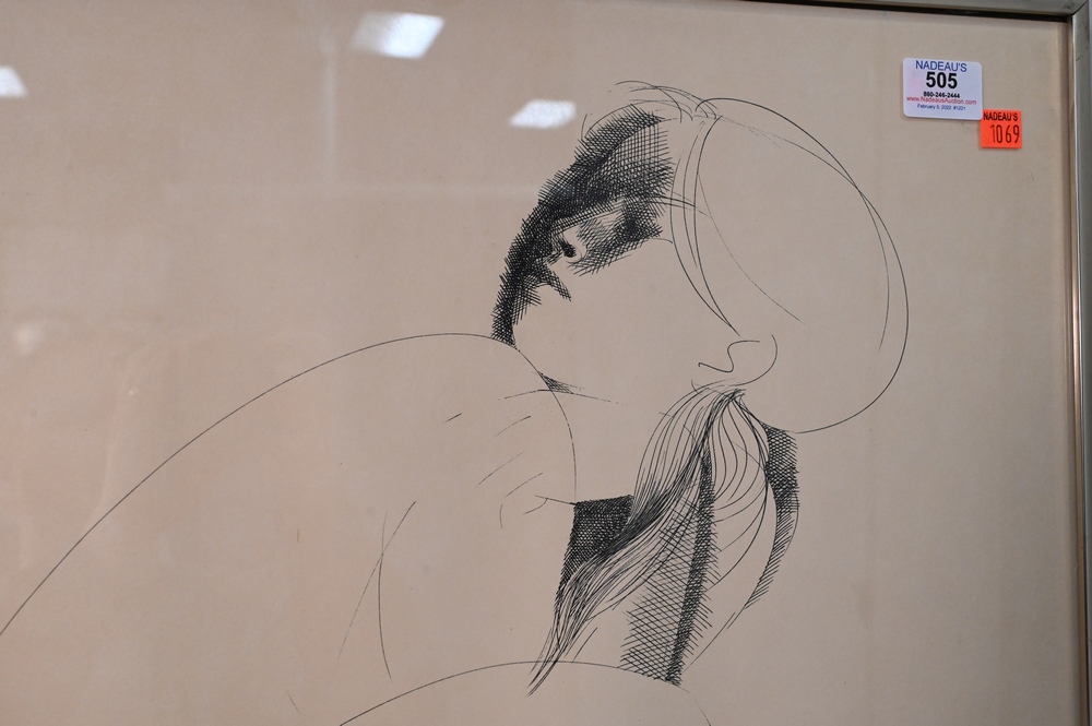 Lot 505: Two piece lot, to include Emilio Greco (1913-1995), Nude Girl, pen and ink on paper, signed lower right Emilio Greco Roma 1973, along with large poster, pen on ink 27.5″ x 23.5″.
