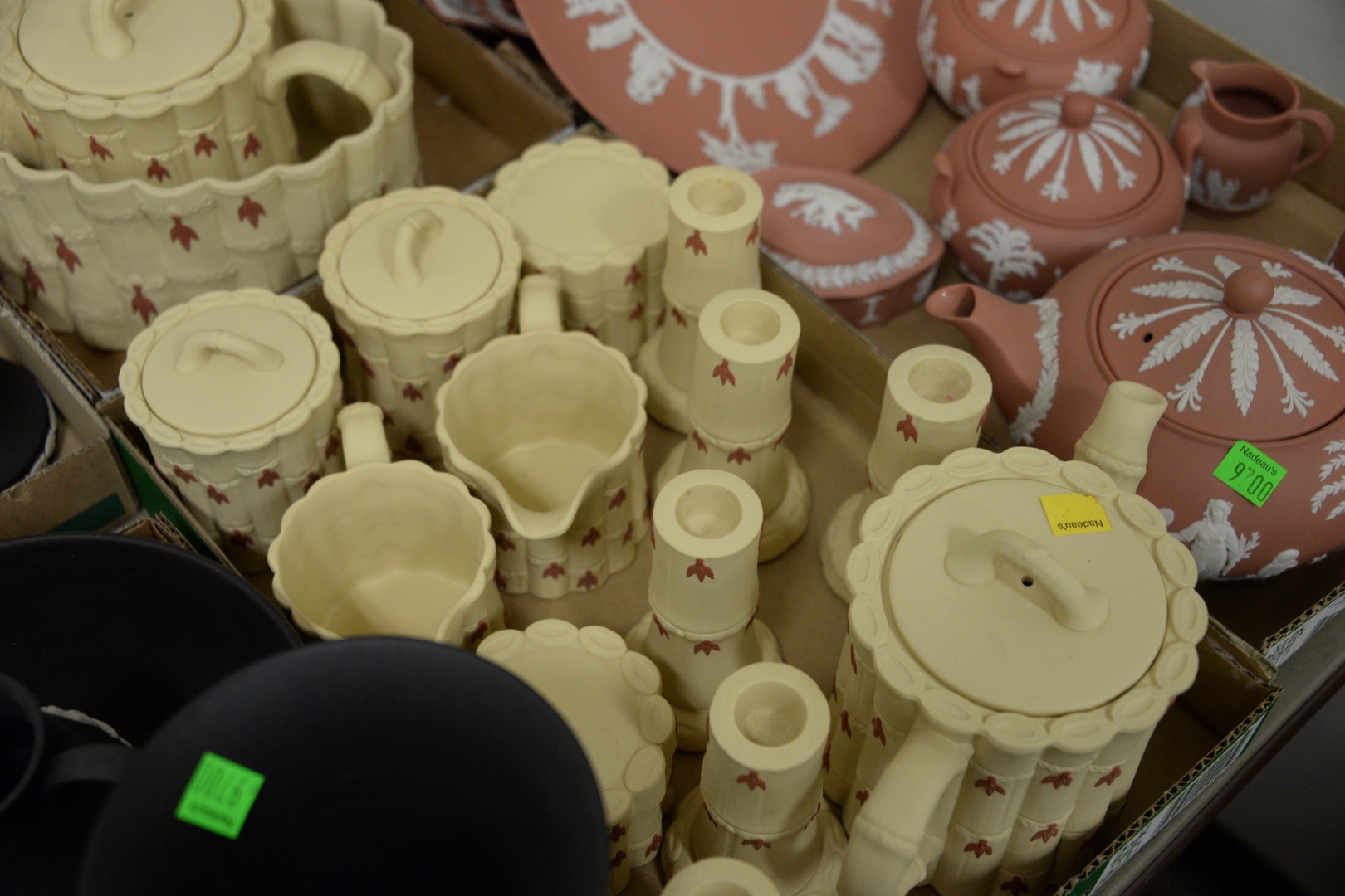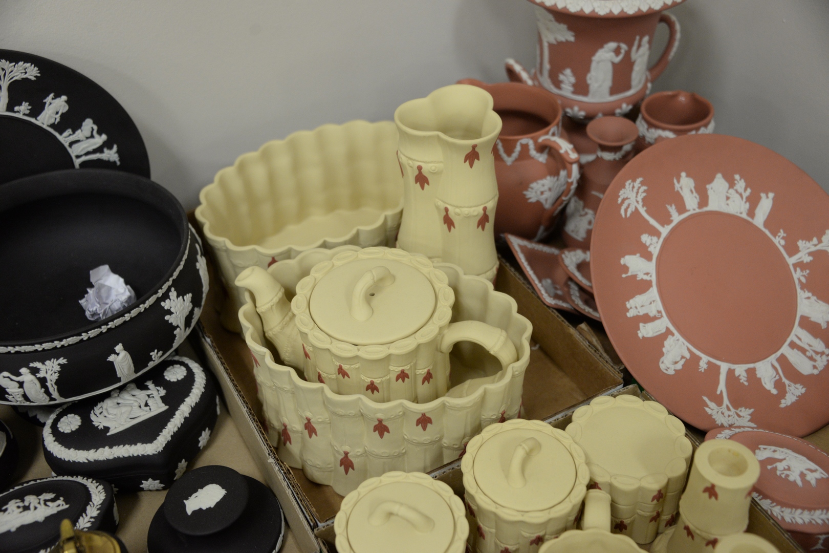 Lot 505: Two Tray Lots of Wedgwood Jasperware “Primrose” Pieces, to include candlesticks, two – 4 piece tea sets, vase, along with two center dishes in the form of bamboo. Provenance: Estate of James Wadhams