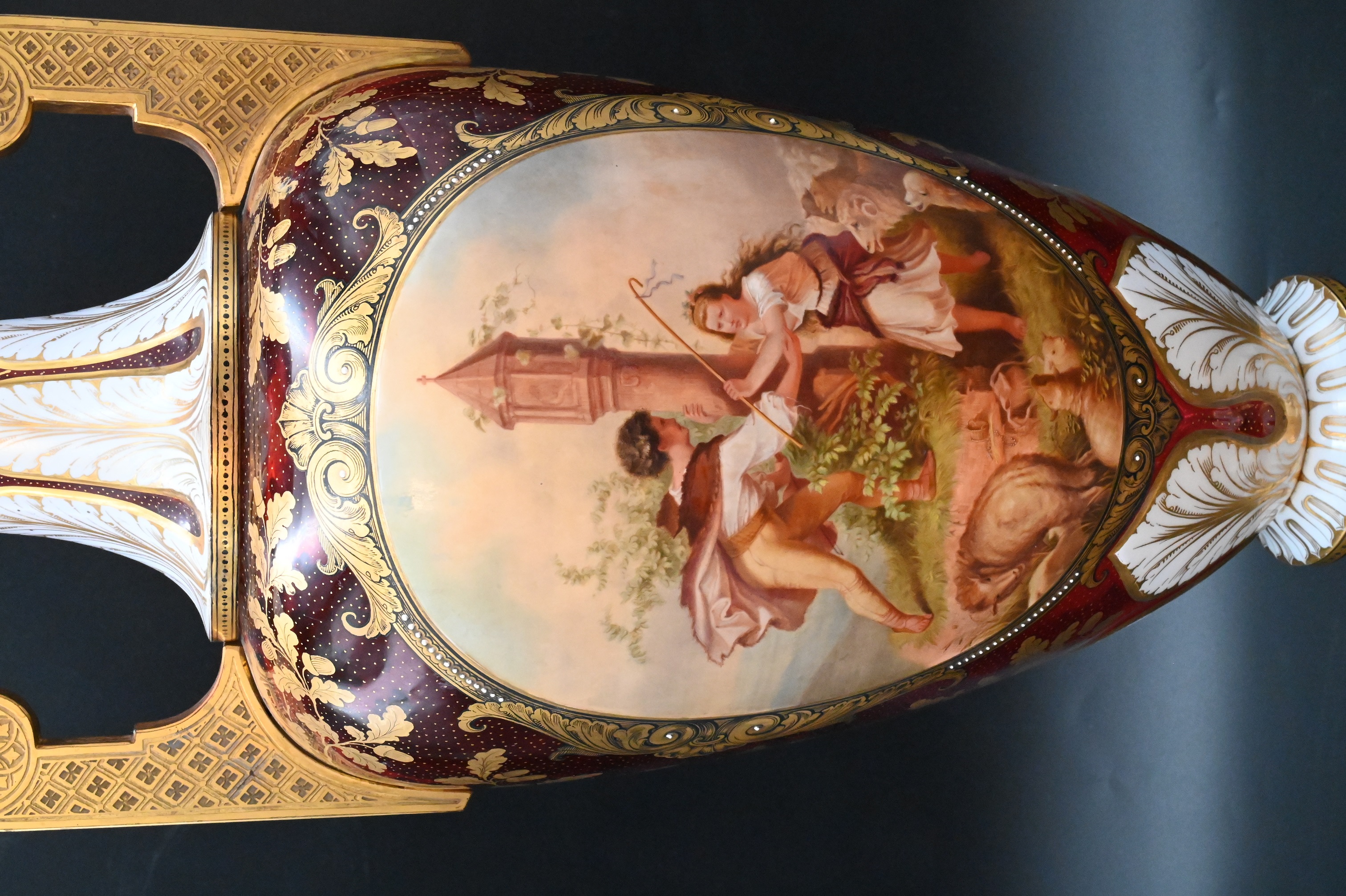 having applied gilt porcelain handles and oval pattern scene of man and shepherdess with her sheep, two parts having small vase insert