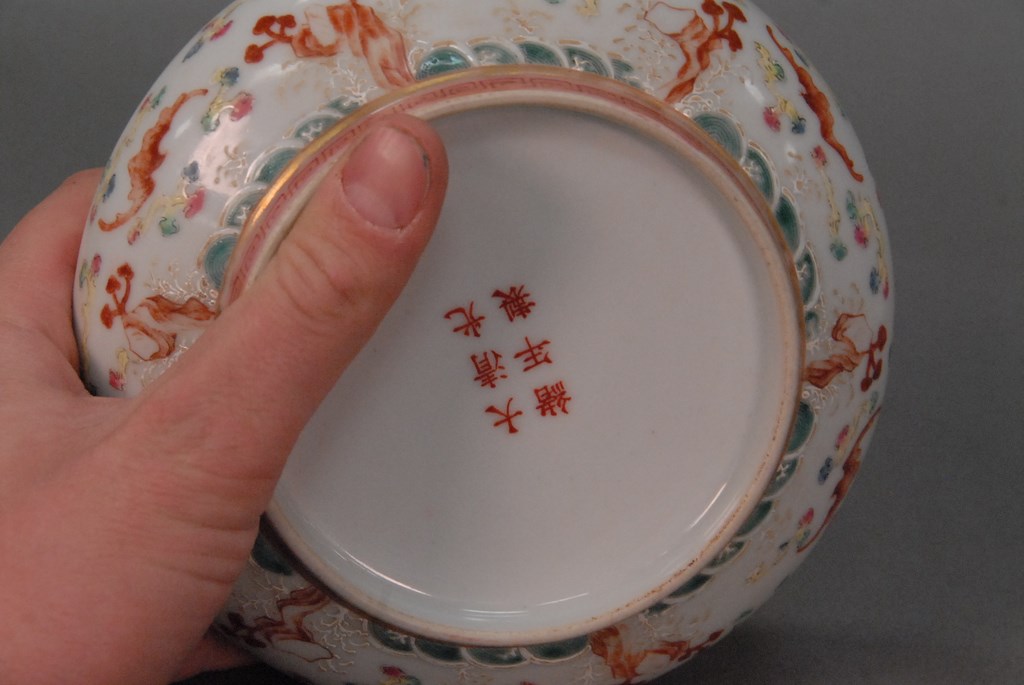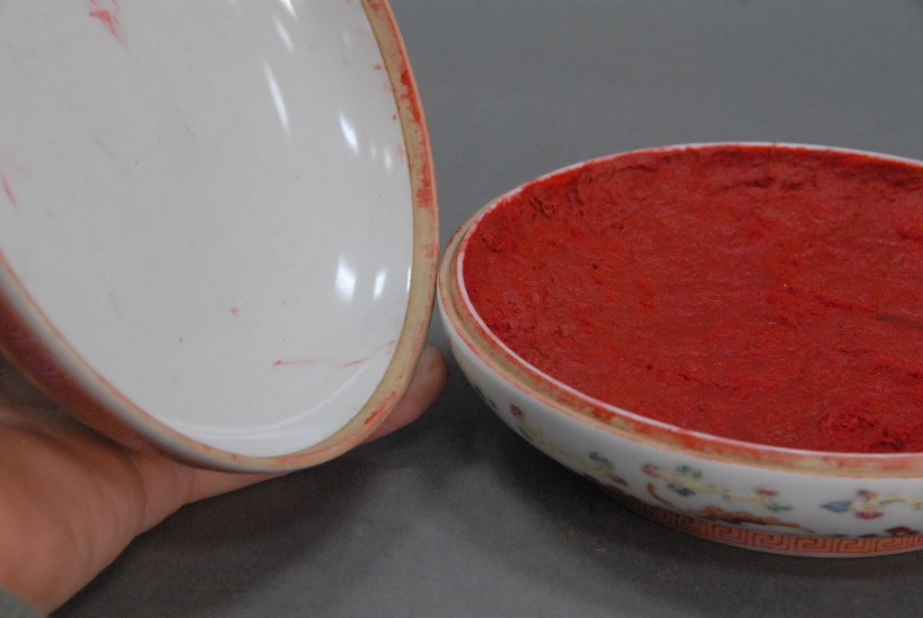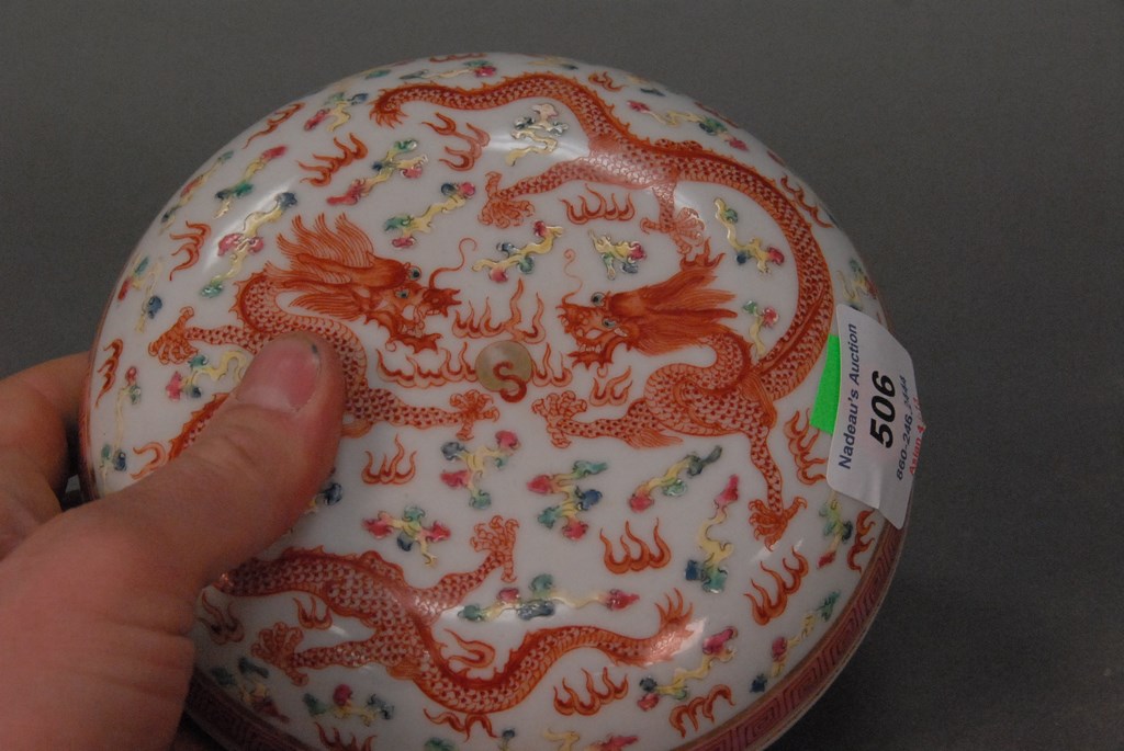 Lot 506: Guangxu porcelain five claw dragon wax seal box in circular form having two fighting five claw dragons with flaming clouds, red Guan…