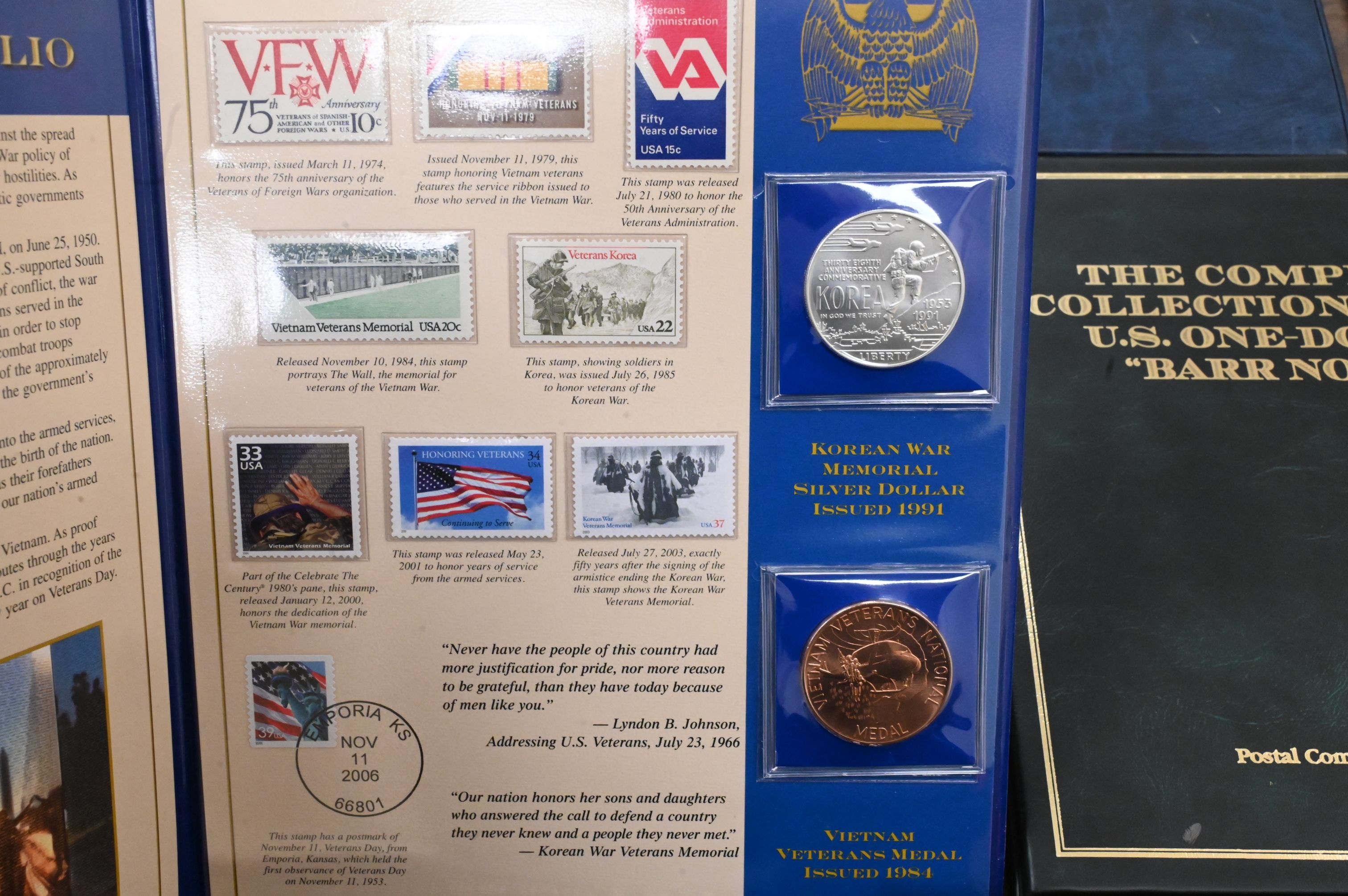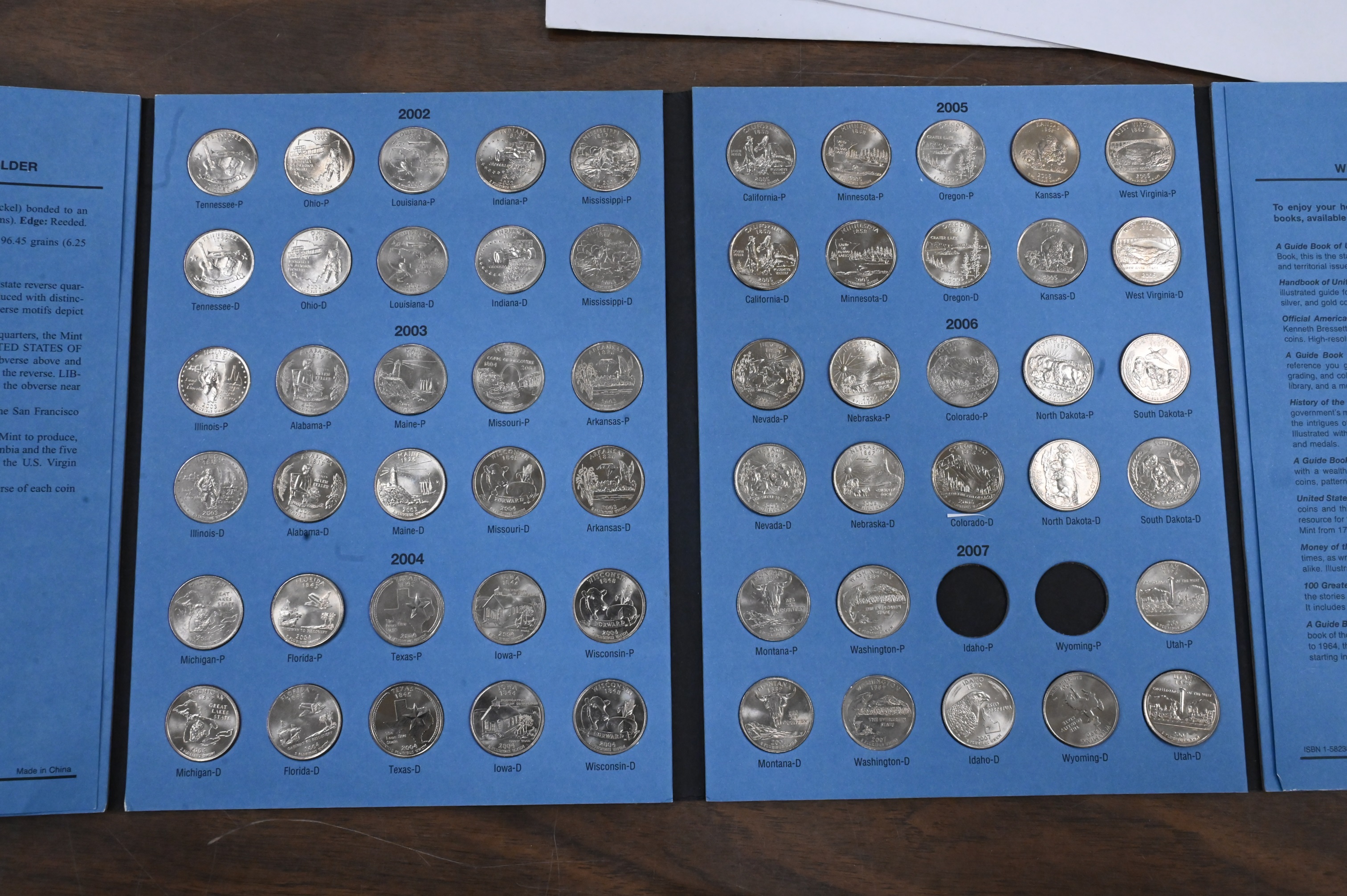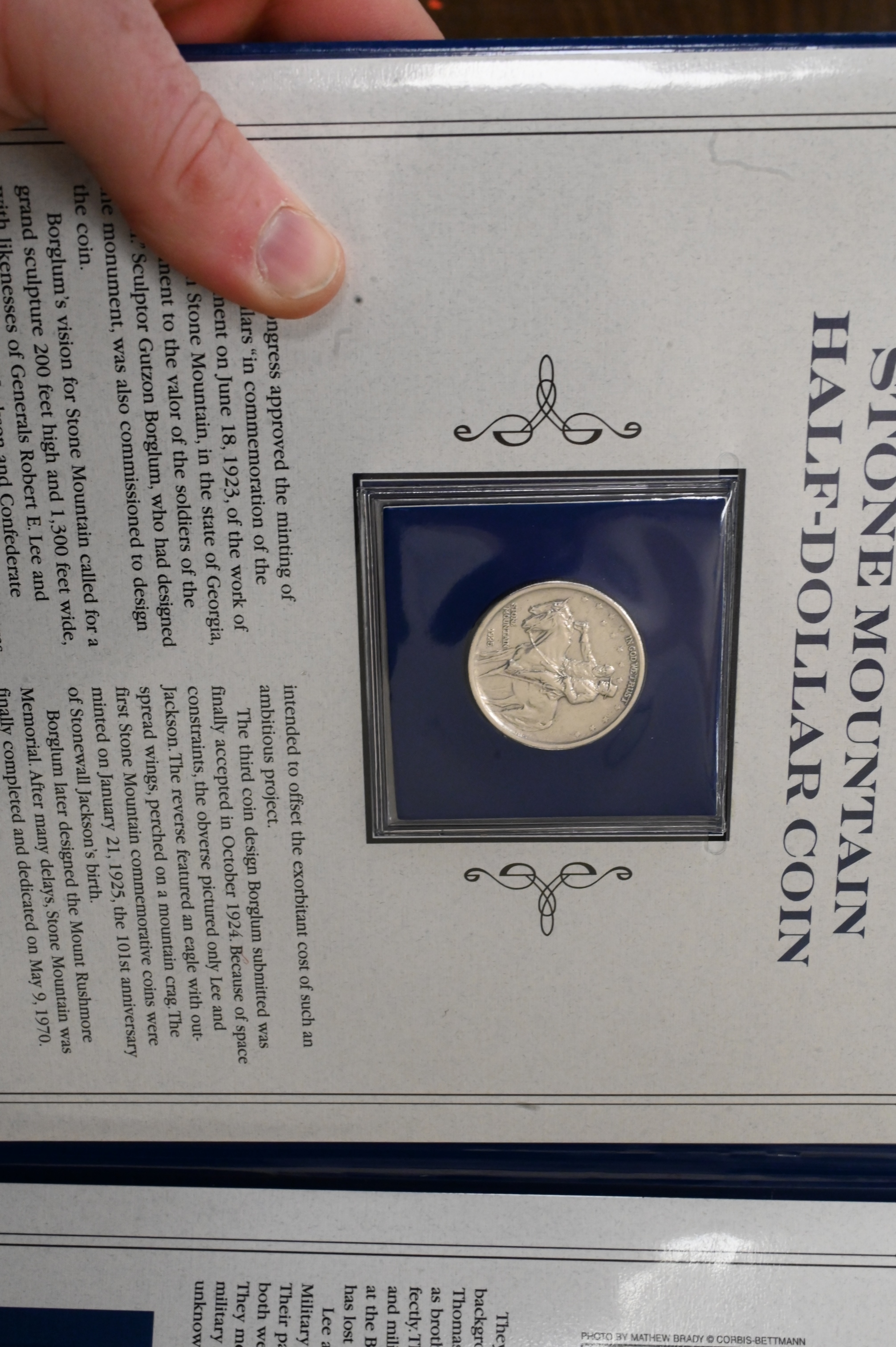 Large Lot of Partial Albums, to include 9 U.S. commemorative proof $1, 105 Statehood quarter album all unc. Korean commemorative, 5 federal $1 notes, 2 ike sets, one stone mountain commemorative, coinage of cook islands 1981 proof set, 2 confederate notes .25 cents and 10 dollar, three envelopes of unc quarters