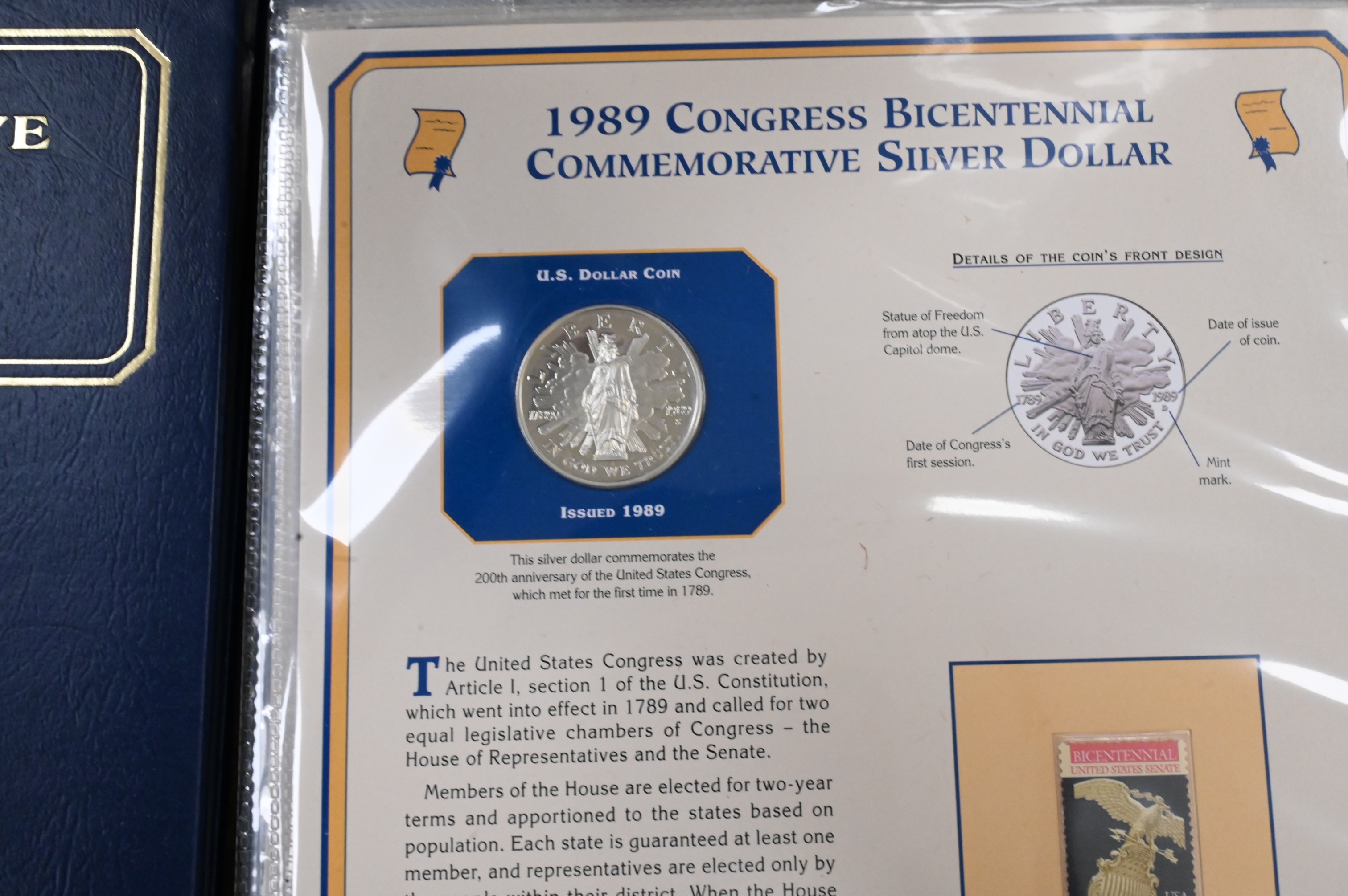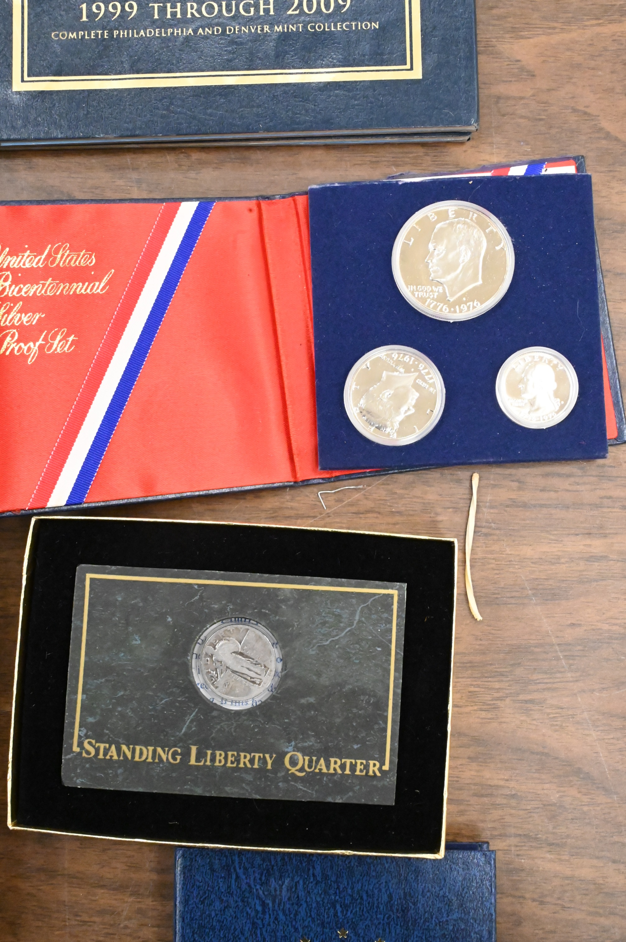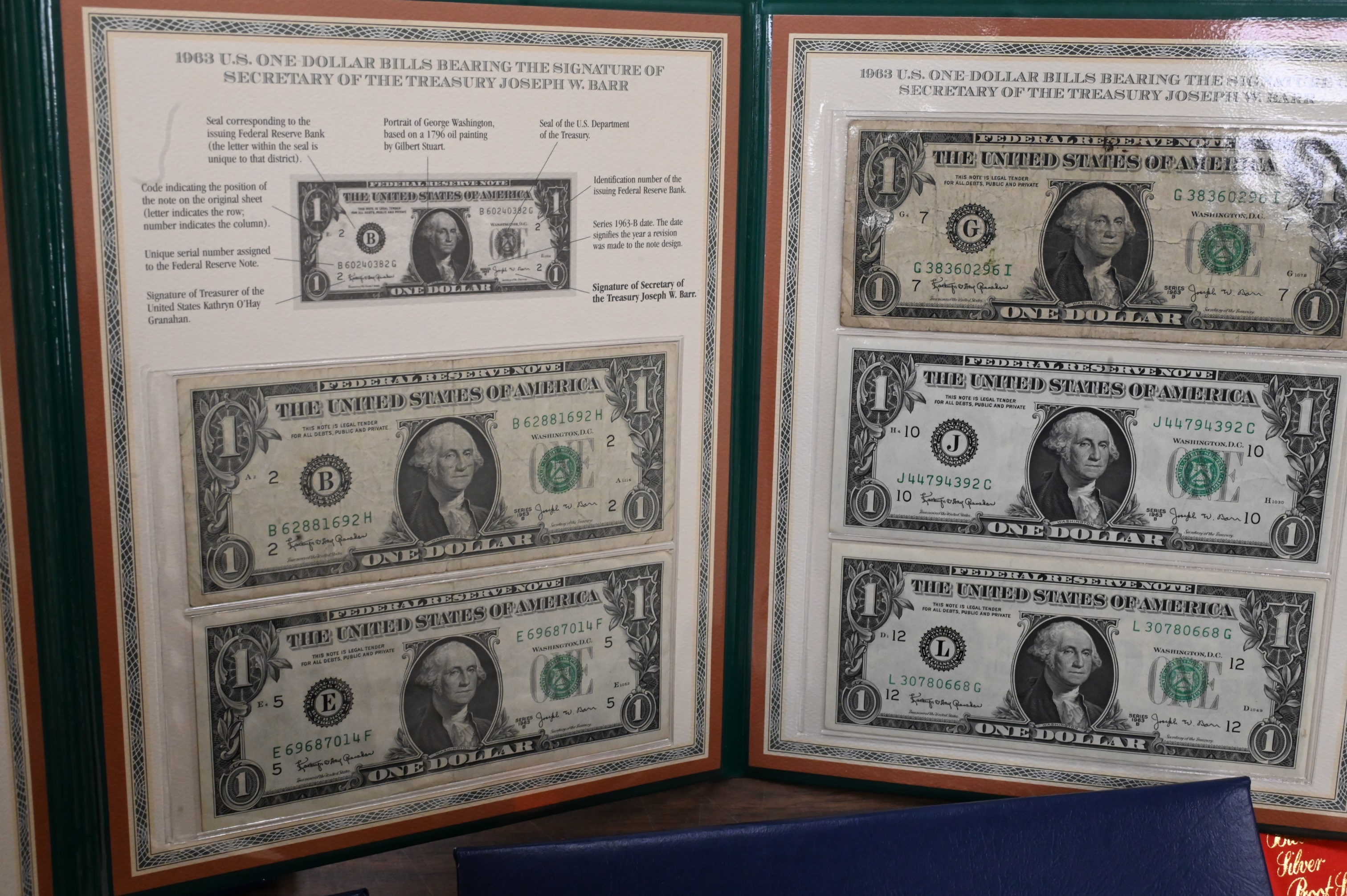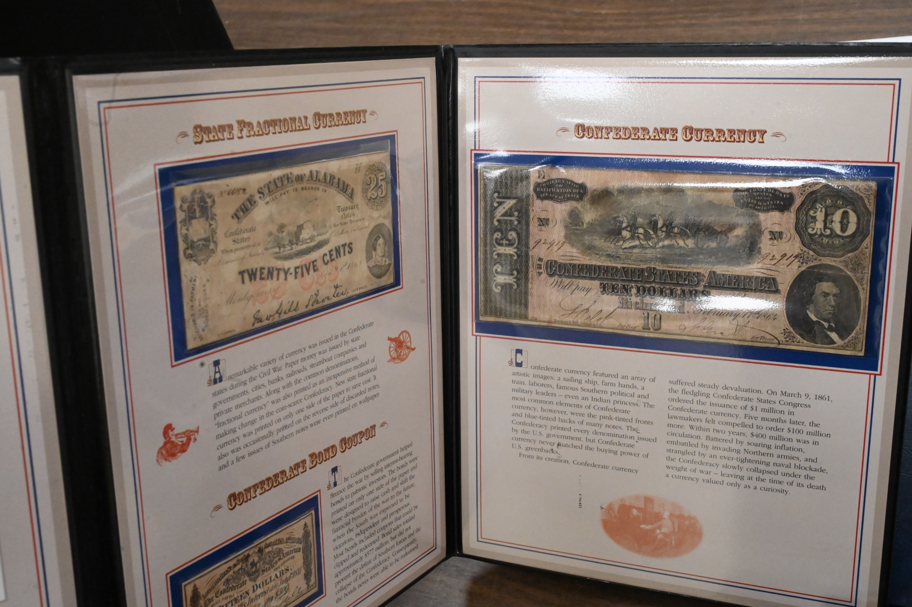 Large Lot of Partial Albums, to include 9 U.S. commemorative proof $1, 105 Statehood quarter album all unc. Korean commemorative, 5 federal $1 notes, 2 ike sets, one stone mountain commemorative, coinage of cook islands 1981 proof set, 2 confederate notes .25 cents and 10 dollar, three envelopes of unc quarters