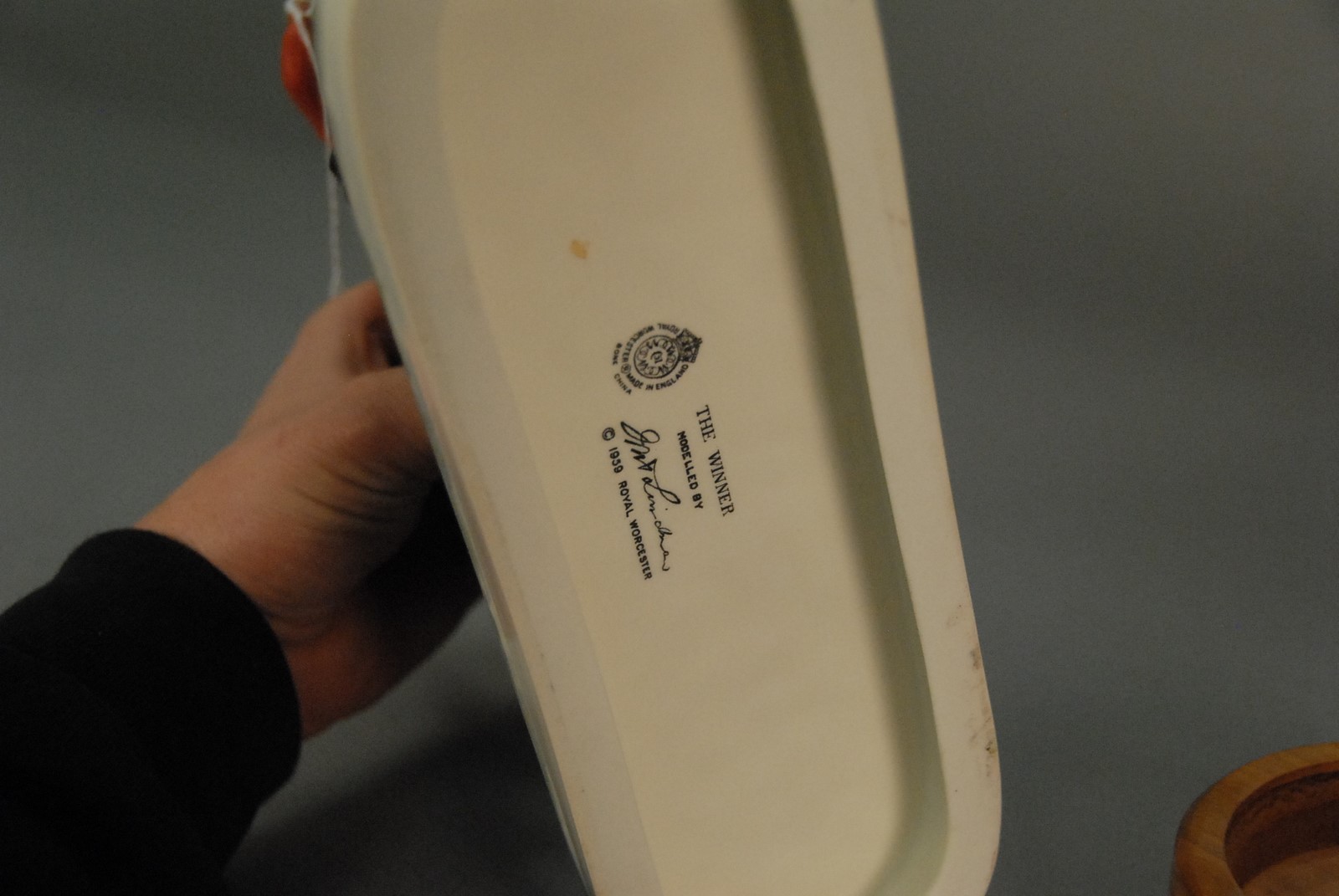 Royal Worcester horse and jockey on wood base, marked on bottom The Winner #3, 1959. ht. 9 1/2 in. lg. 11 1/2 in. Provenance: Property from a Private Collection Sold for the Benefit of the Virginia Historical Society.