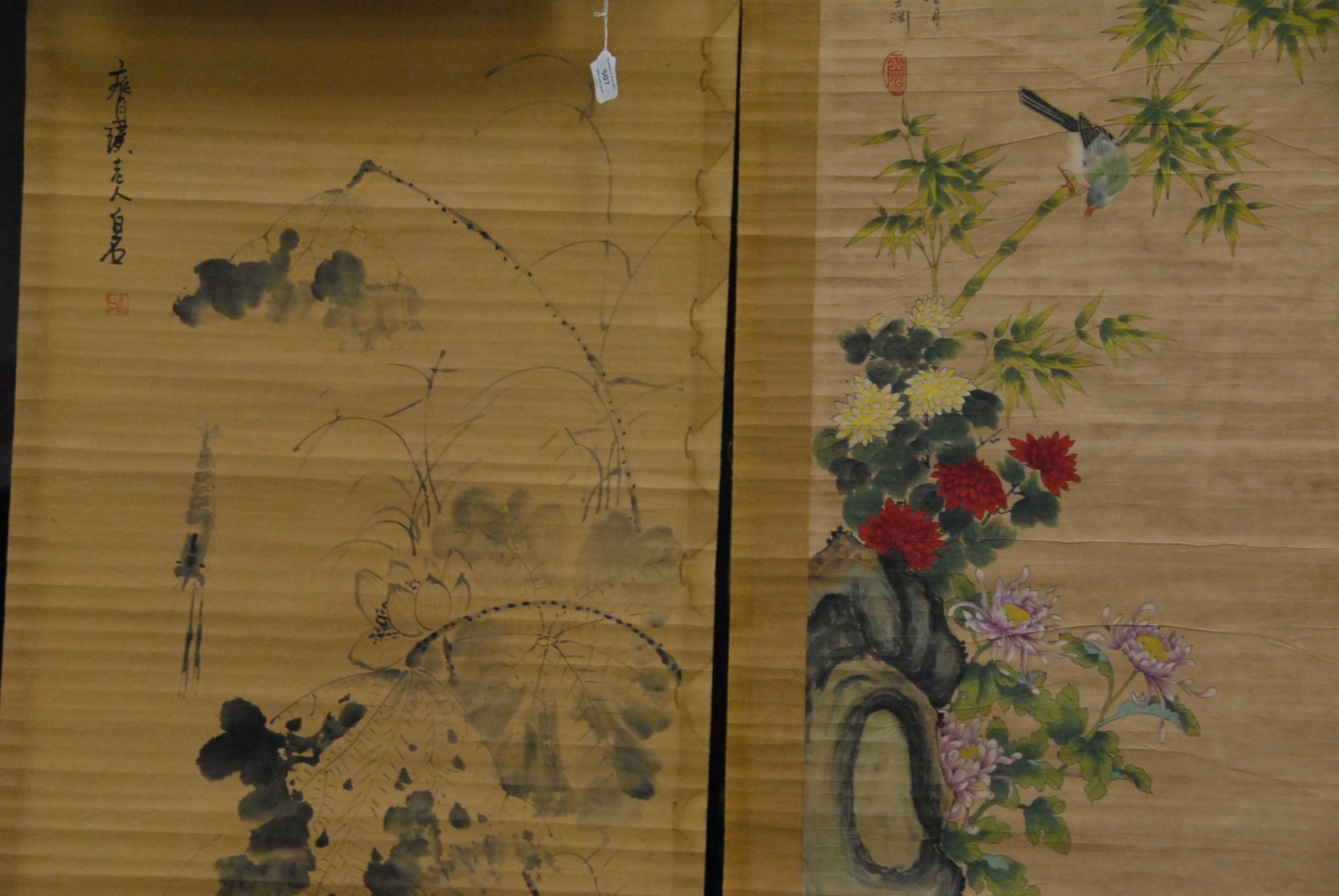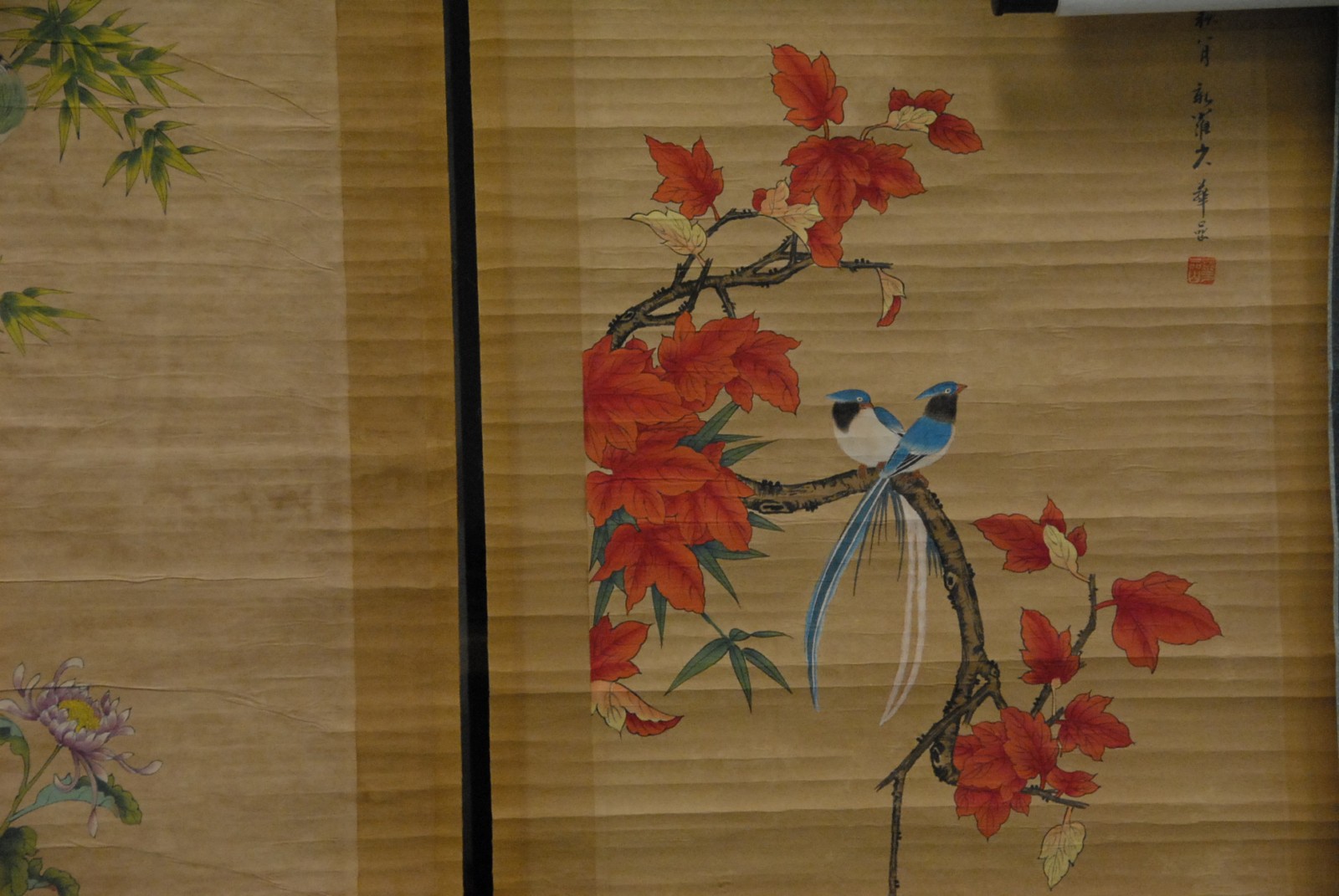 Three scrolls of flowers, birds, and bugs.