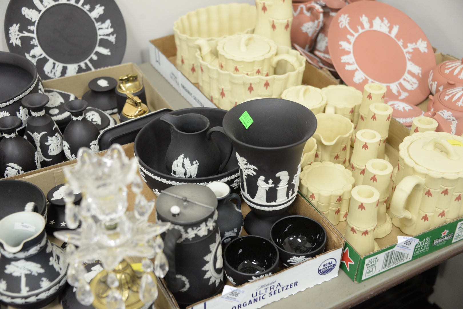 Lot 506: Three Tray Lots of black and white Wedgwood Jasperware, to include bowls, vases, pitchers, etc. Provenance: Estate of James Wadhams