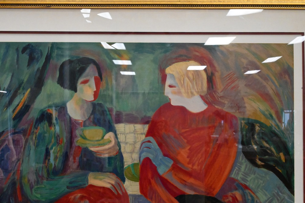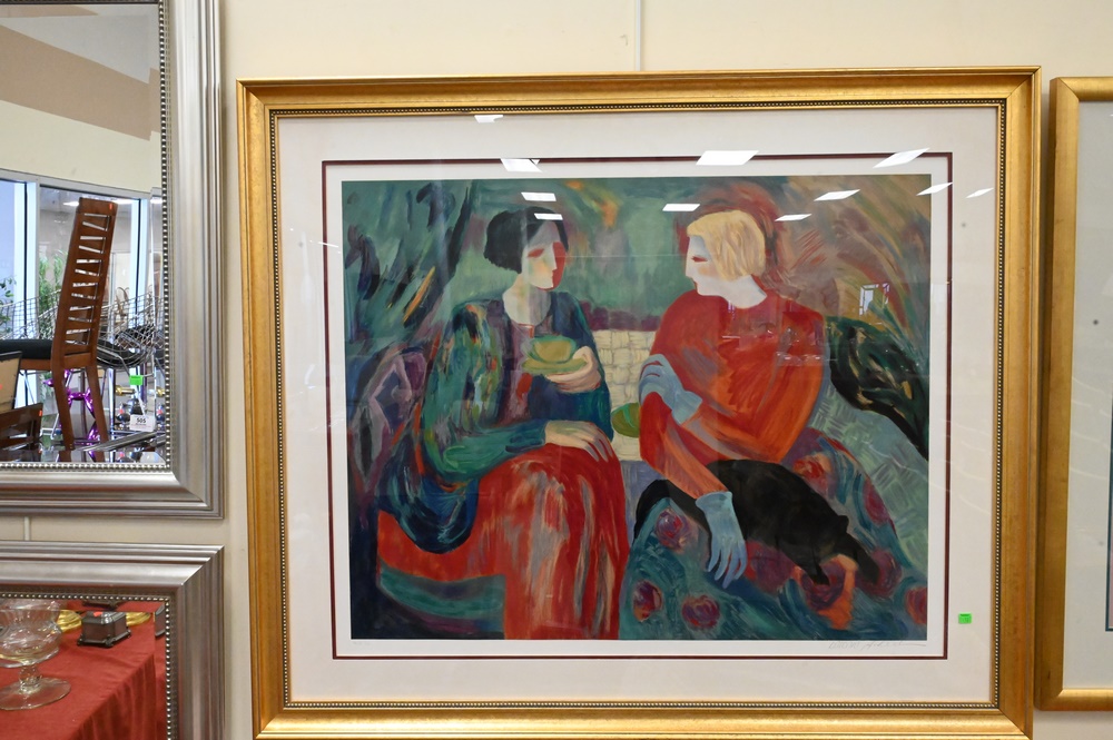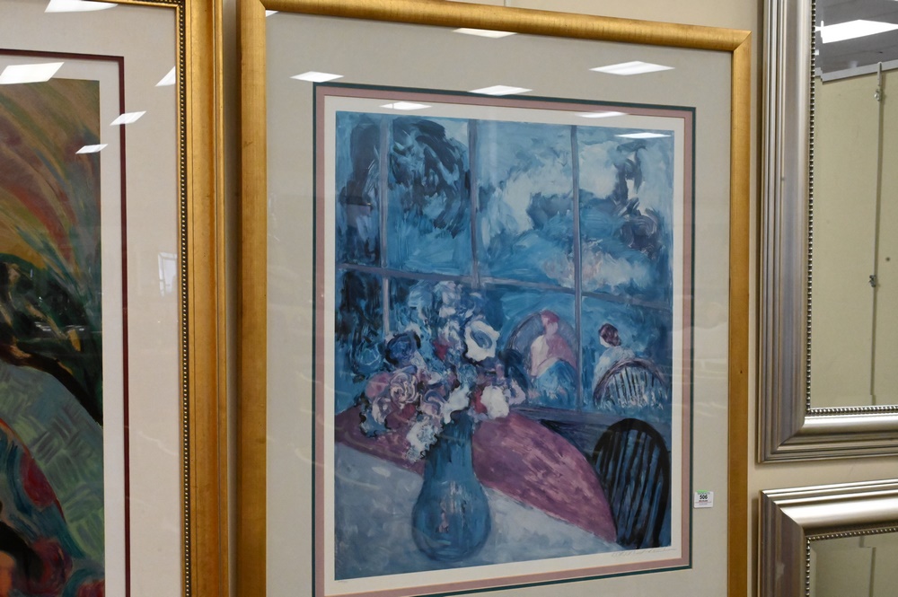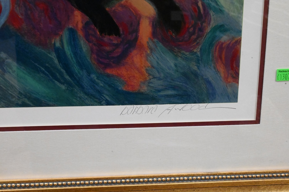 Two Barbara A. Wood (American, 20th C.), lithographs, still life of flowers numbered 626/975, along with two women having tea, artist proof, each pencil signed lower right “Barbara A. Wood”, sight size flowers 28 1/2″ x 24″, women 32″ x 39″.