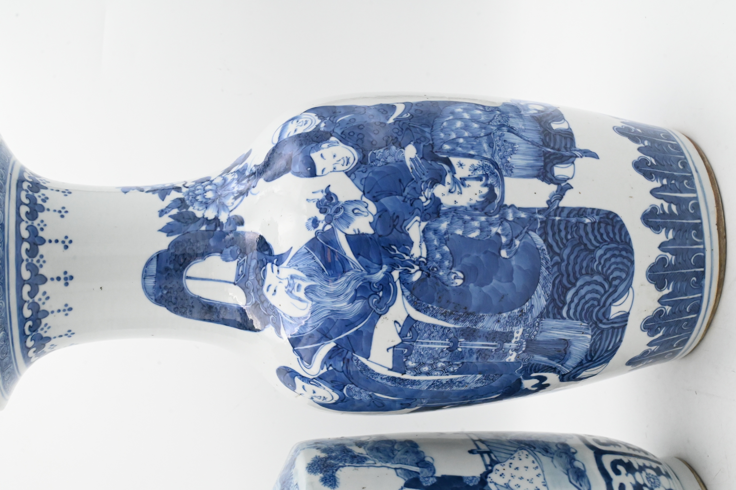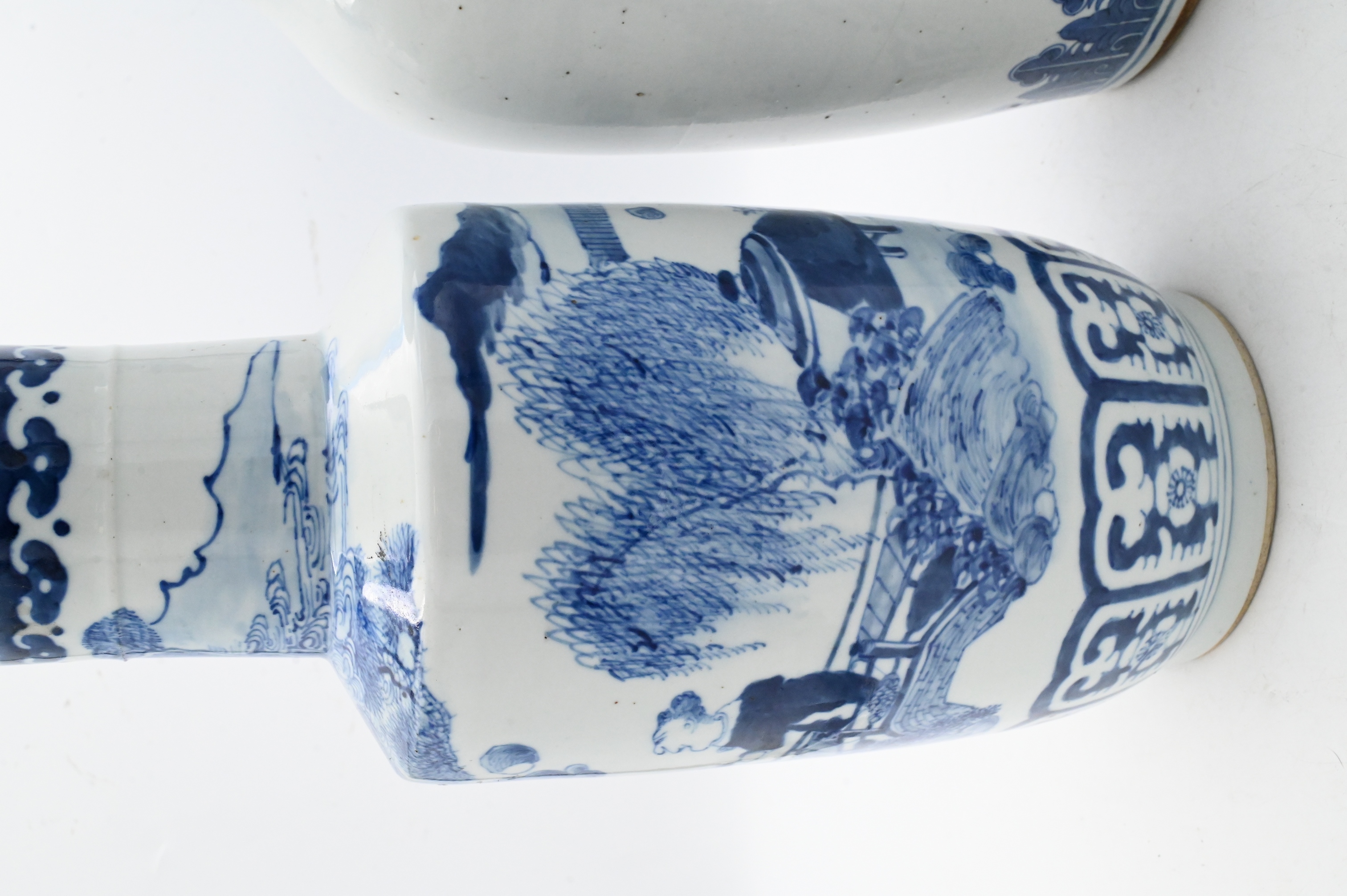 one rouleau vase painted with a continuous garden landscape scene with figures among willows and rocks, the other baluster form decorated with a figural courtly scene of scholars and attendants. Both with cobalt blue borders at the rim and foot.